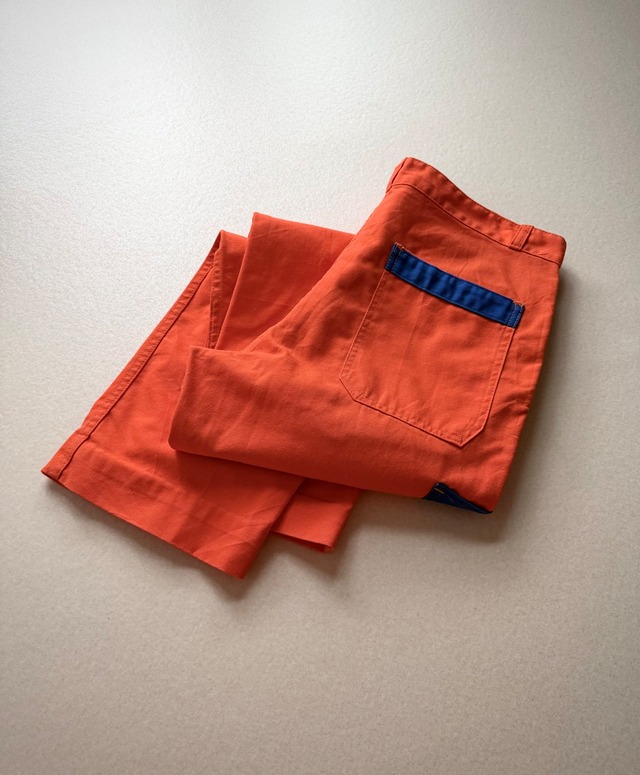 【 商品説明 】 80s〜 EURO VINTAGE TWO-TONE TWILL WORK PANTS OLD 。 ユーロビンテージの類に属するローカルファクトリーが製造したと考察できるTWO-TONE WORK PANTS,OLD VINTAGE 。 ペインターを彷彿とさせるツールポケットにバックサイドの片ポケやサイドスラッシュとユーロシリーズではお馴染みの定番デザイン、少しパリッとしたツイルベースにオレンジ×ブルーのカラーがマッチしたグッドデザインなワークパンツ。 そんなに古いモノではありませんが気兼ねなく着用できる万能なユーロワーク、お好きな方は是非この機会にいかがでしょうか。 商品名 : 80s〜 TWO-TONE WORK PANTS ブランド : UNKNOWN / EURO VINTAGE サイズ : 44 ※ 平置き実寸 ウエスト ー 45 レングス ー 77 裾幅 ー 23 総丈 ー 104 ※ 多少の誤差はご了承下さい 素材 : COTTON 65% POLYESTER 35% 【 商品の状態 】 USED.ビンテージならではの多少使用感,裾.膝付近に黒ズミ.薄汚れが少し見受けられますが、その他,着用に支障のある目立つような汚れや大きなダメージは見受けられません。 古着,ビンテージ慣れされている方であれば問題無い程度、まだまだ充分着用していただけると思います。