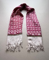 比較的長さや幅のあるサイズで巻いた時のボリューム感も良く赤白のカラーリングやフリンジのバランスも相俟って上品な佇まいとなっております。