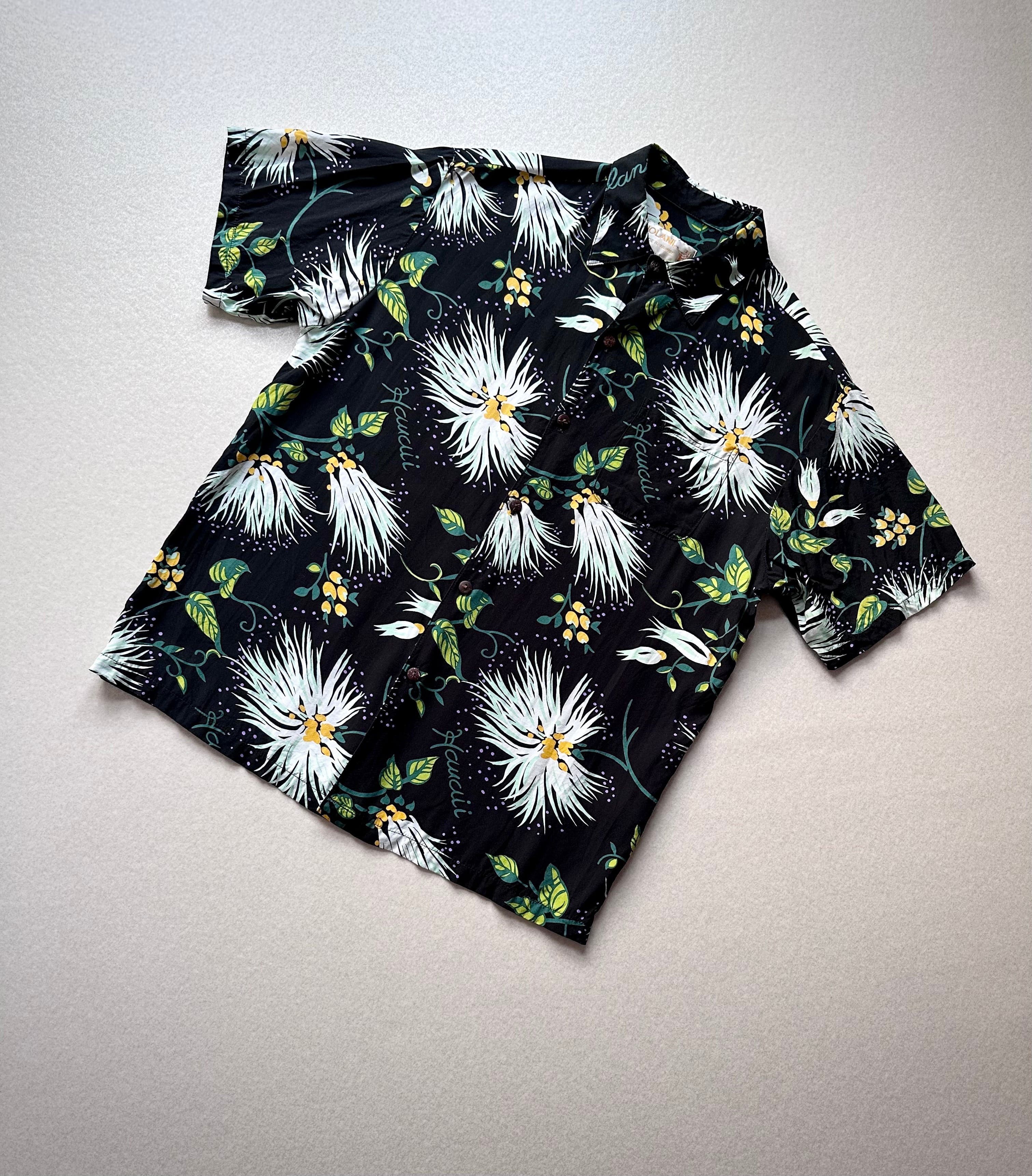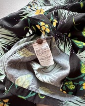 クールな印象のブラックをベースにホワイトのお花がアクセントになりフジエットの素材感も相俟って50sのような雰囲気を纏ったグッドなトロピカルパターン、当時の雰囲気を味わいながらも気兼ねなく着用できるデザインの良い1枚、お好きな方は是非この機会にいかがでしょうか。