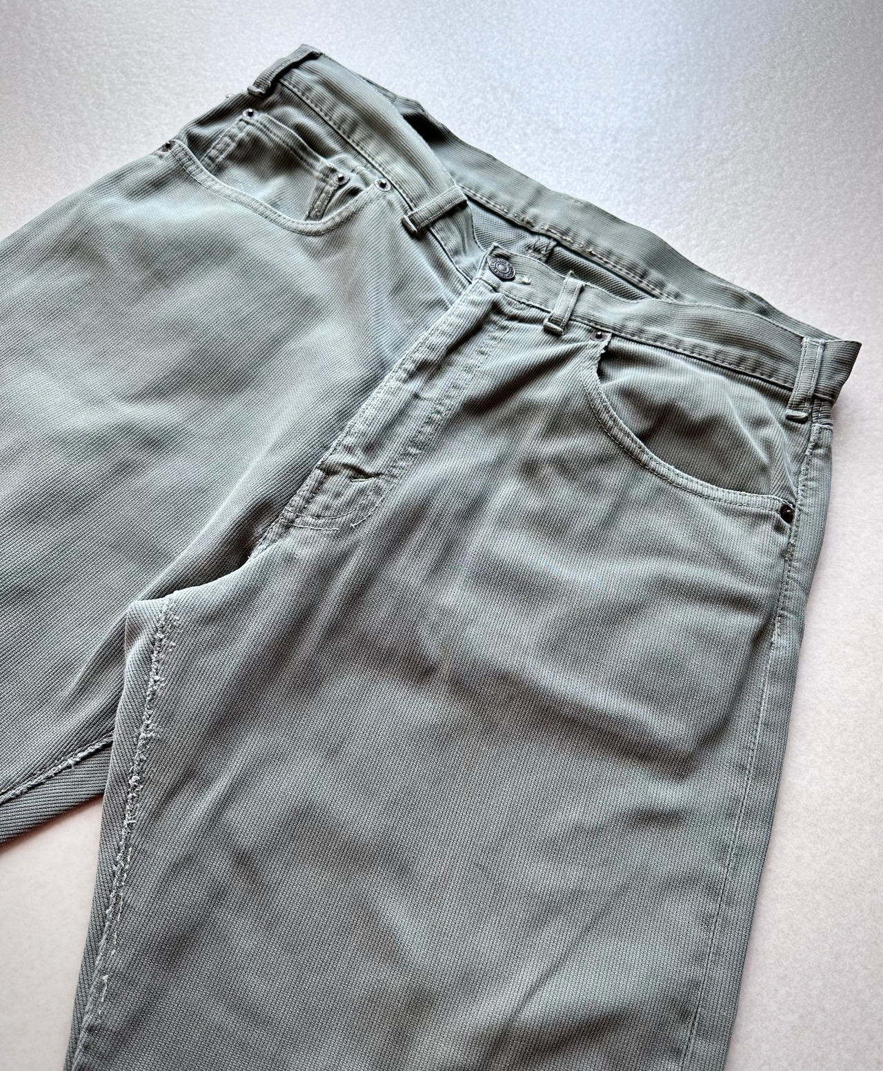少し硬さのある紙パッチやボタン裏のF刻印に均等VビッグE、ジップは42タロンにフロントVステッチ,ウエストシングル等々と初期ならではの魅力的なディテール。