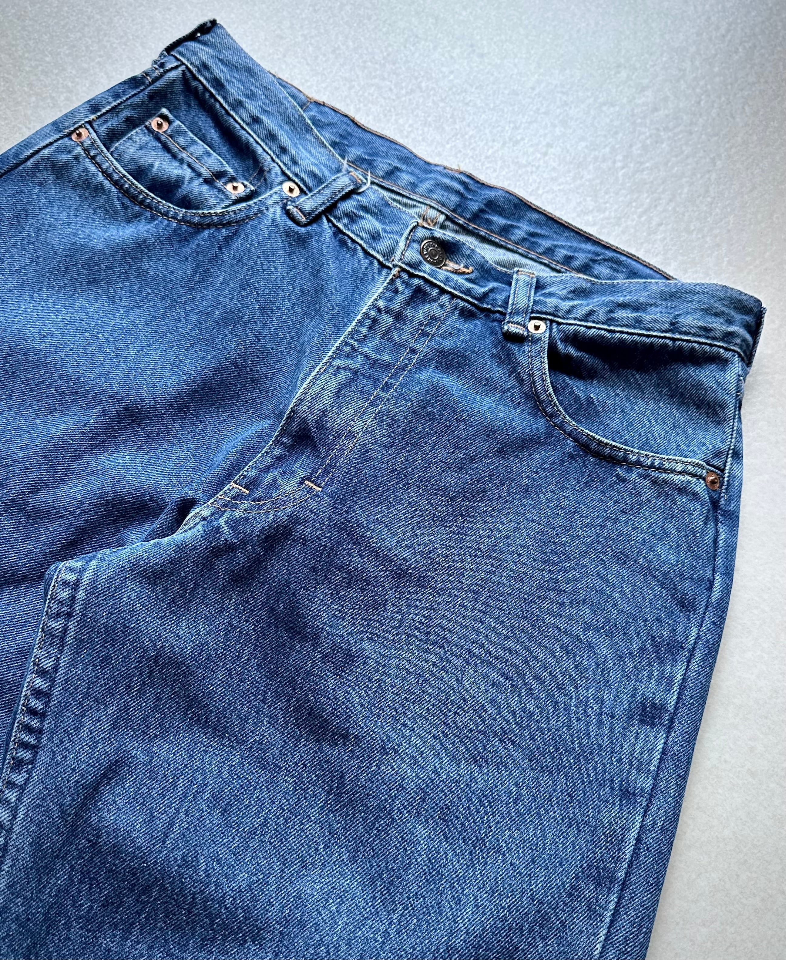 特徴的な分厚い革パッチにバックポケットのサークル調ウエスタンステッチ、少しタイトなストレートシルエットで505のような雰囲気も良く気兼ねなく着用できるスッキリとした爽やかなビンテージデニム。