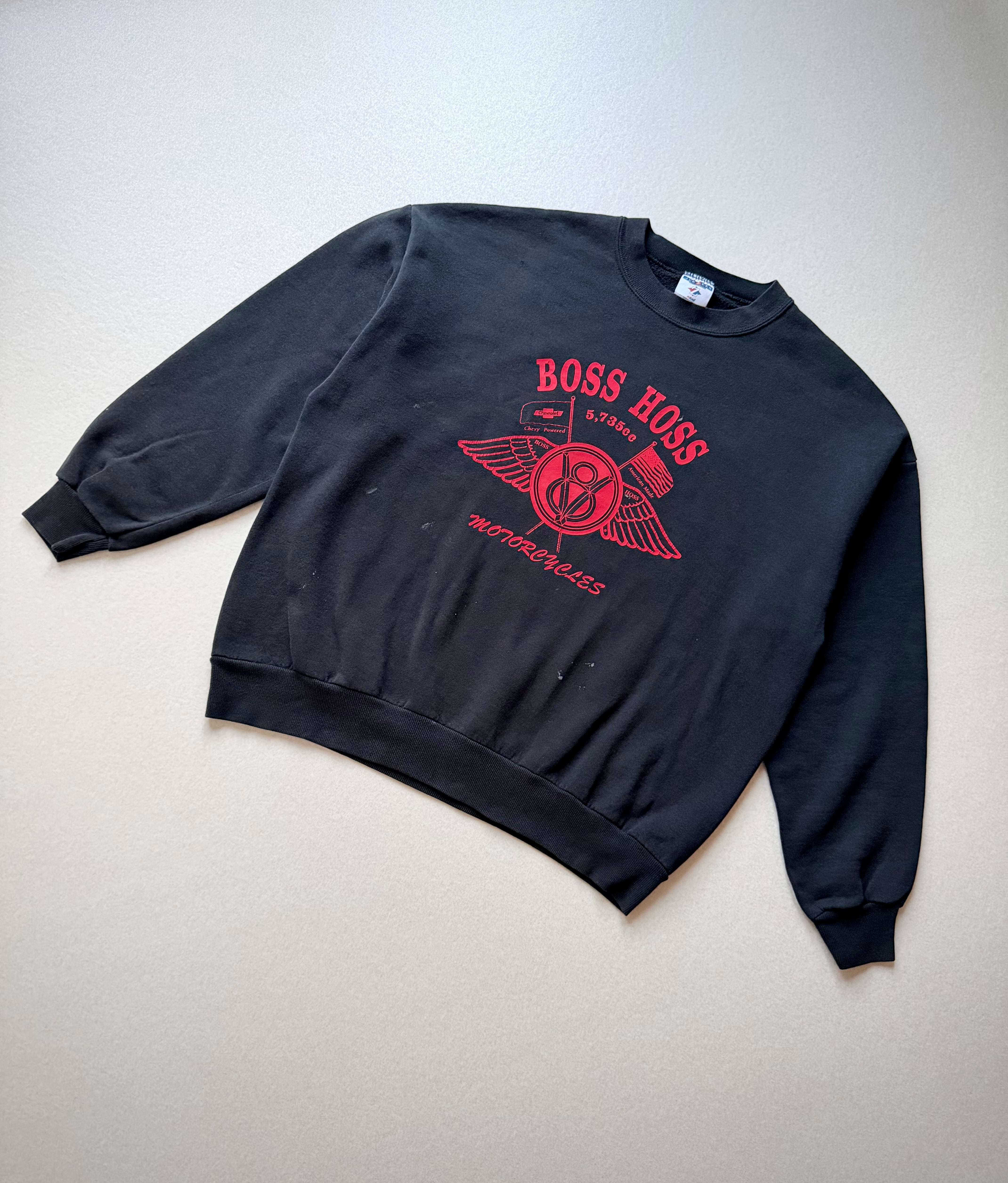 90s USA製 “ BOSS HOSS ” MOTORCYCLES W-PRINT SWEATSHIRT OLD VINTAGE アメリカ製 ボスホス モーターサイクル ダブルプリント スウェット オールド ビンテージ
