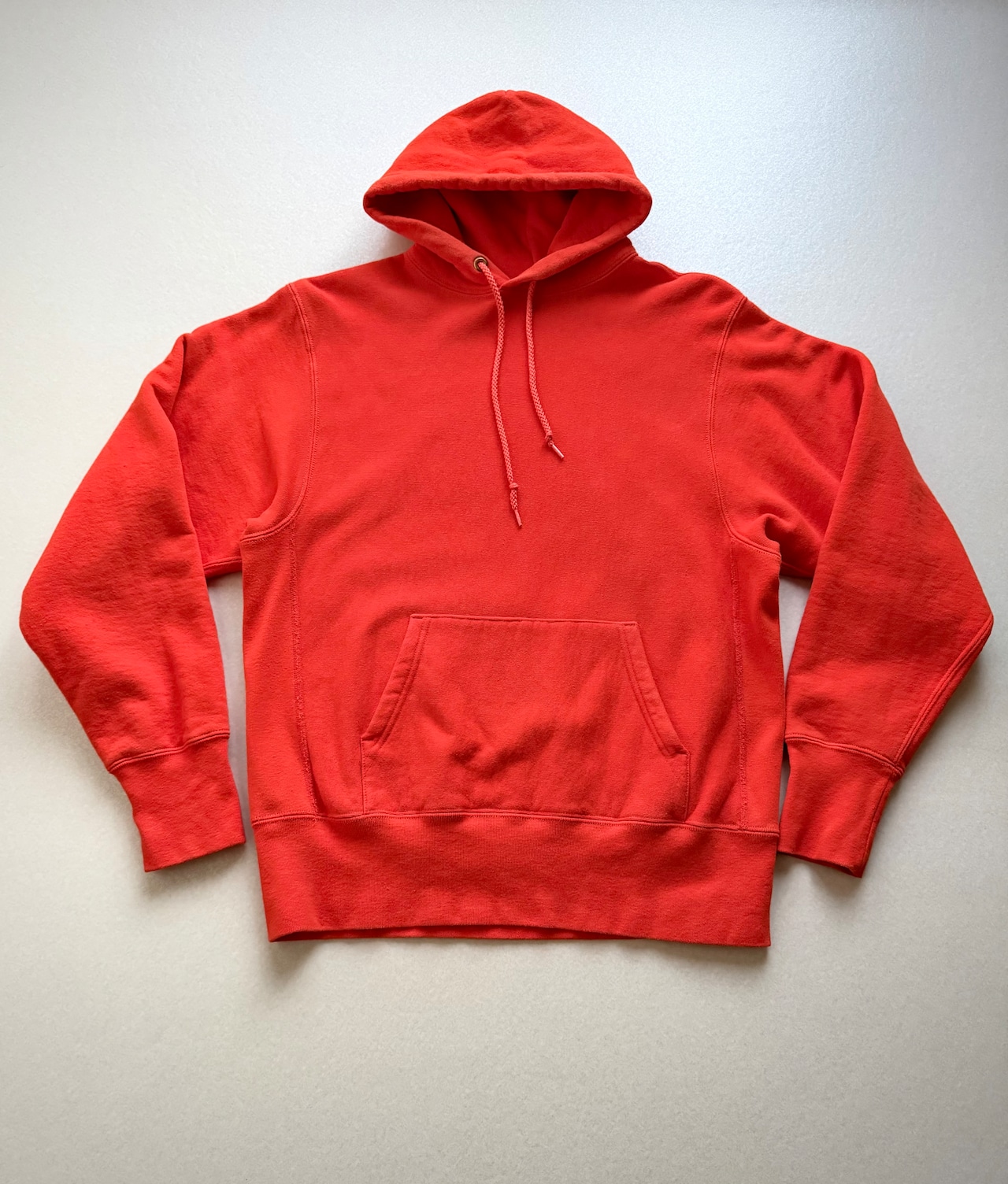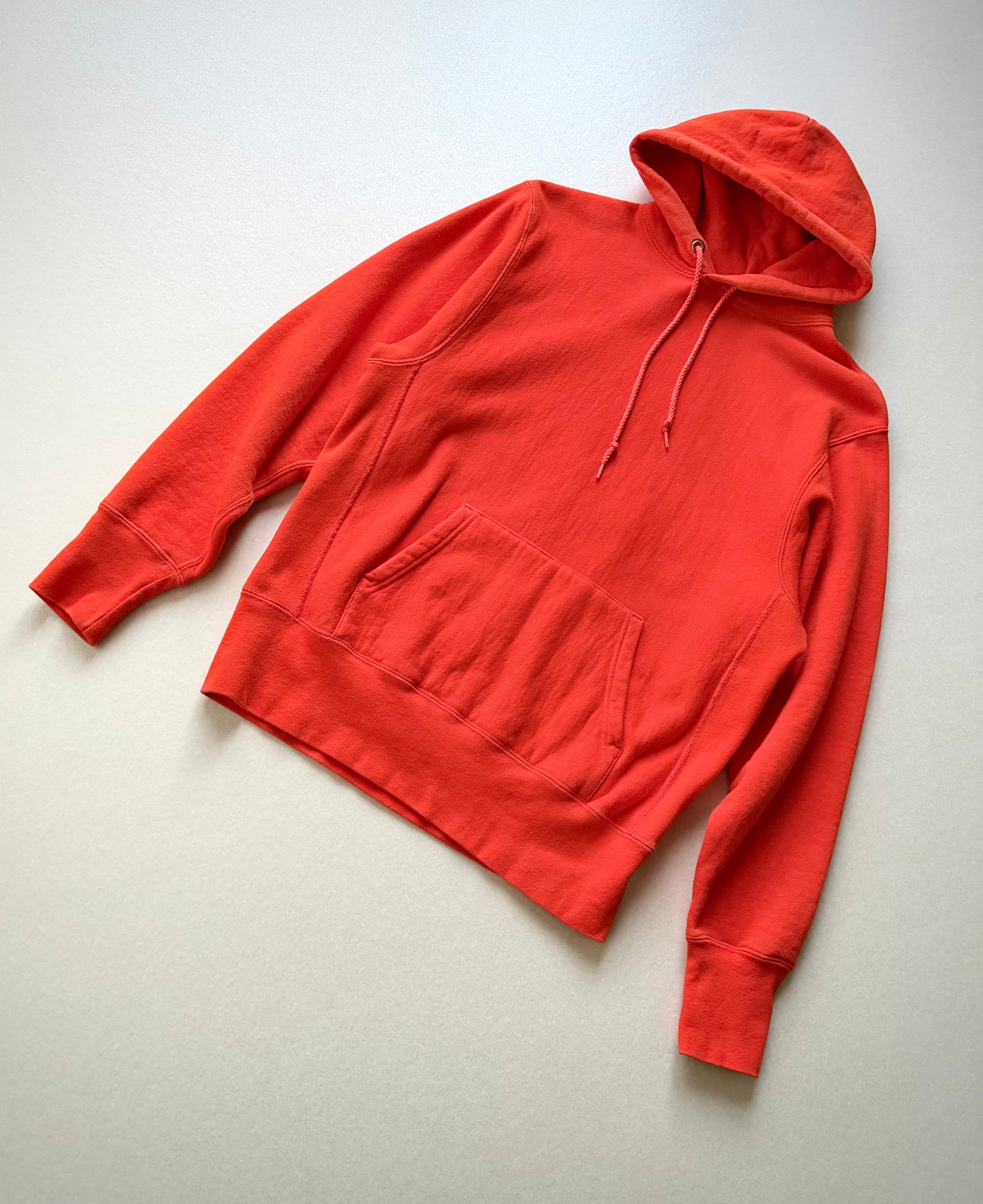いかにもアメリカらしいしっかりとした厚みのあるHEAVY WEIGHT生地を使用した定番プルオーバーパーカー、お馴染みのサーマル張りではなくシングルのフリース仕立て裏起毛とシンプルな印象に発色の良いオレンジカラーが魅力的な究極の定番アイテム。