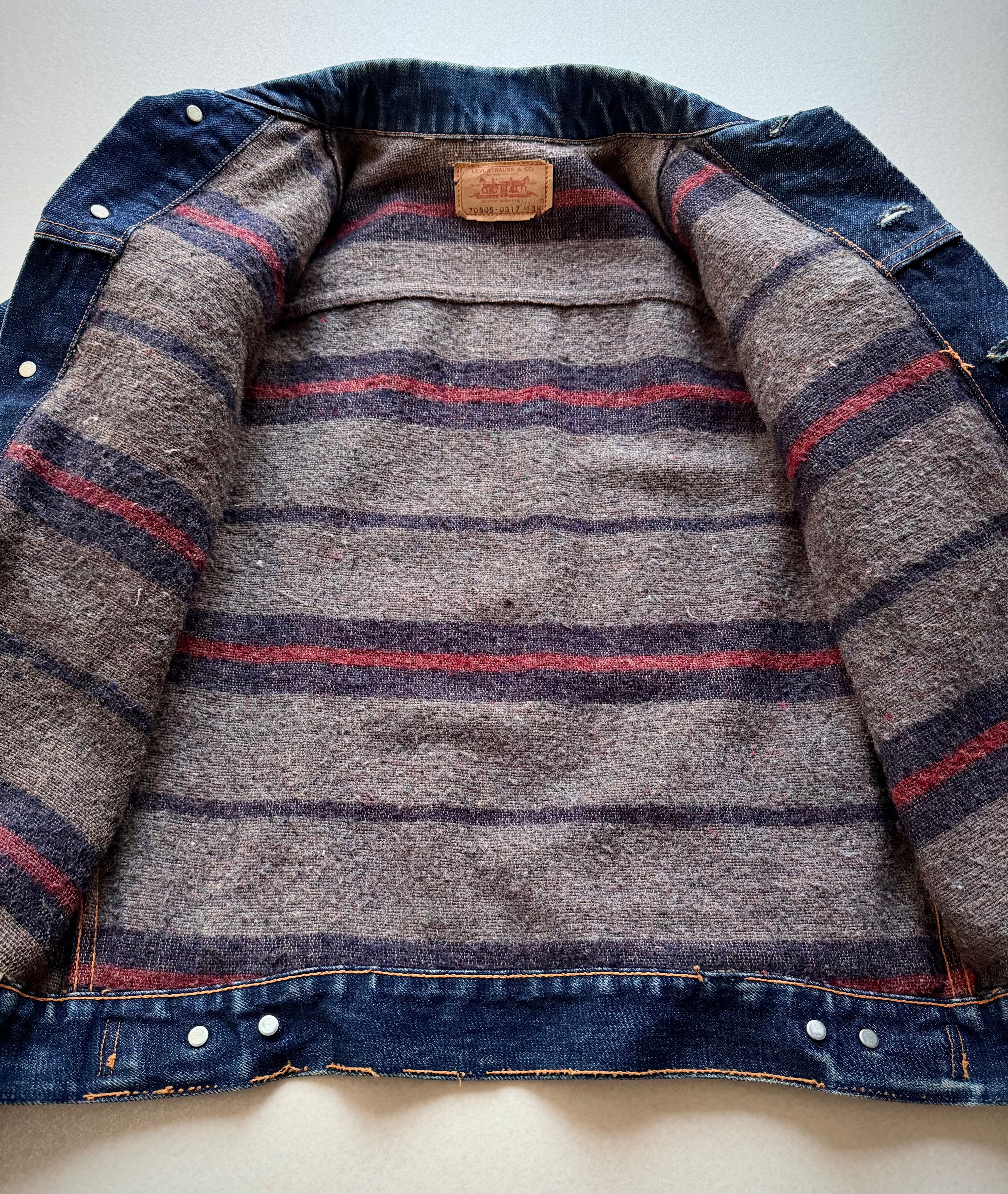 少し硬さが残るお馴染みの横長紙パッチに不均等のビッグEタブ、ボタン裏は無刻印にブランケットライナーが付いたVINTAGEならではのディティールも魅力的な非常に雰囲気の良いデニムジャケット。