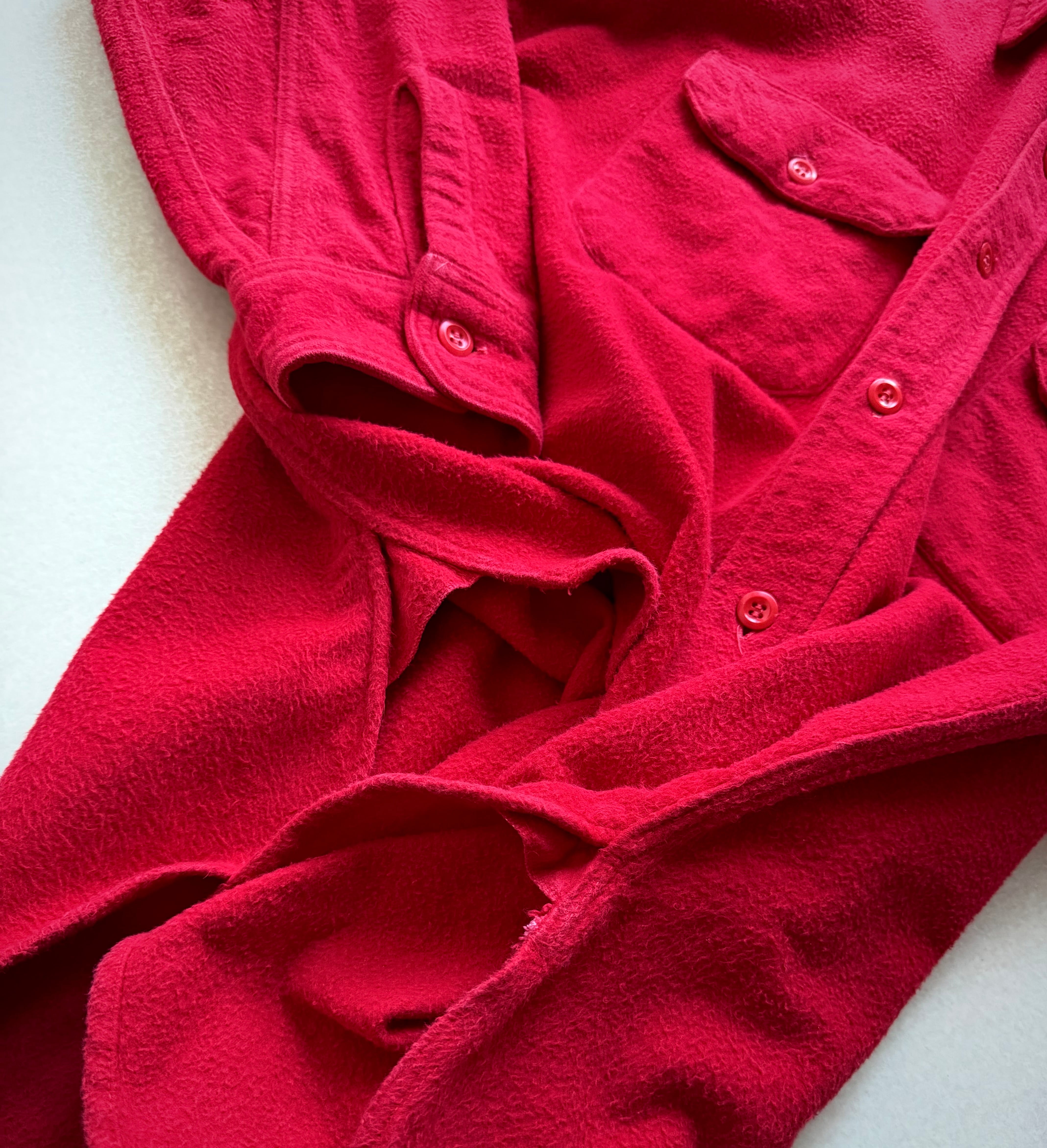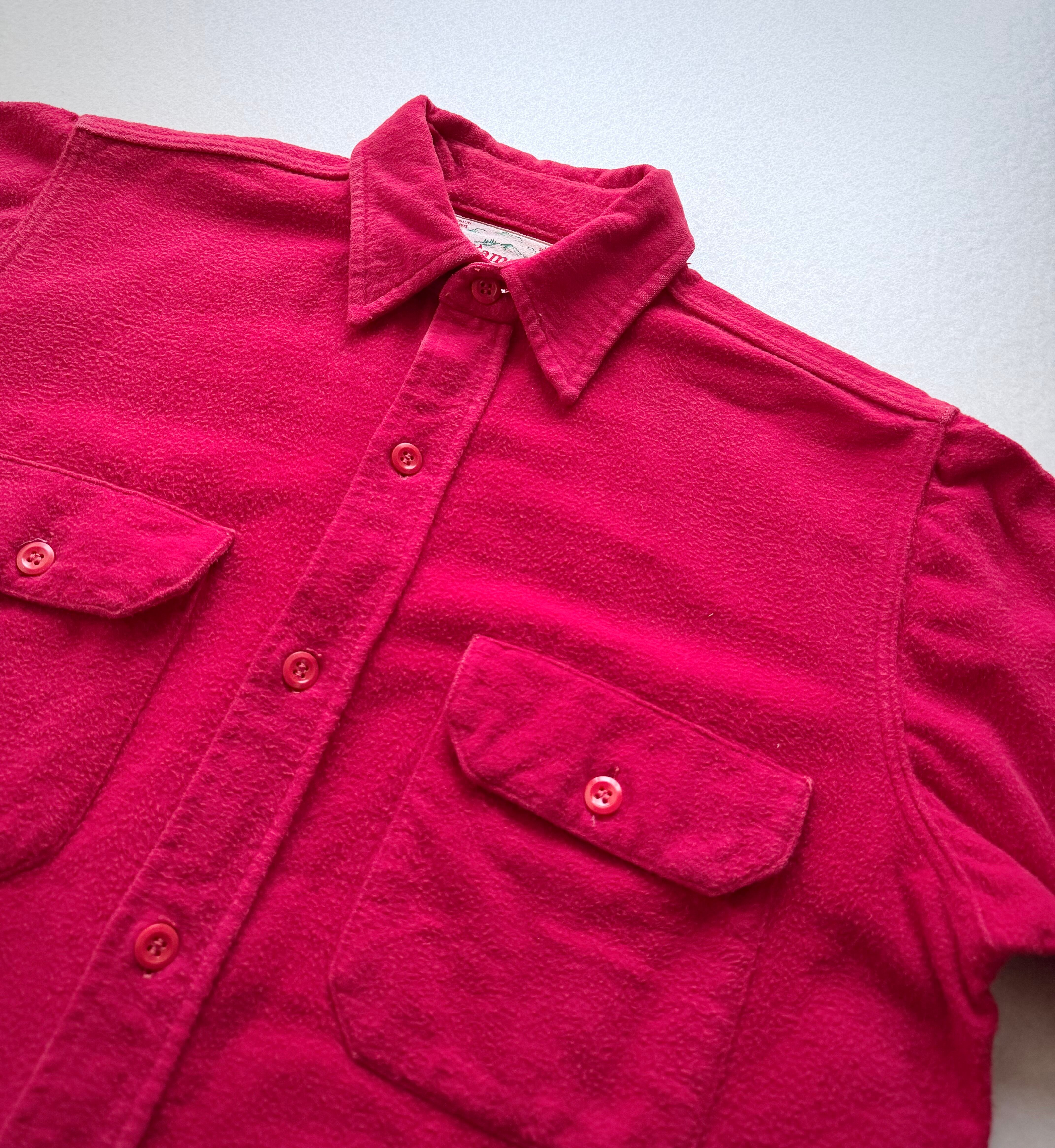 しっかりとした厚手のオールコットン生地は毛羽や起毛感が特徴的な保温性の高いシャモアクロスを使用し、フロントのフラップポケットやダブルステッチ,両サイドのマチと古さを感じるディテールに当時のタグが付いた嬉しいVINTAGE。