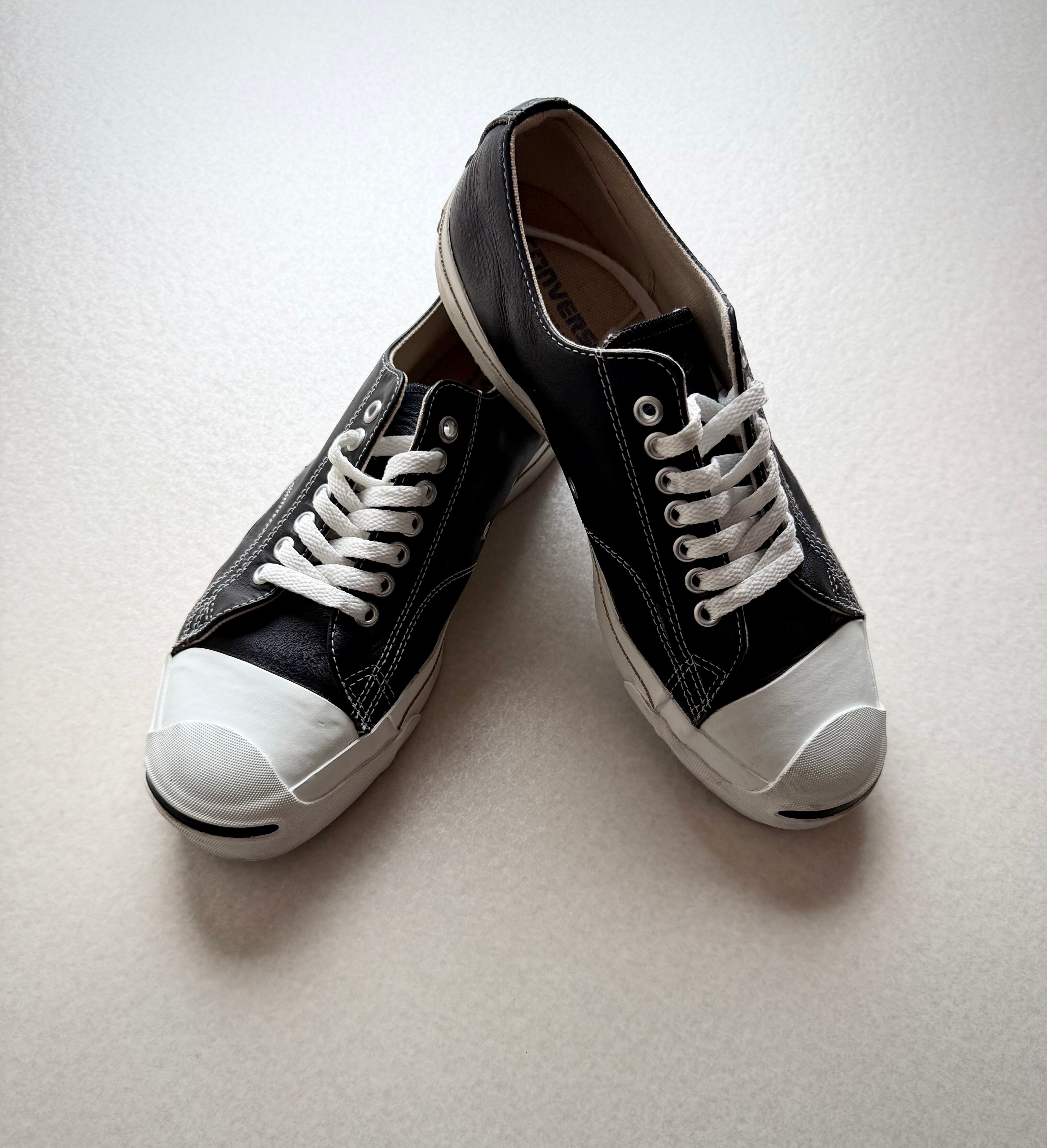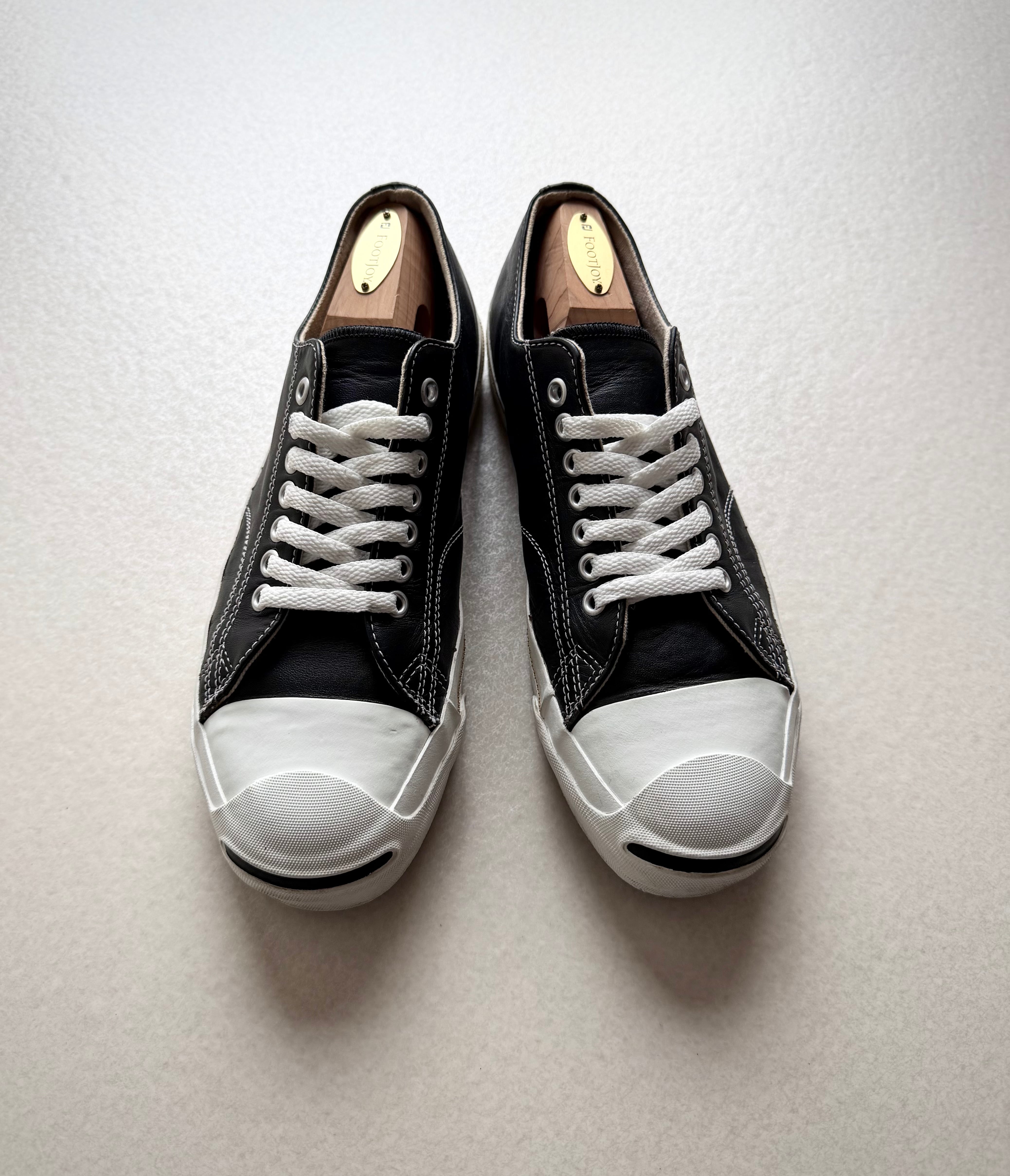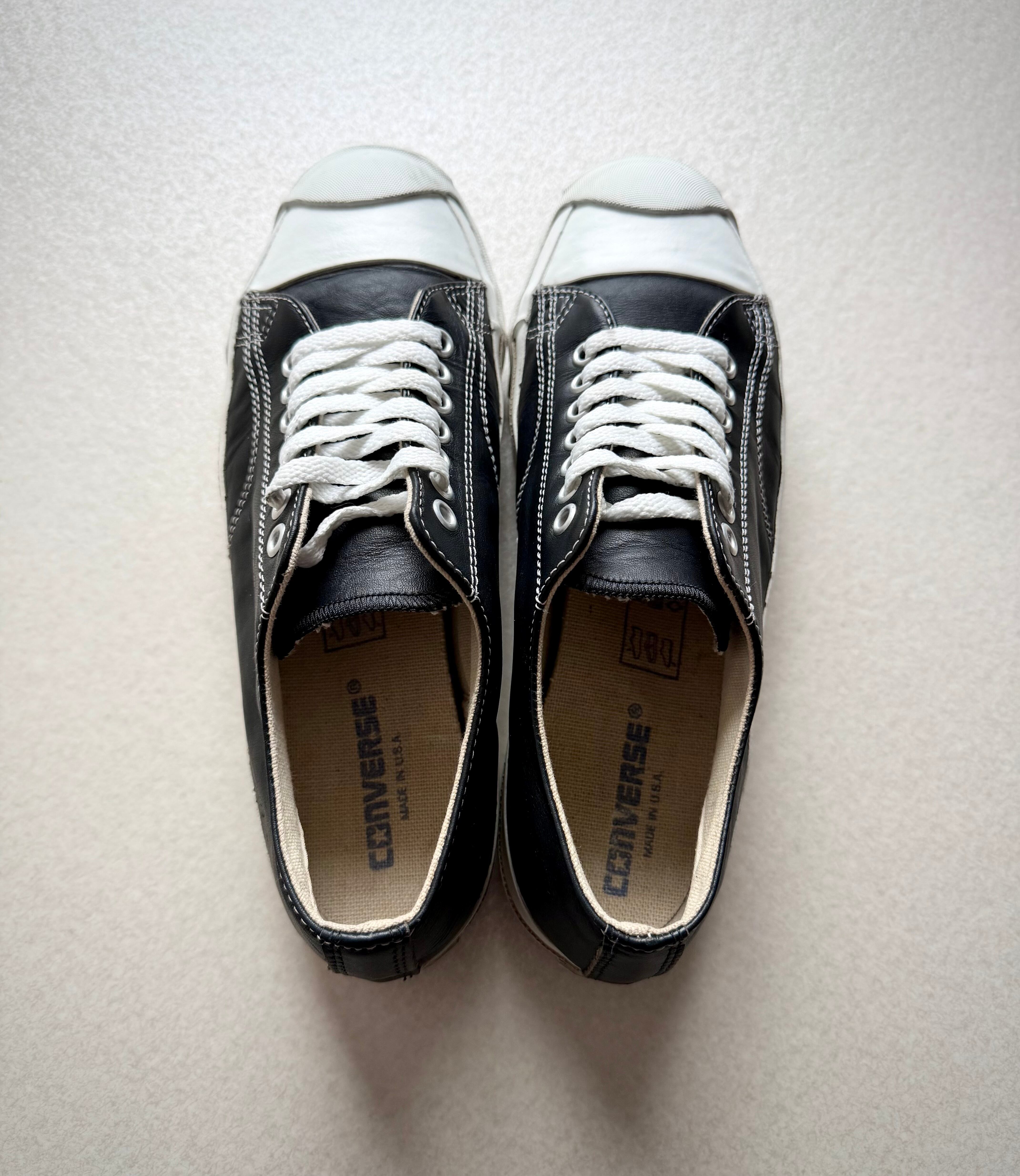 年代により様々なディテール変更があるALL STARと比べて僅かな変更のみで大幅なモデルチェンジがされていないのも魅力的な《JACK PURCELL》、ご存知の方も多いと思いますが過去には“カート・コバーン”が愛用していた事もあり現在に至っても絶大な人気を誇るレザーを纏ったブラックタイプ。