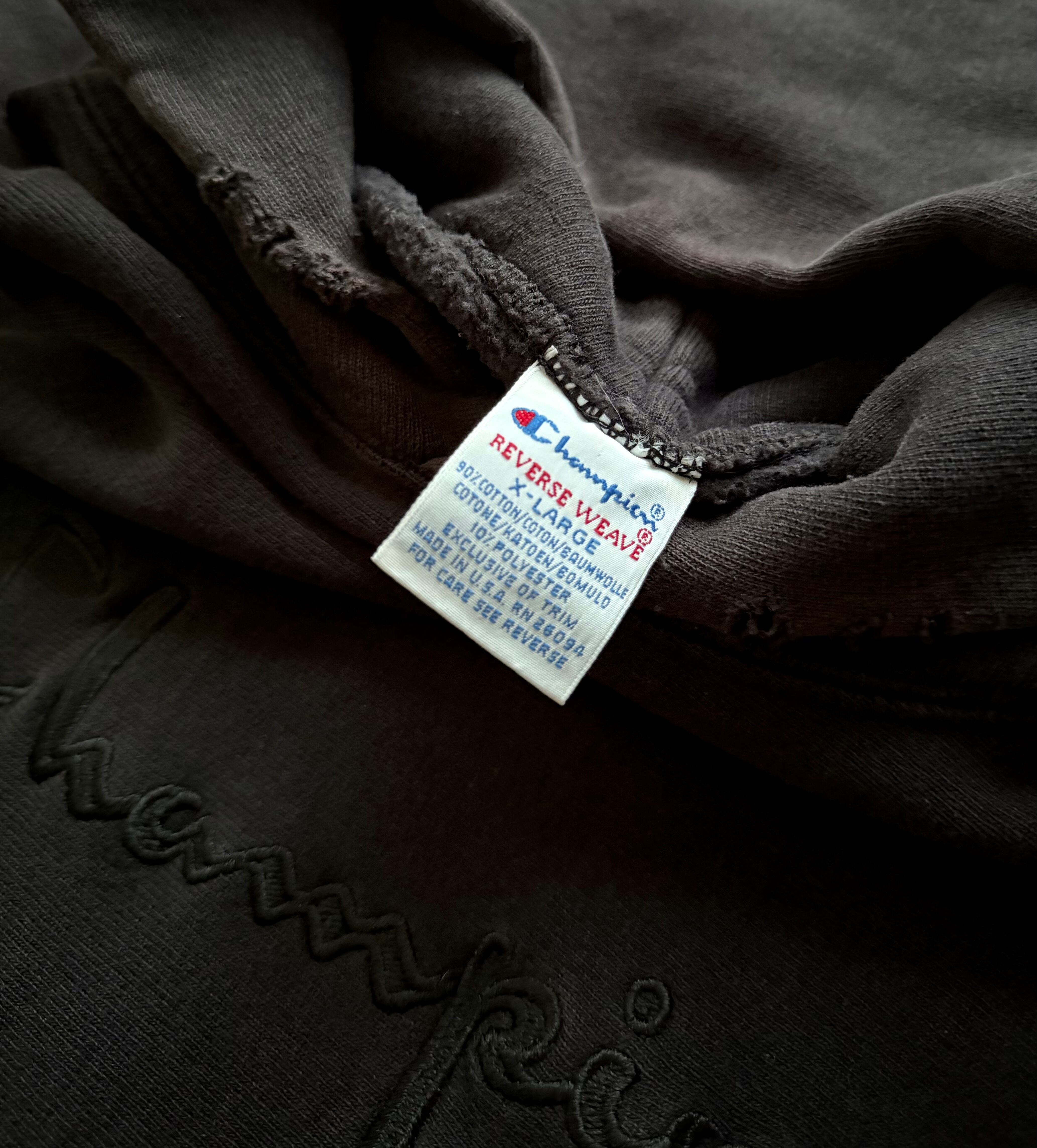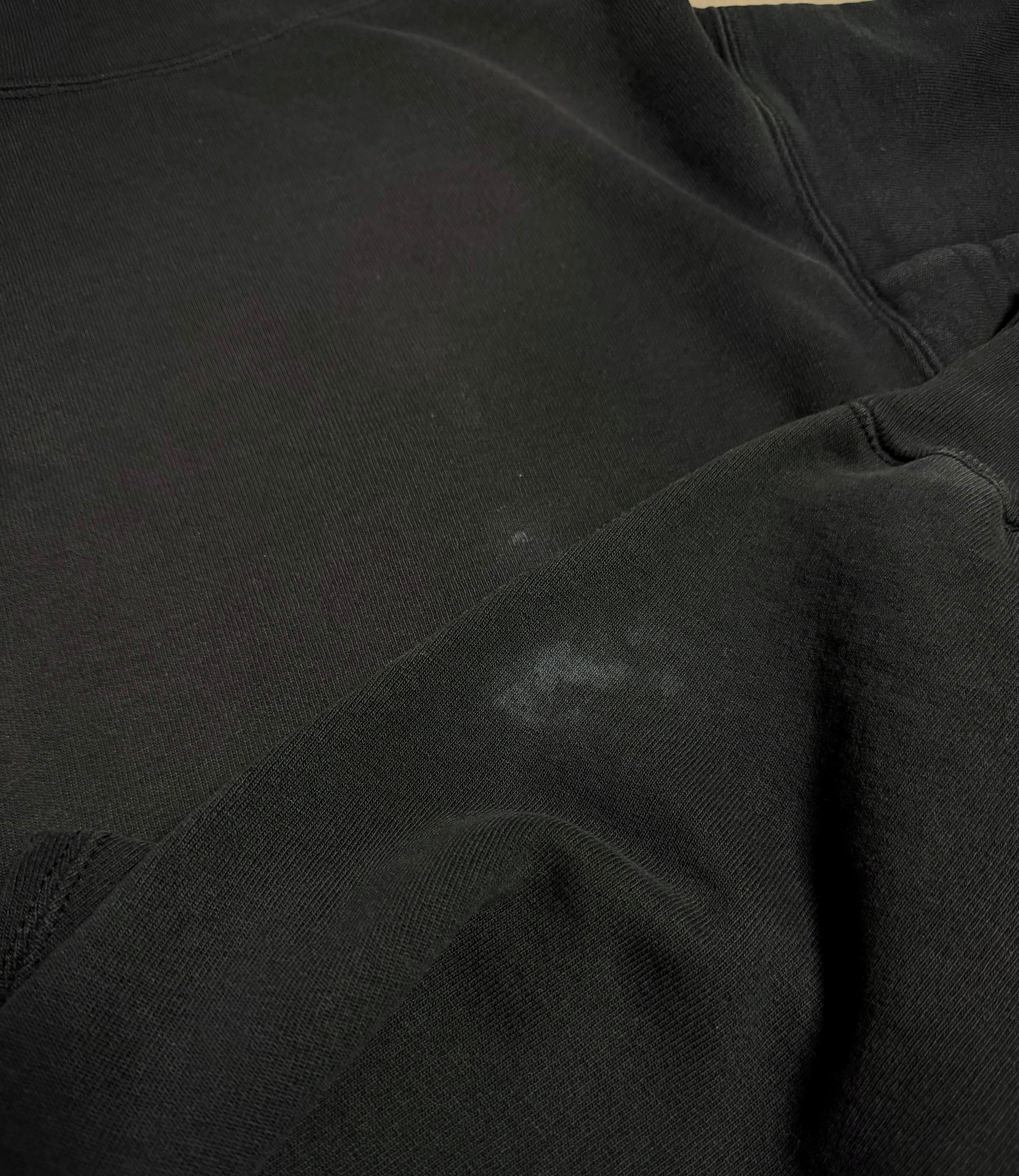 首元にはお馴染みホワイト×ブルー×レッドカラーにてデザインされた90s刺繍タグ期のビンテージオリジナル、“REVERSE WEAVE”としては非常にレアなオールブラックのスクリプトビッグロゴバージョン。