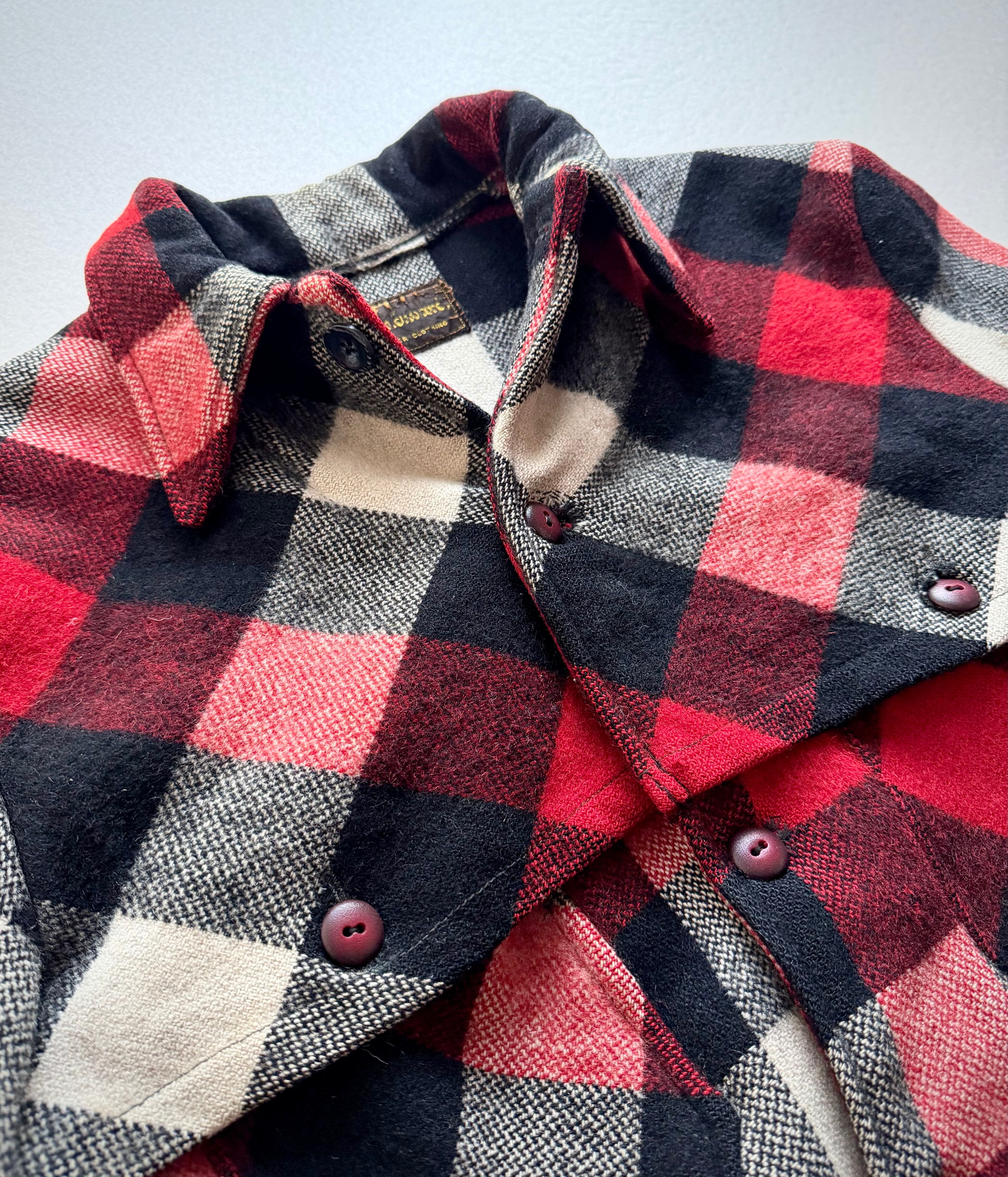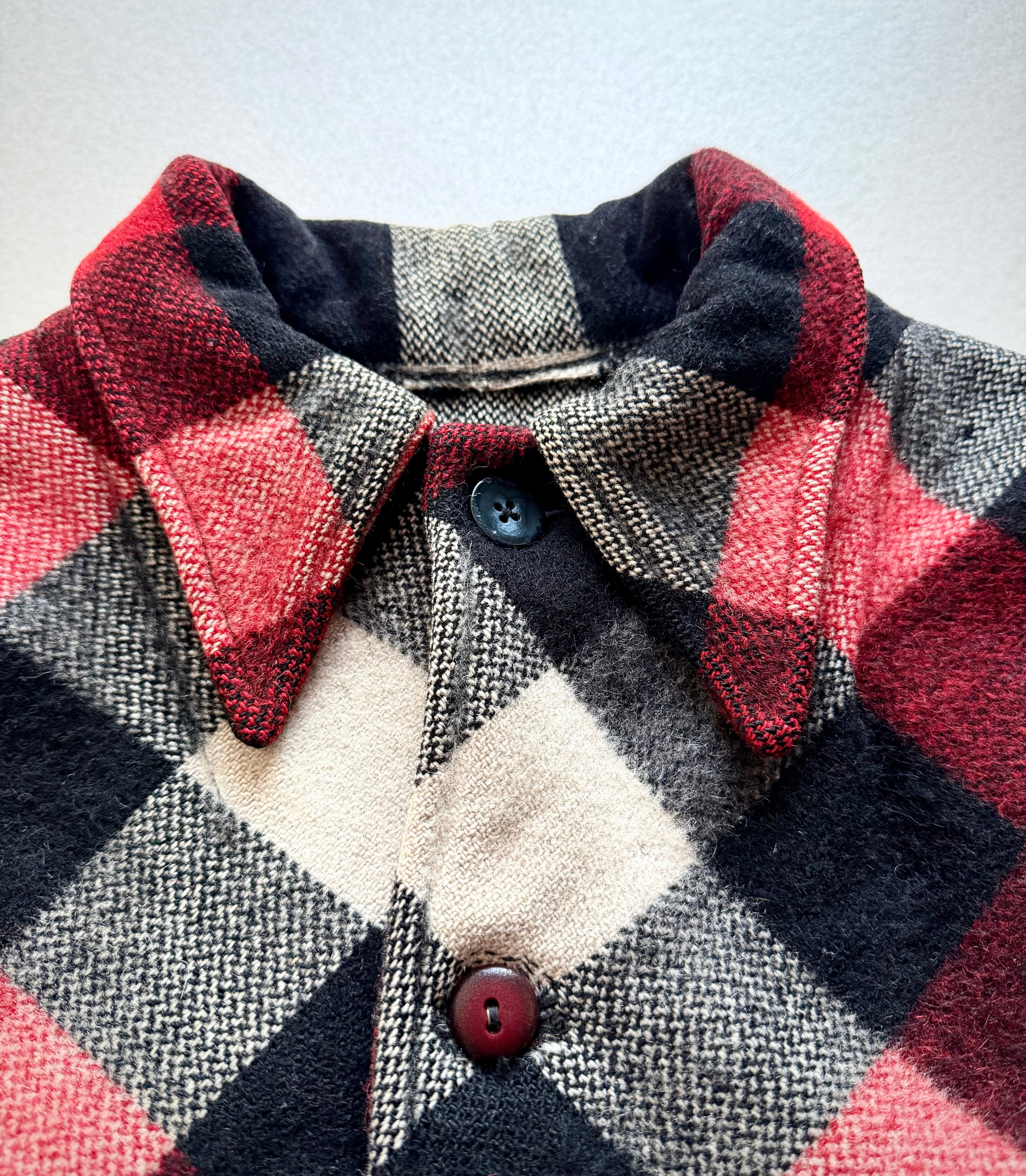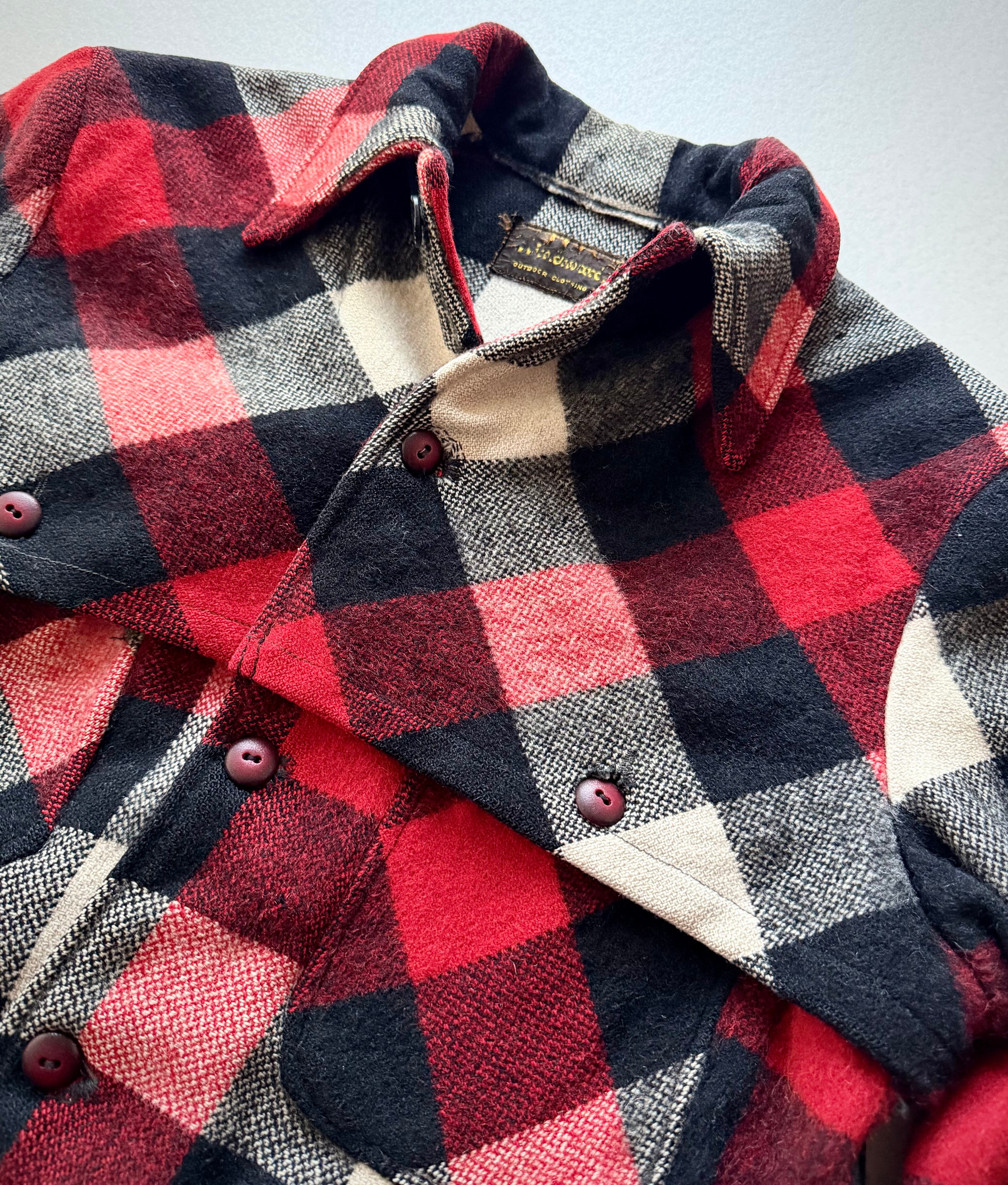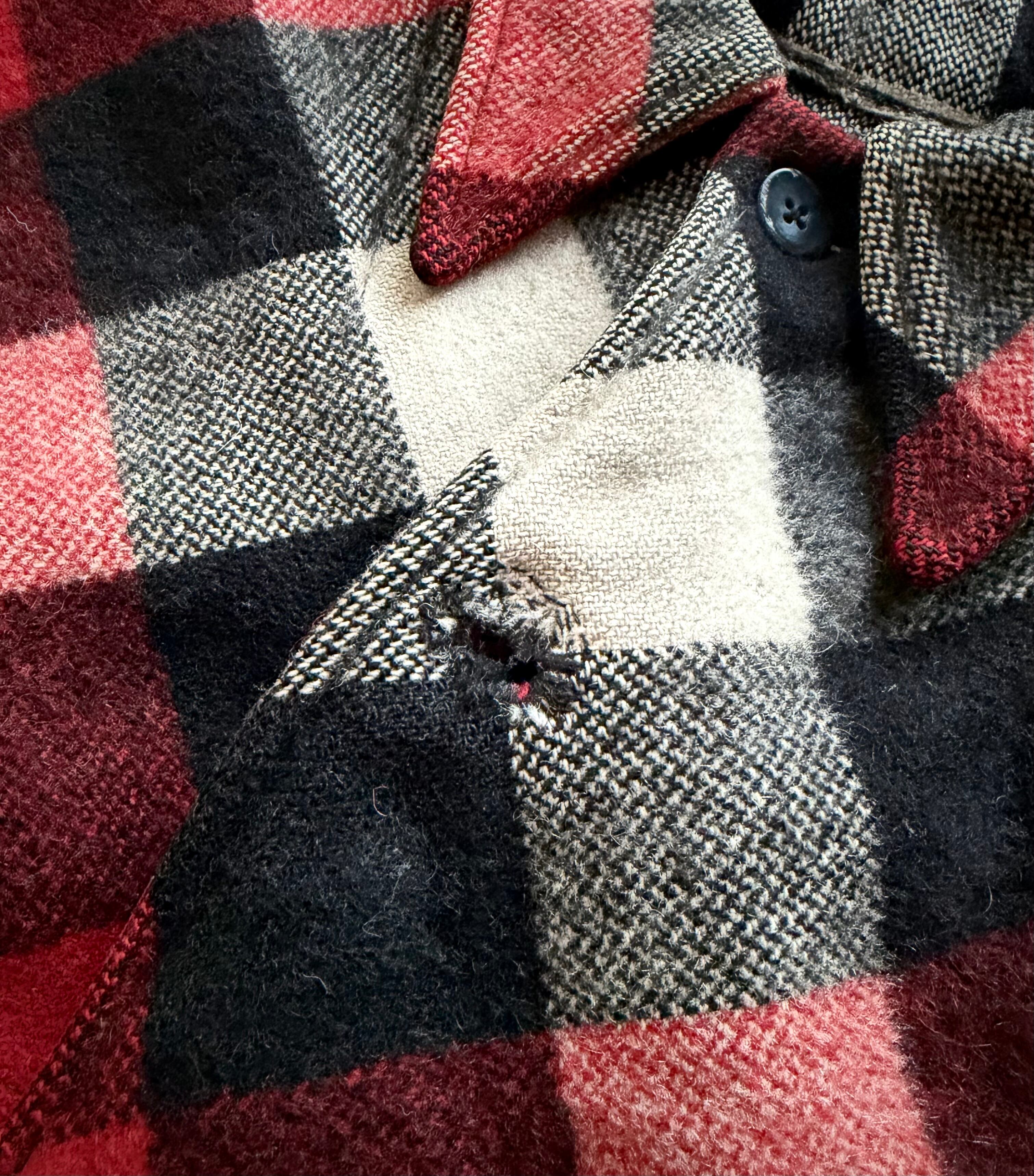 狩猟時の視認性向上の為に考案された伝統ある赤白黒のバッファローチェックに肩から背中にかけて生地が二重に補強されたダブルマッキーと高い保温.防風.耐久性を持つヘビーデューティーなウールジャケット。