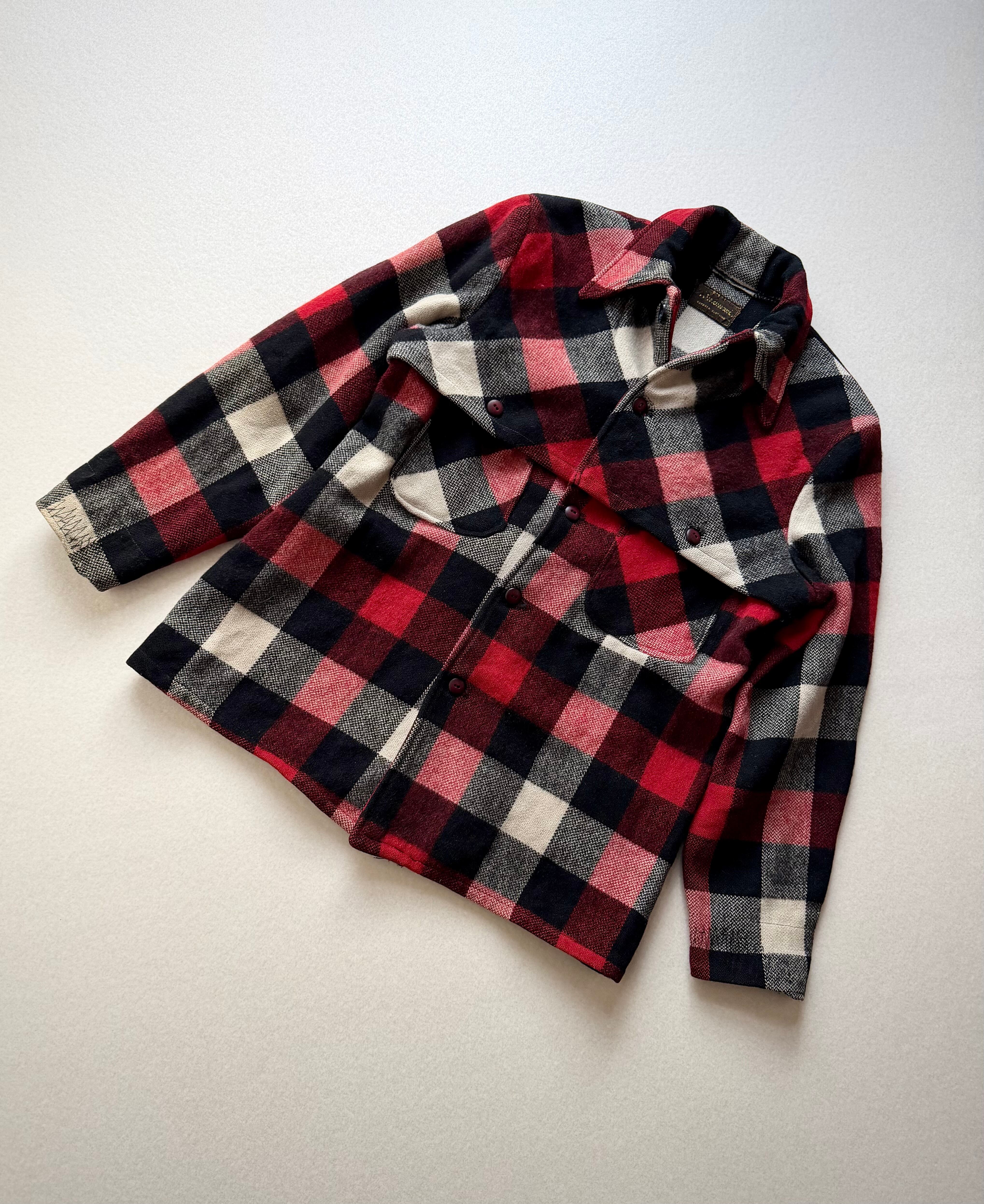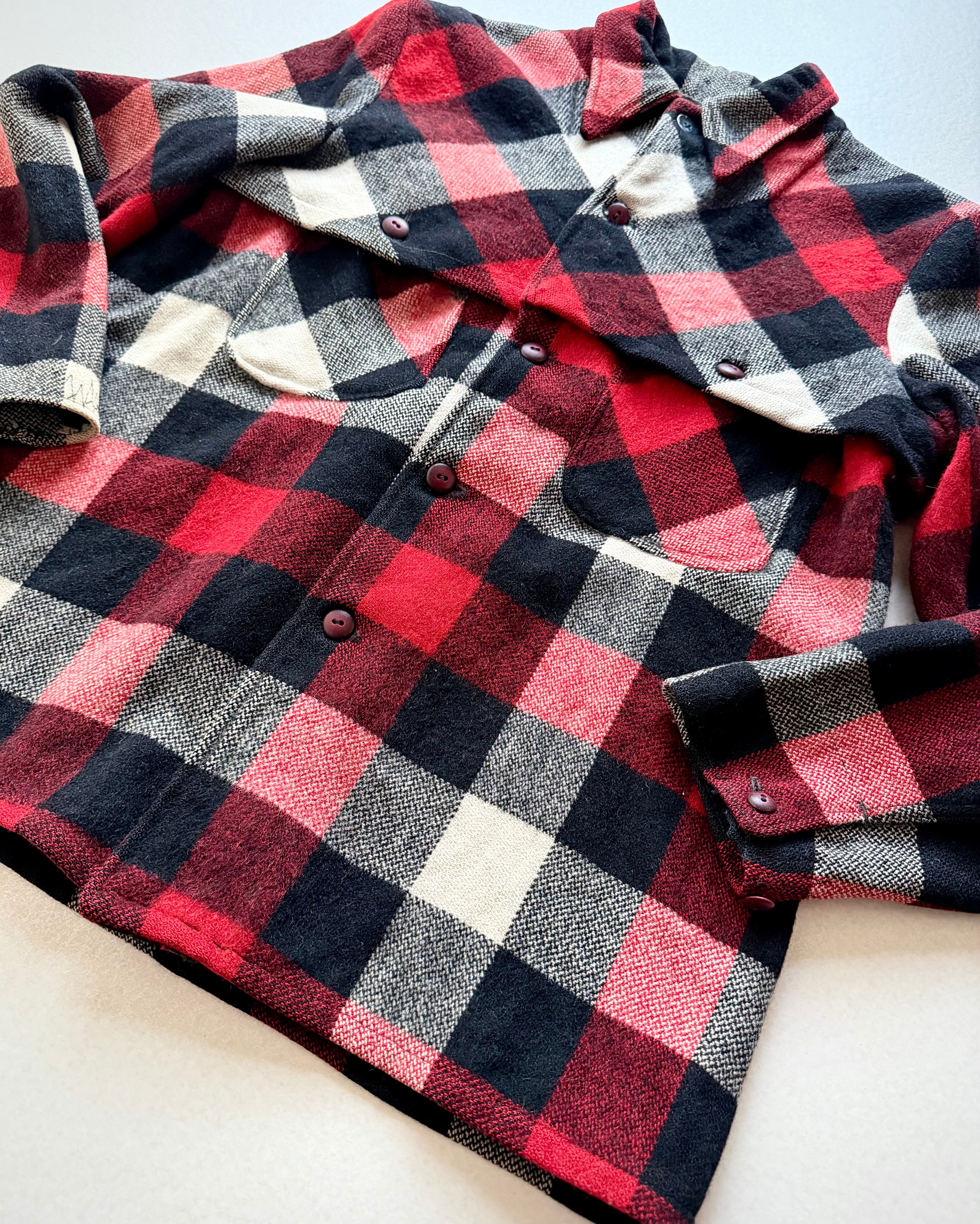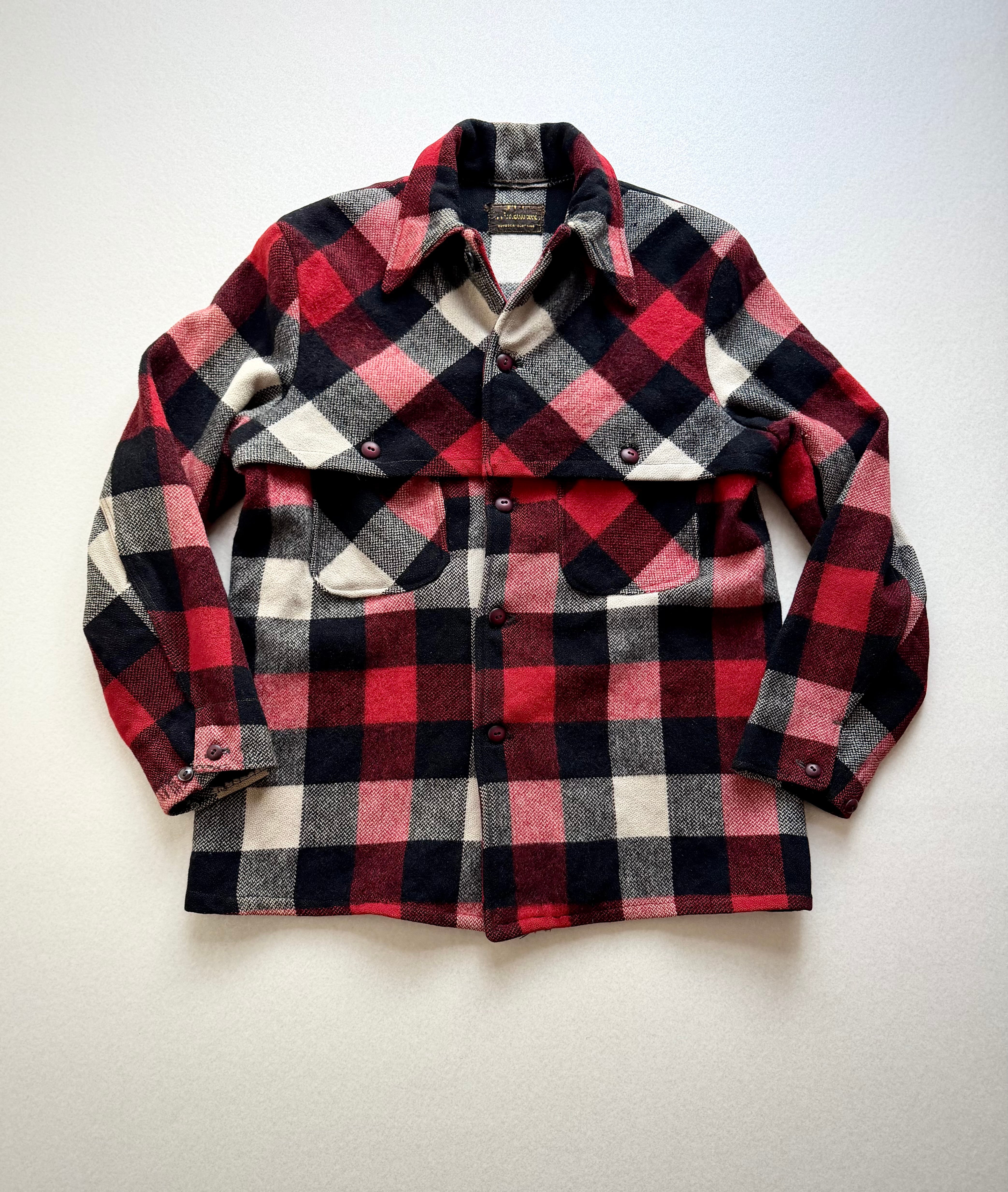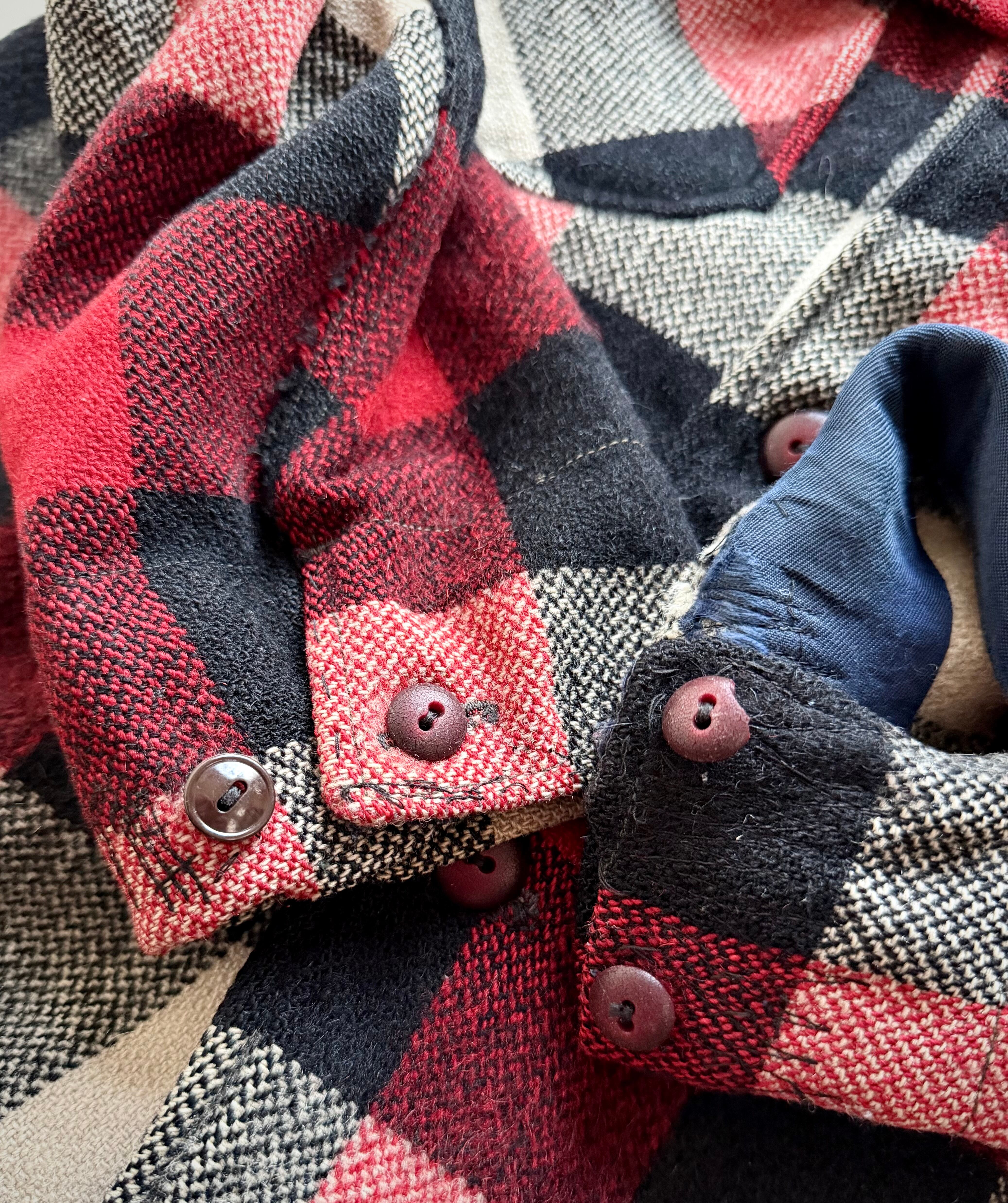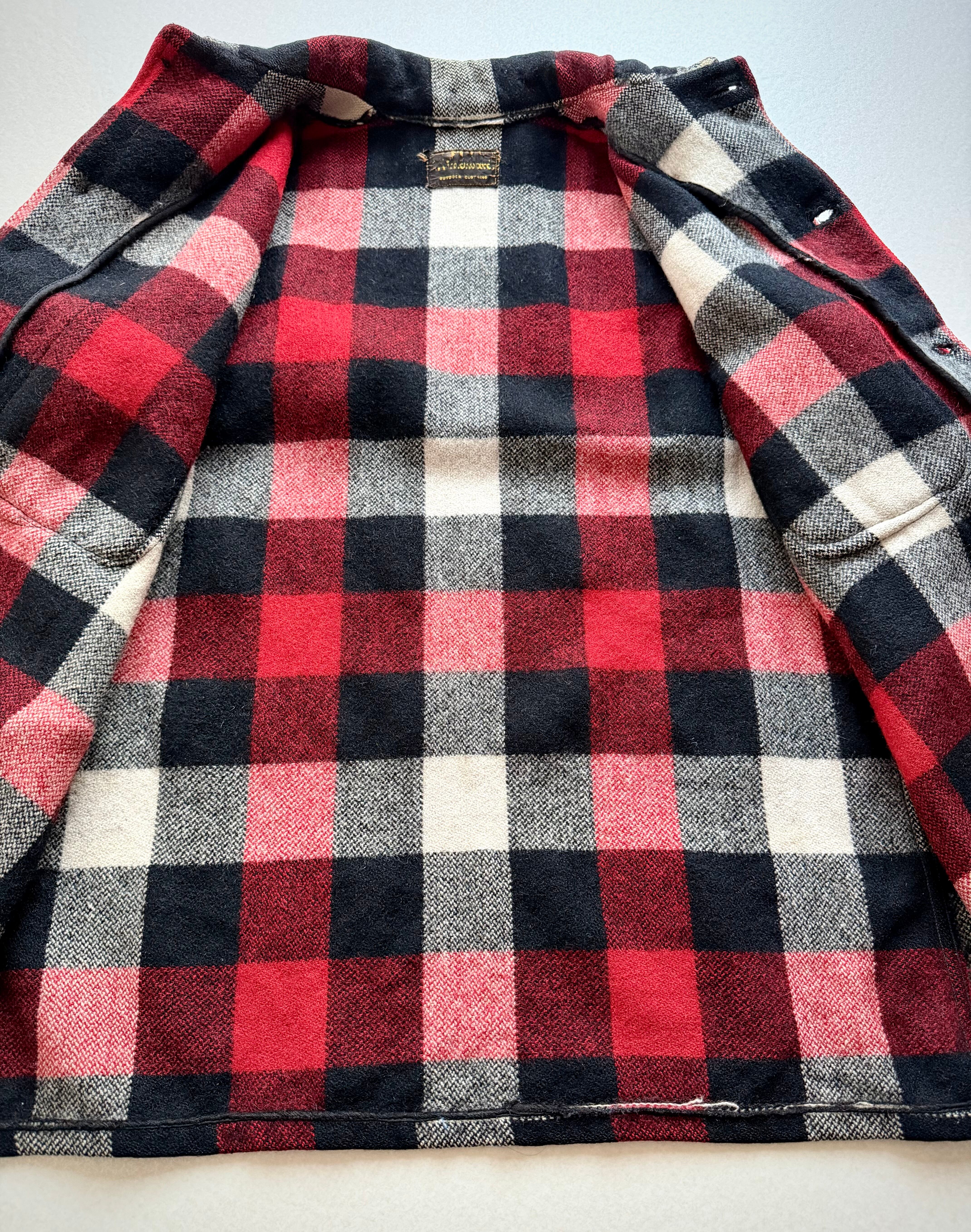 狩猟時の視認性向上の為に考案された伝統ある赤白黒のバッファローチェックに肩から背中にかけて生地が二重に補強されたダブルマッキーと高い保温.防風.耐久性を持つヘビーデューティーなウールジャケット。