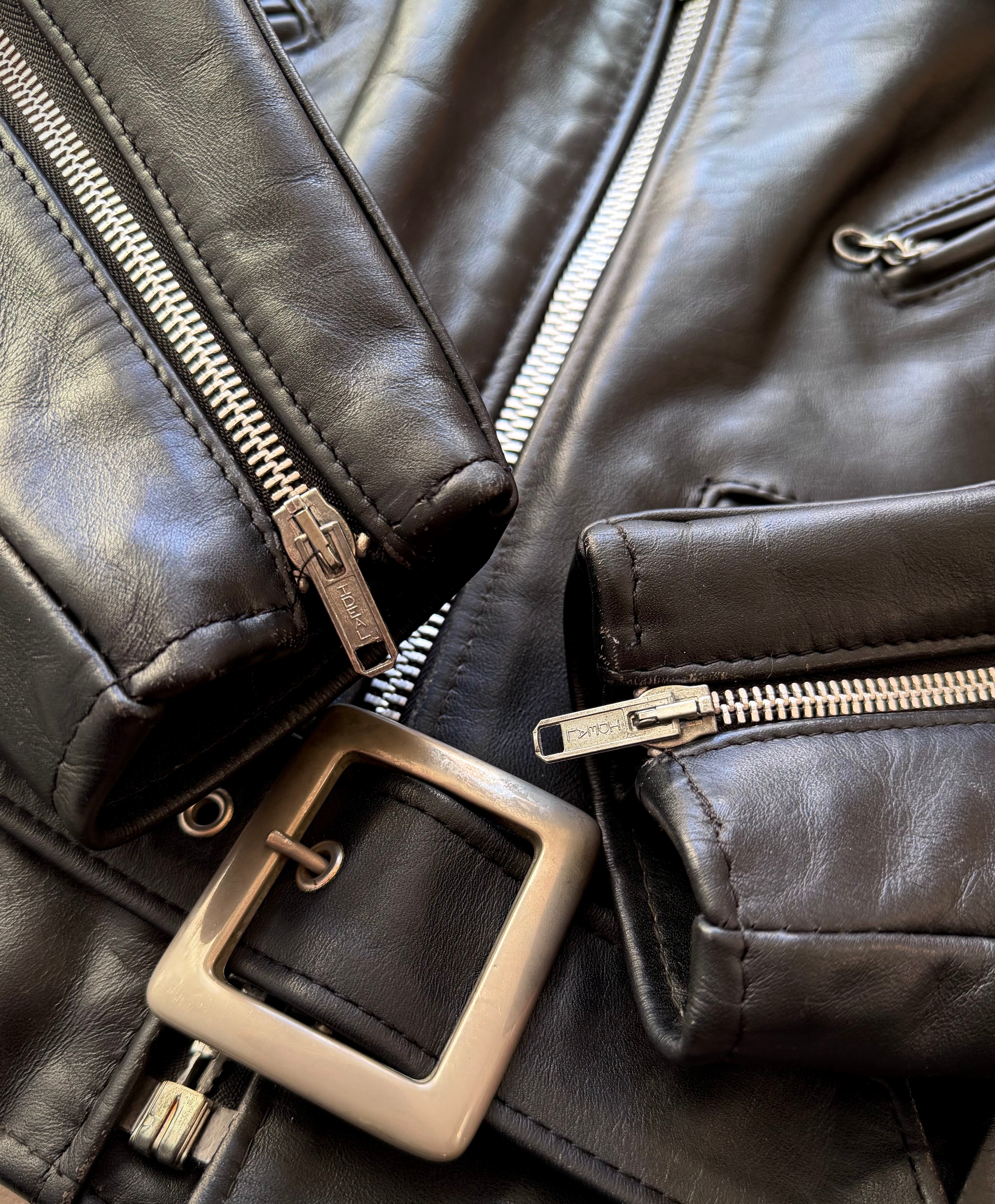 上質でハリコシがあり非常にしっかりとした質感の本革ステアハイド仕立て、フロントTALONジッパーや袖先IDEAL,牛タグ等のディテールも良くアメリカンライダースを代表する正にホンモノと呼ぶに相応しい質実剛健な逸品ジャケット。