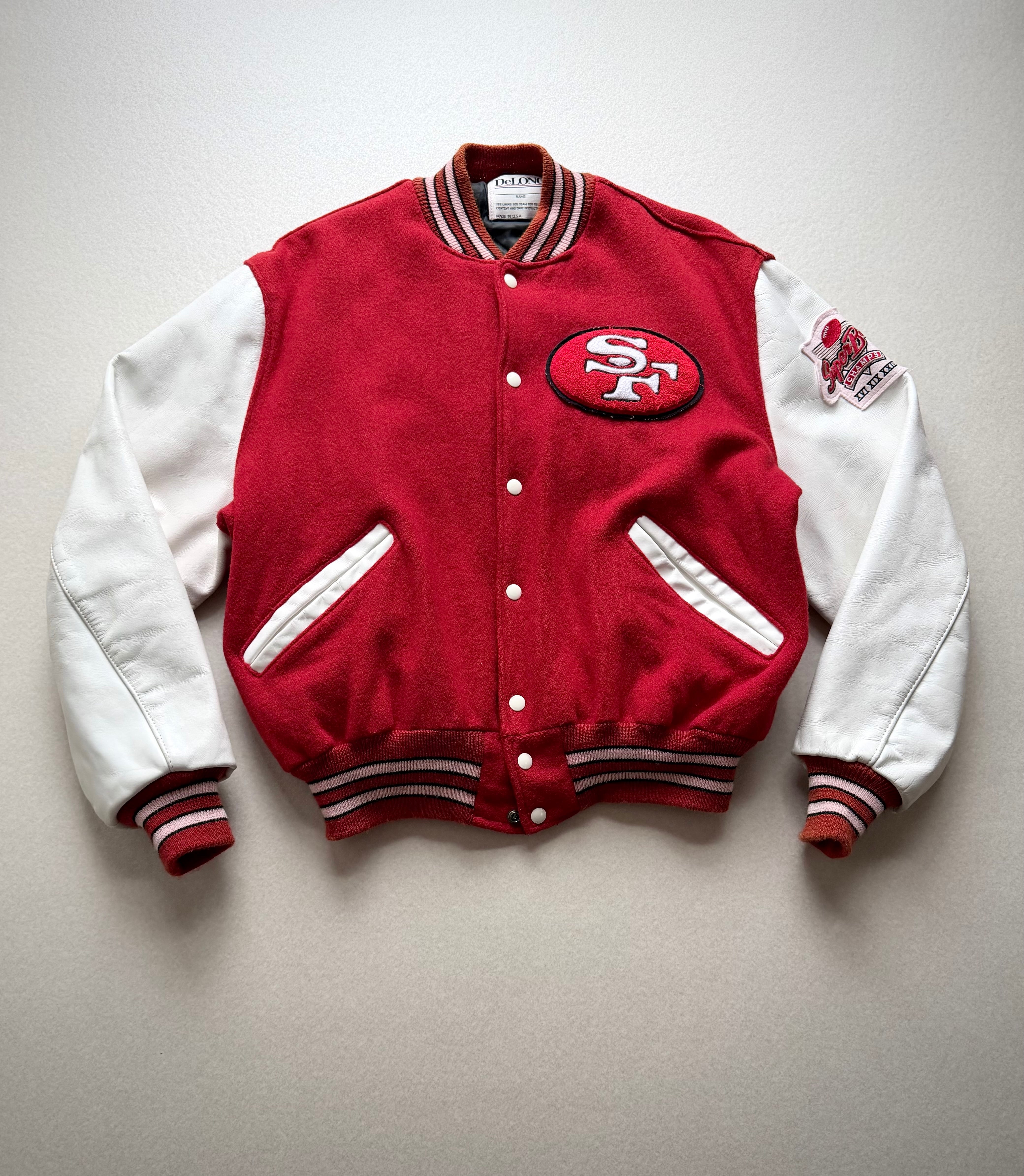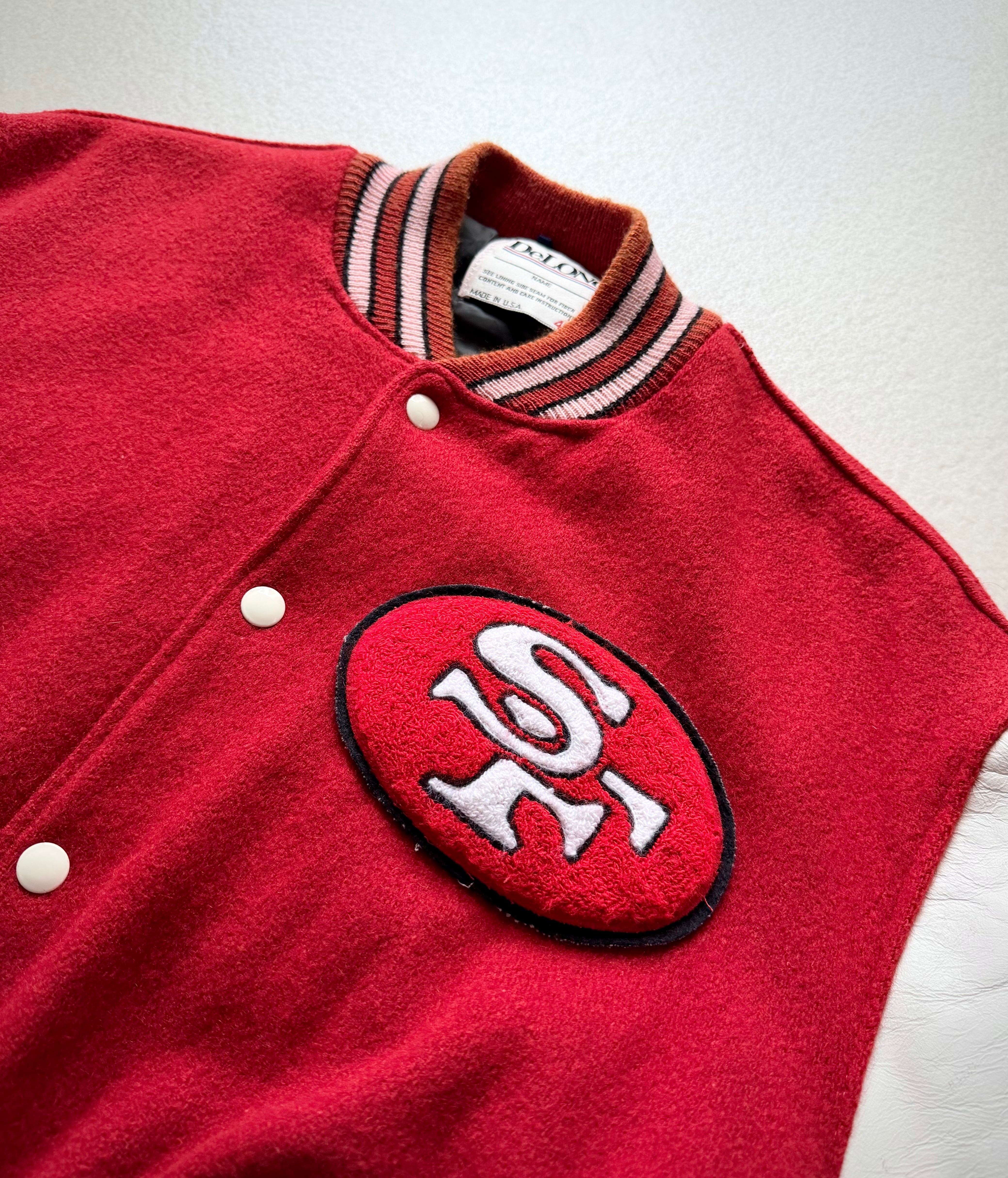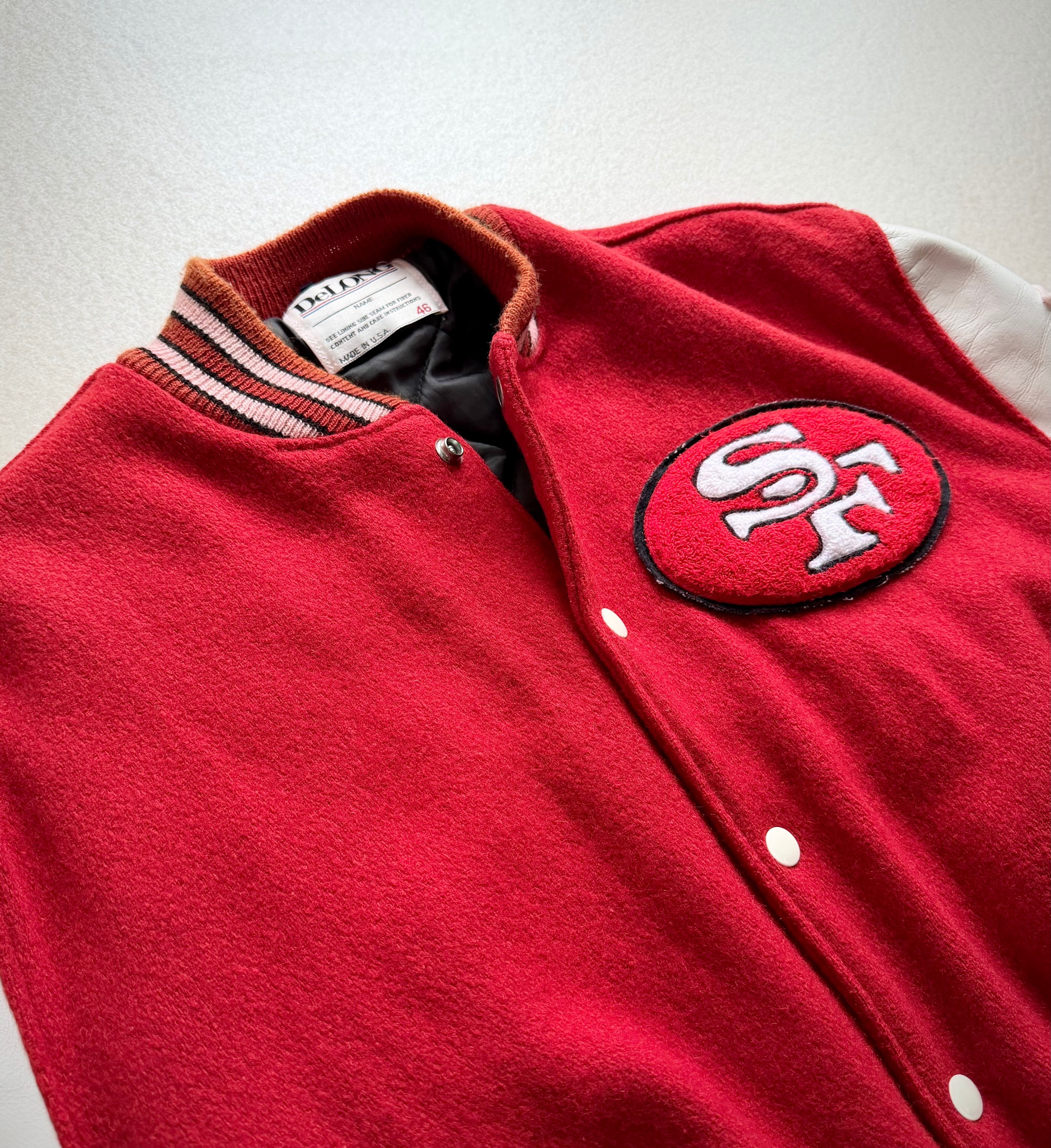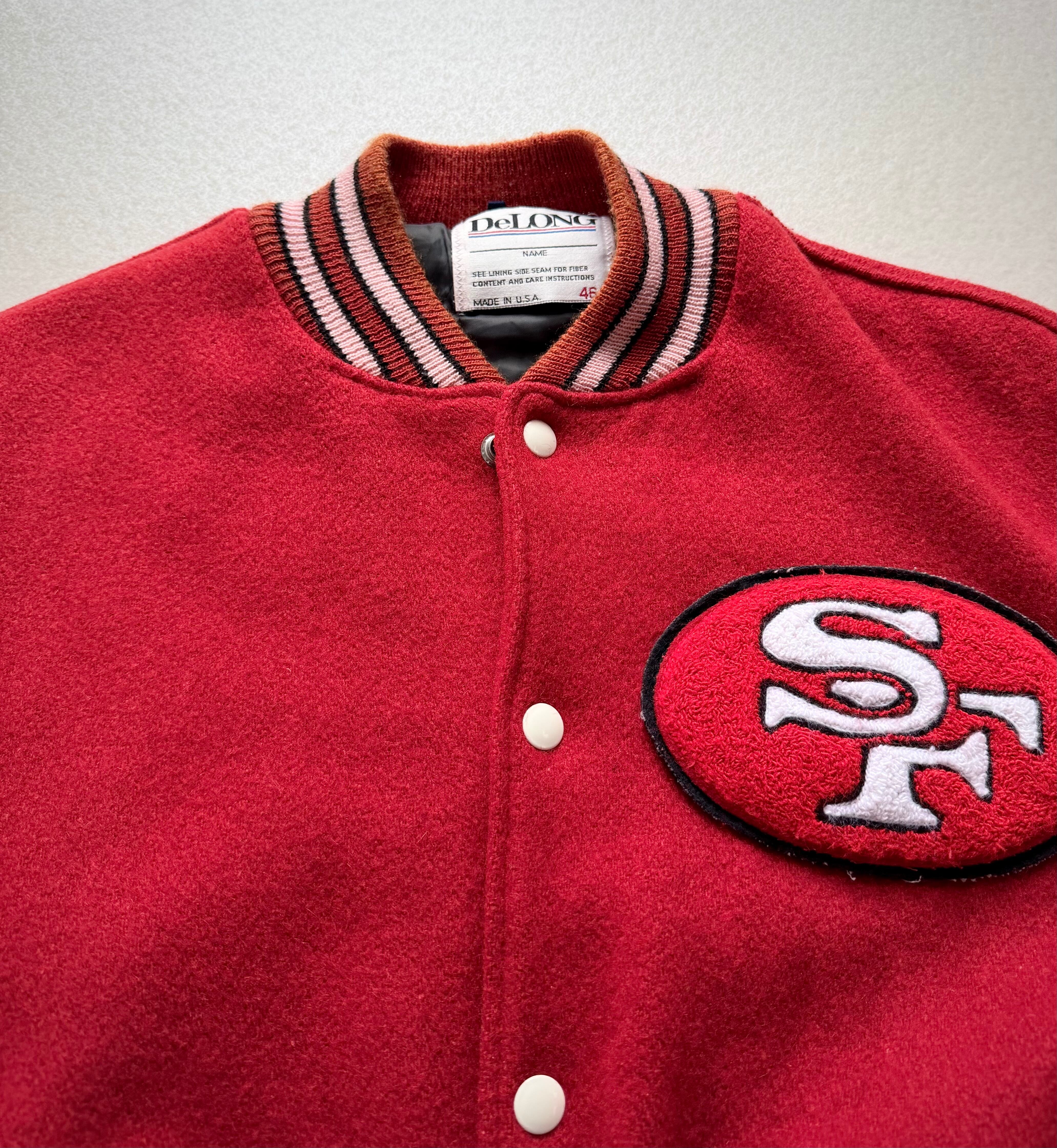 80s MADE IN USA “ DeLONG / SF 49ers ” NFL CHAMPS STADIUM JACKET OLD VINTAGE 。
