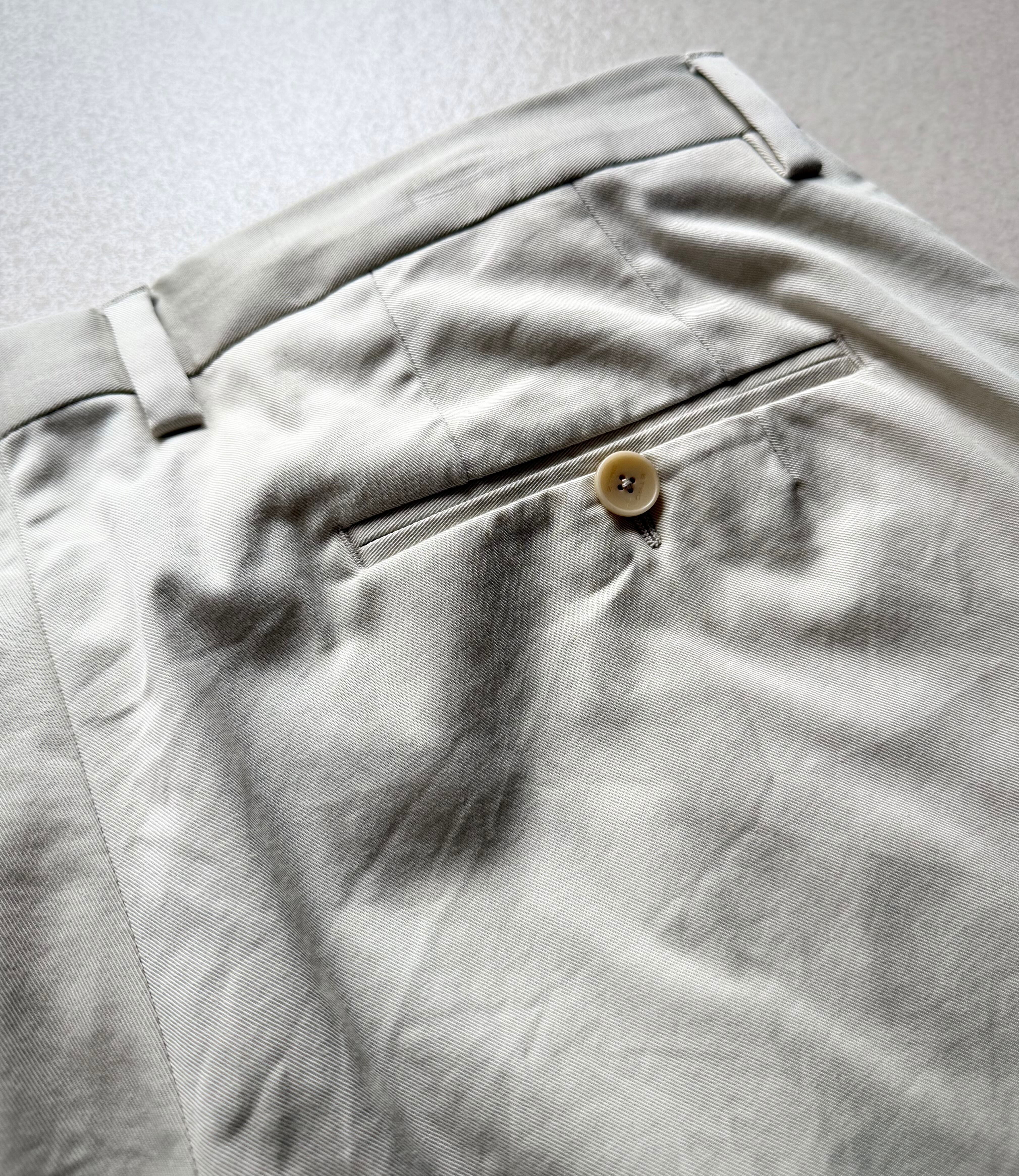 飾らないシンプルなソリッドタイプにタックの入った綺麗なテーパードシルエット、ウエストの内側にはレジメンタルなストライプと“ETRO”らしい拘りが垣間見える手の込んだ仕上がり。