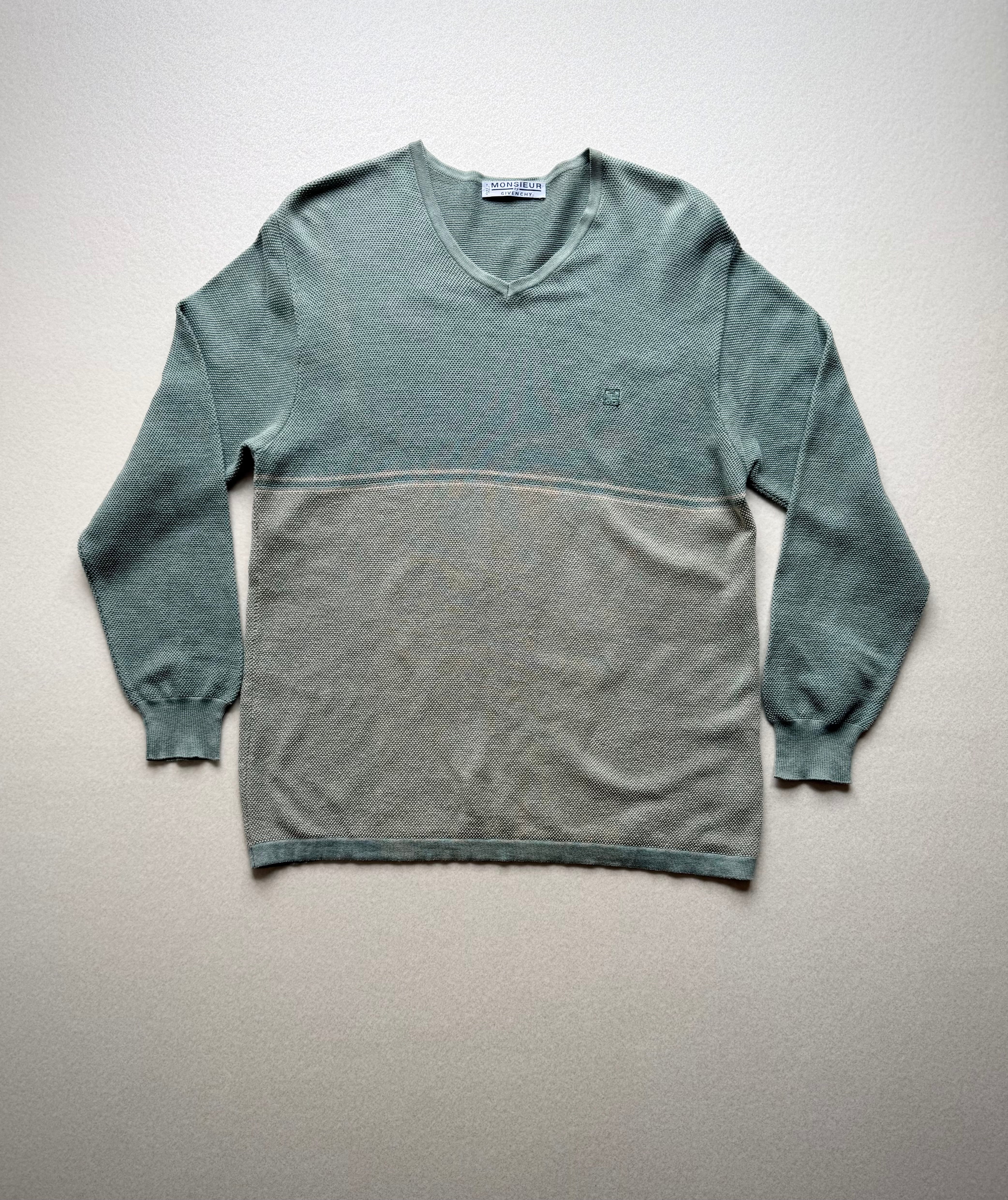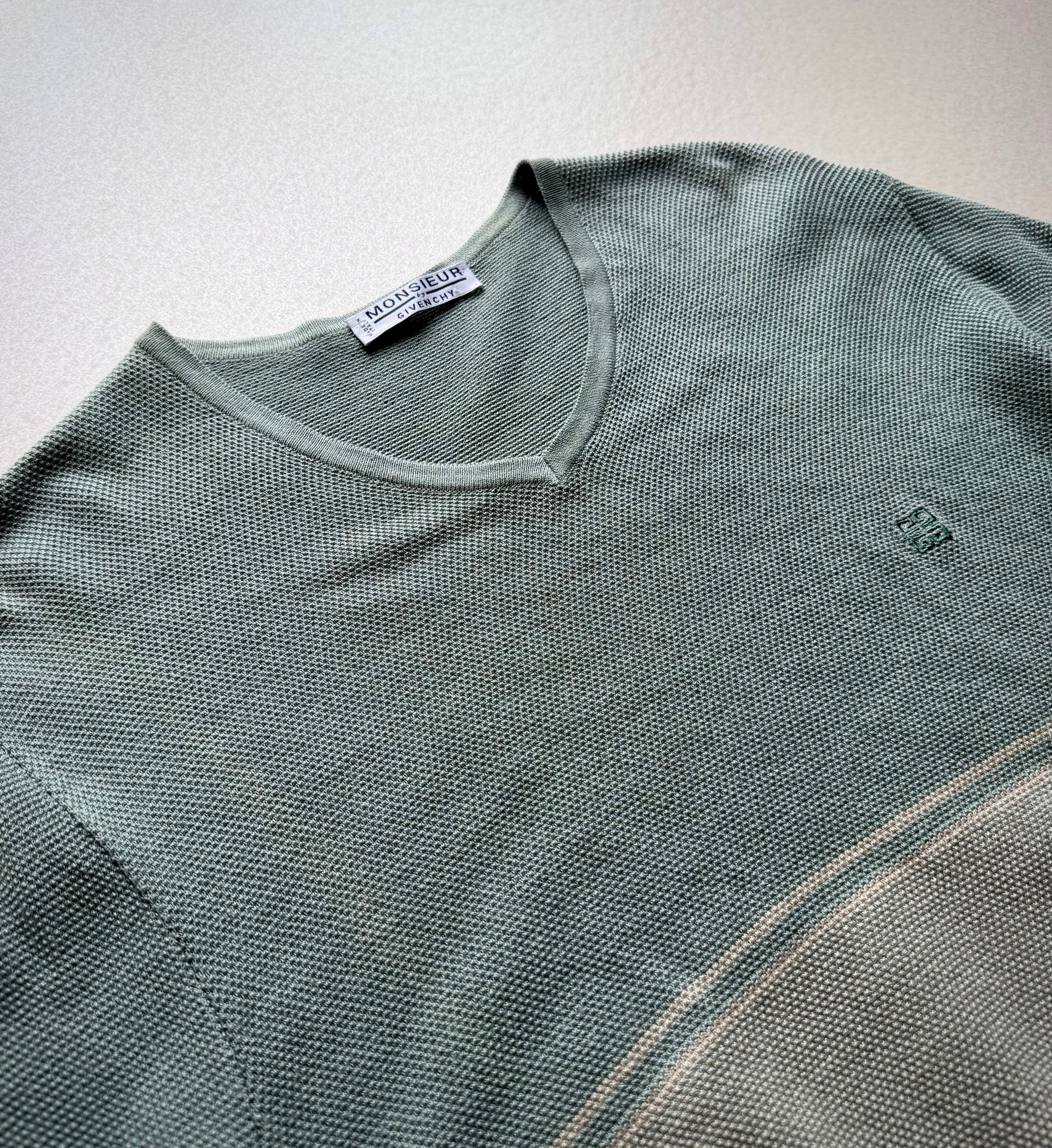 低彩度なヨモギ調ペールトーンのバイカラータイプにスッキリとしたVネック、シーズンとしては最適な目の粗い鹿の子タイプで通気性も良くサラッとした着心地も魅力的なコットンニット。