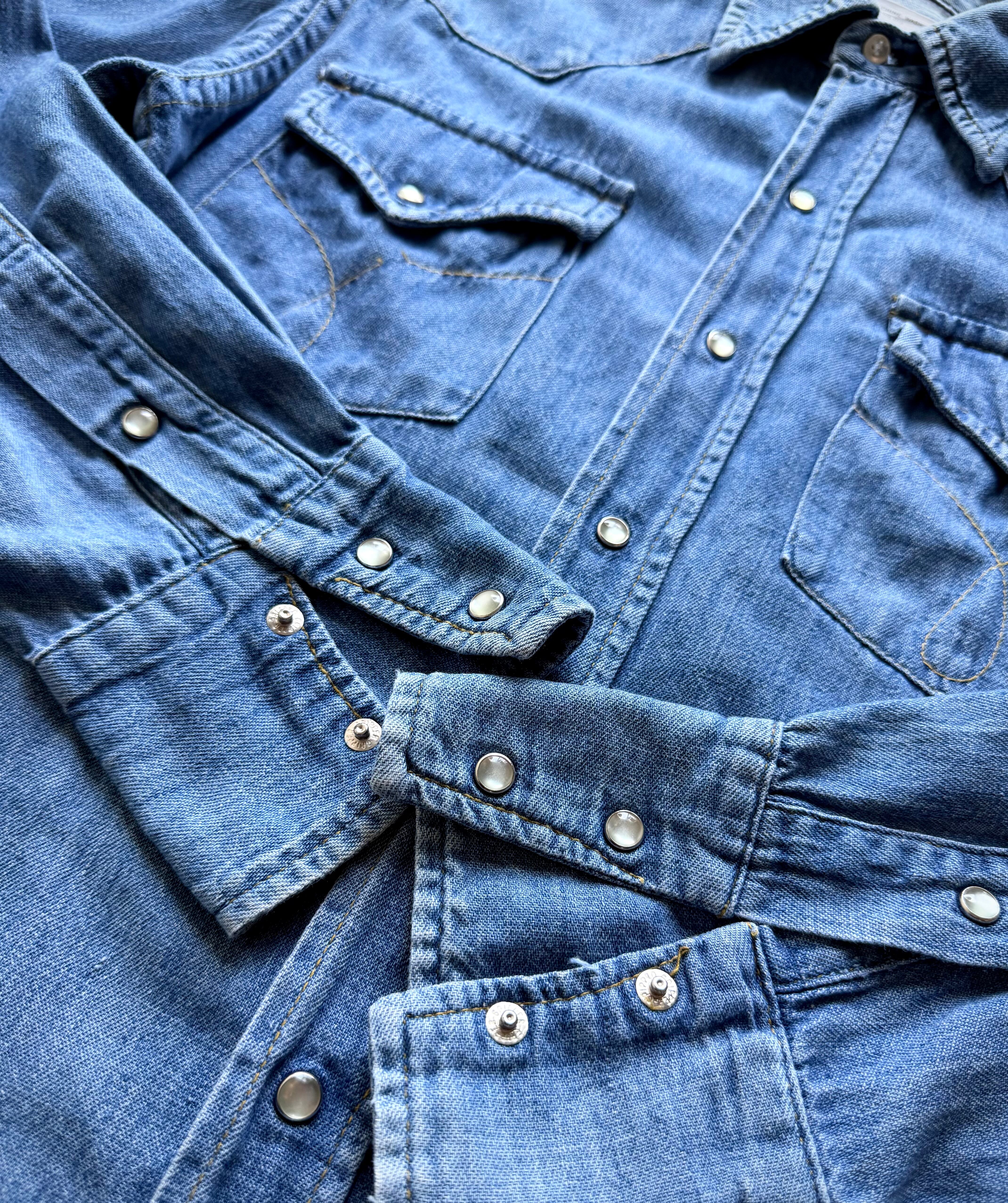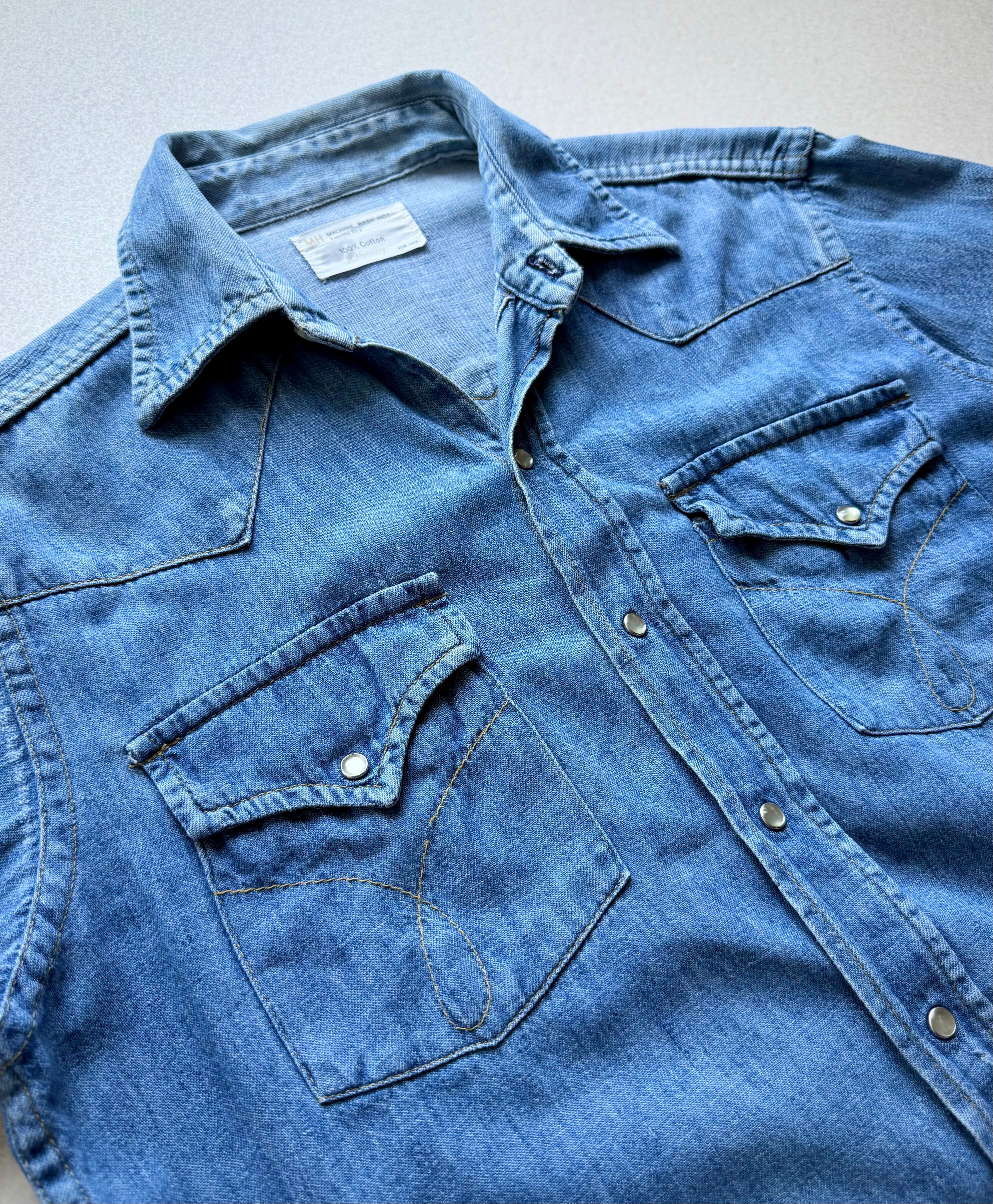 特徴的なポケットのウエスタンステッチや程良くにシェイプされた綺麗な曲線を描くシルエット,フロントスナップ,ウエスタンヨークとワークテイストながらドレスシャツの様な印象をも感じさせる品格ある仕上がり。