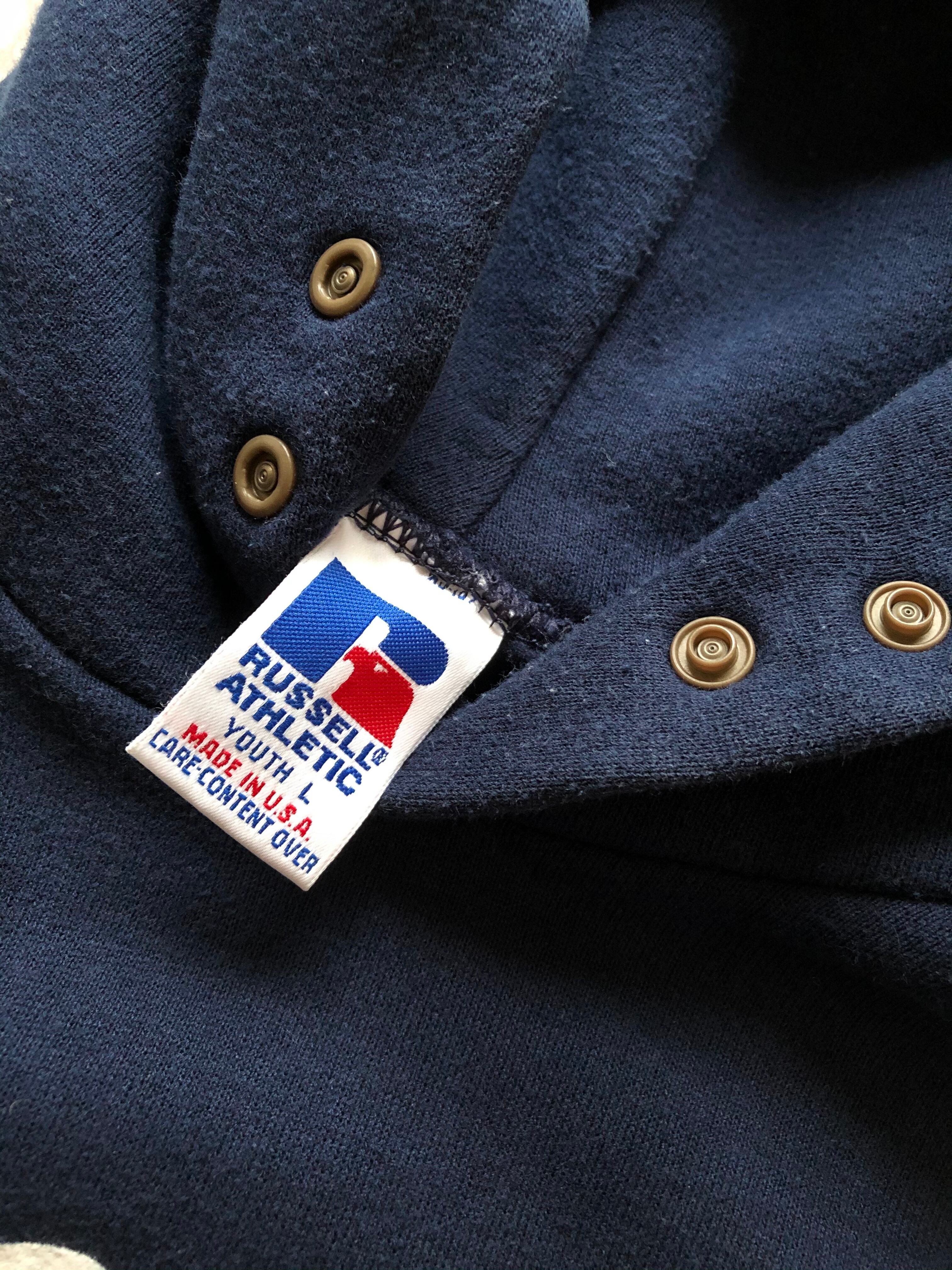 恐らくYOUTHモデルのみに存在するアイテムで、インパクトのあるフロント筆記体ロゴに首元スナップが特徴的となっており、RUSSELL社ならではの野暮ったさをあまり感じない使い勝手の良い綺麗なシルエットとなっております。