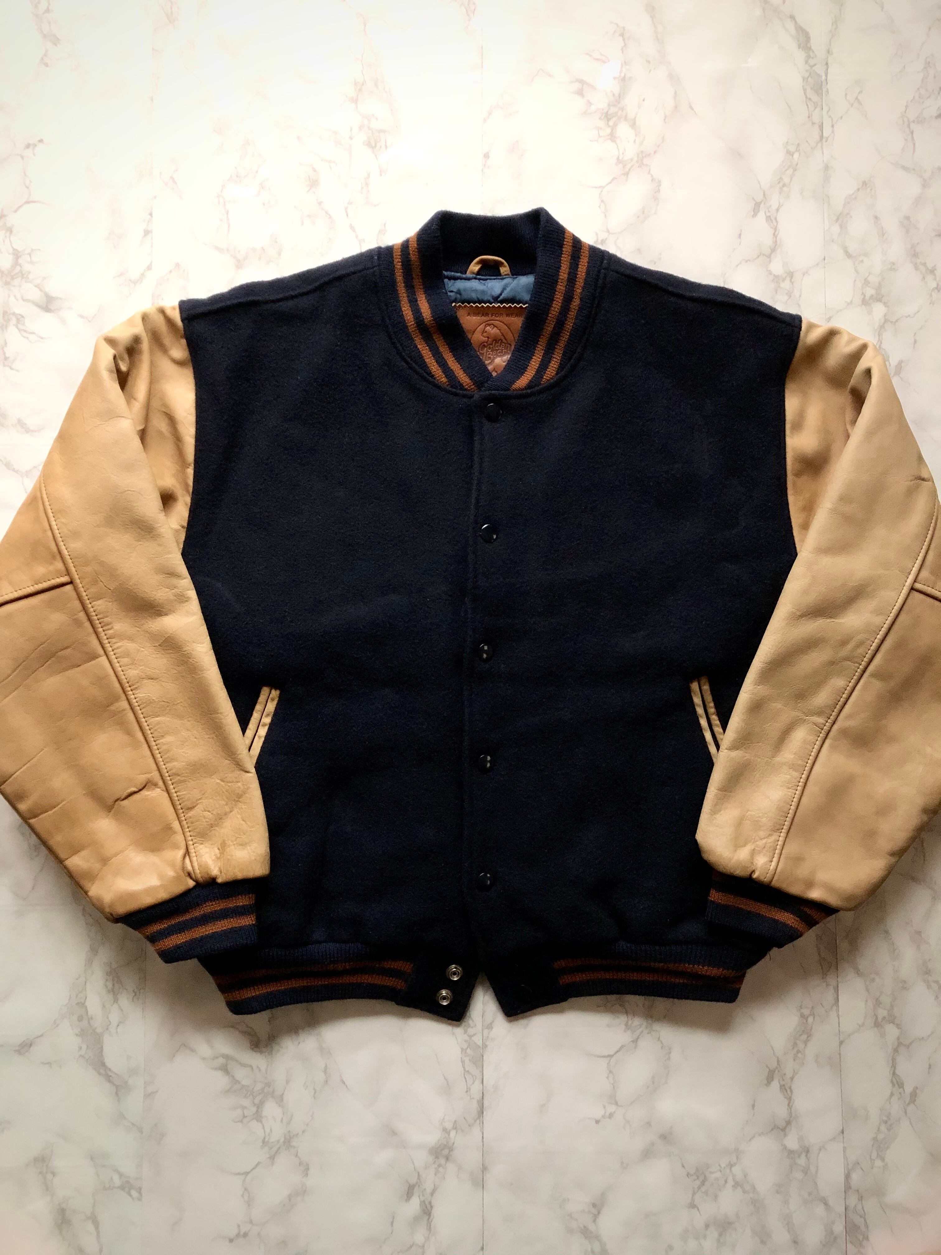 老舗 USA製 GOLDEN BEAR TWO-TONE VARSITY JACKET 90s ゴールデンベア 本革レザースリーブ メルトン スタジャン オールド