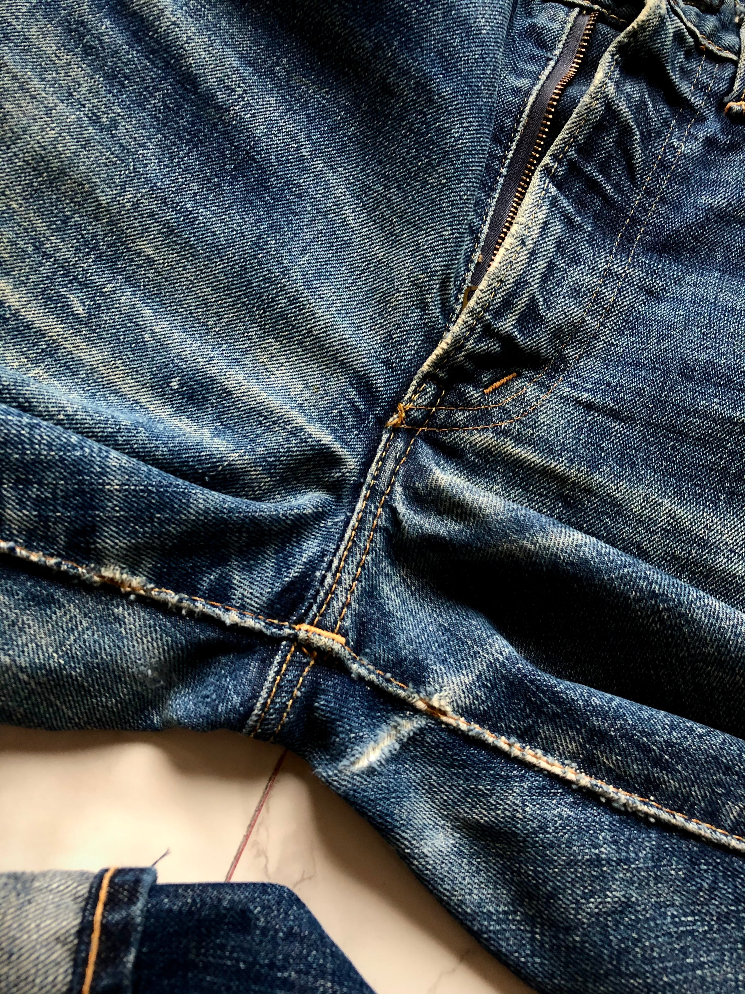 ビンテージならではの使用感,細かいスレ,薄汚れ,色落ち,両裾&ヒップにタタキリペア,ポケット縁や所々に小ダメージ,スレーキ破れにあて布,股下にキズ等々と少しダメージはありますが、アタリや色落ち.色残り含めビンテージらしいとても良い雰囲気だと思います。