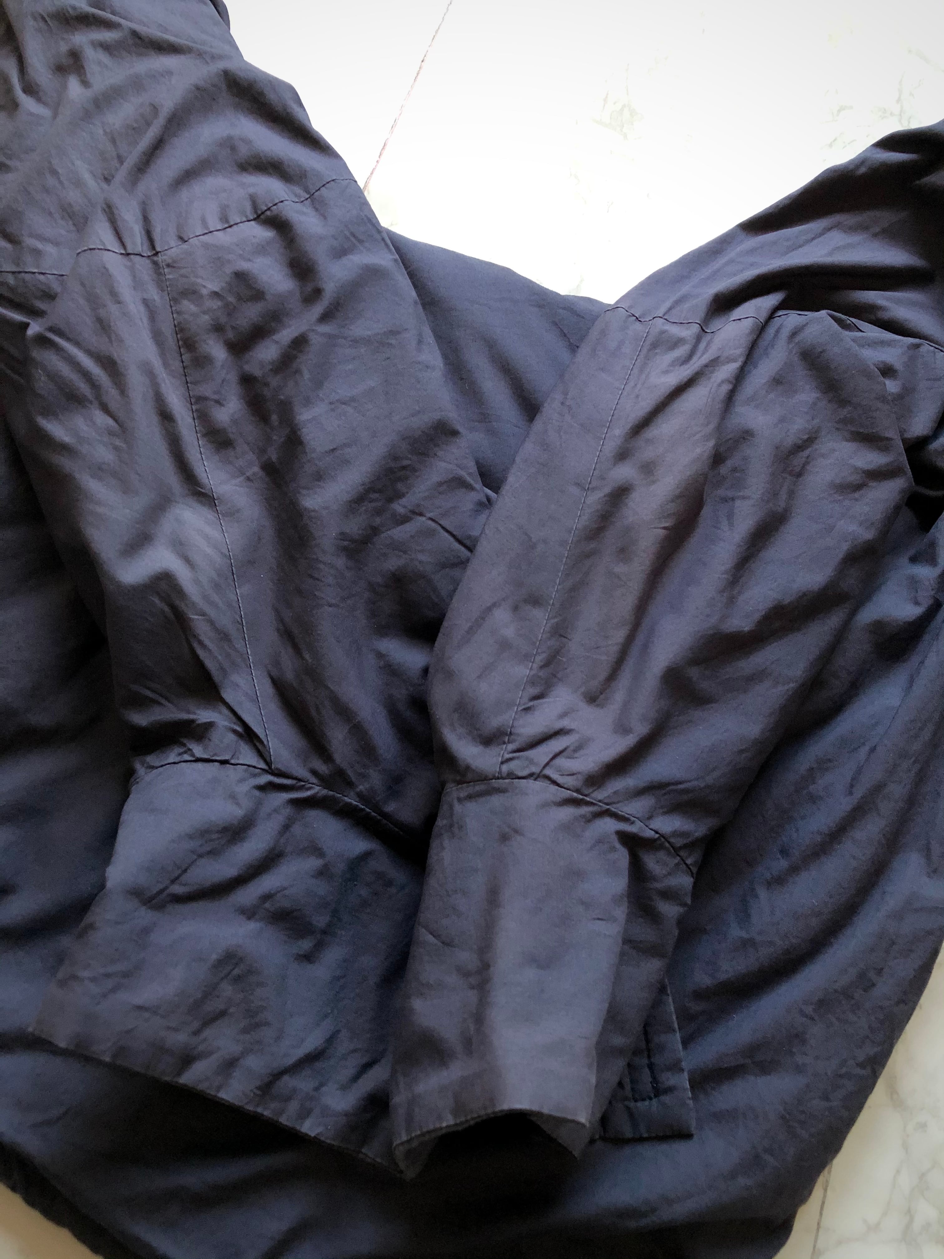 首元がベルクロ.ハーフタイプの珍しいスタンドカラーにライトなボリュームで中綿の入ったプルオーバーのコットンジャケット、独自のガーメントダイにて染色された風合いが経年と共に変化しビンテージのナス紺のような雰囲気となっております。