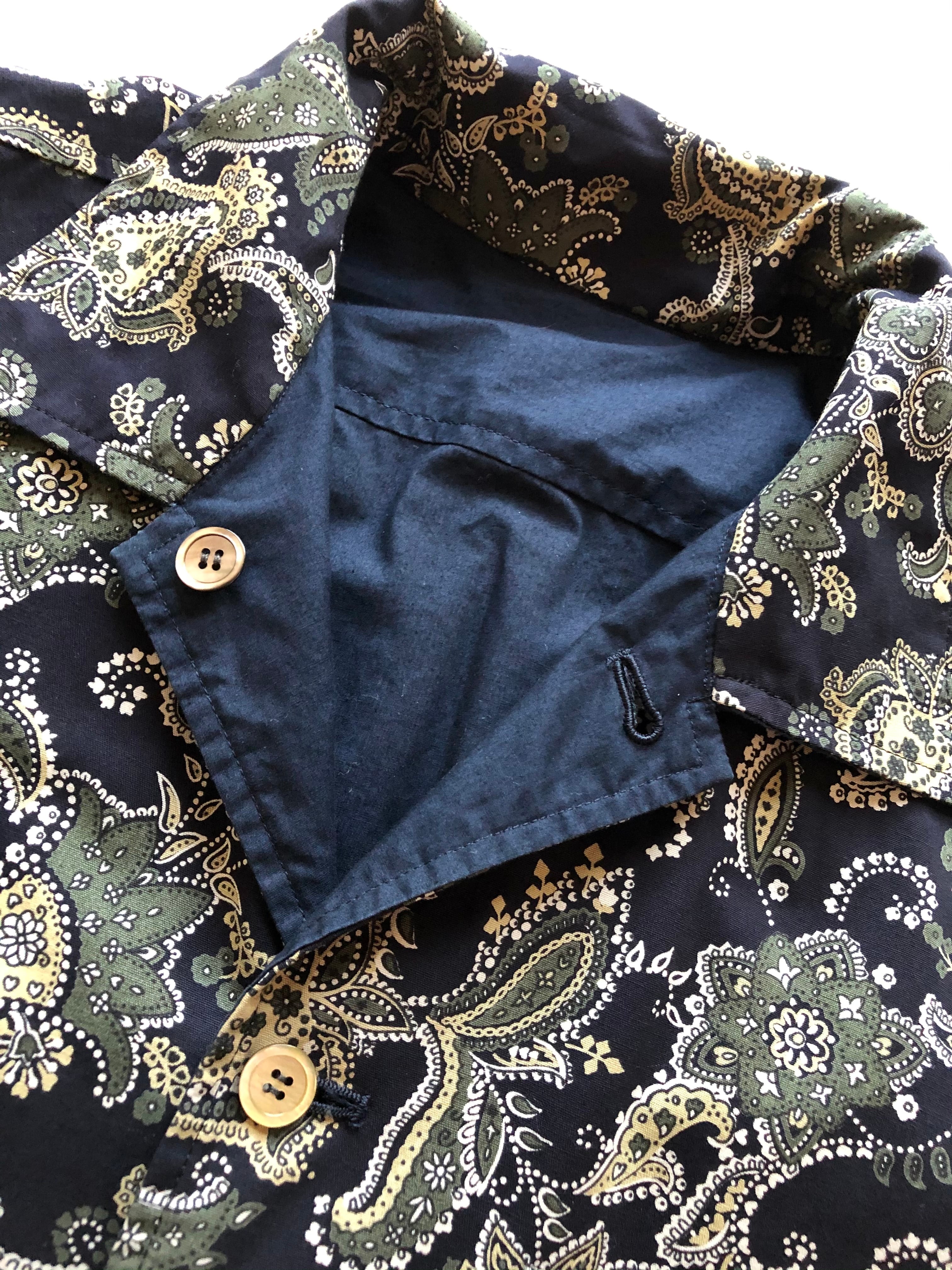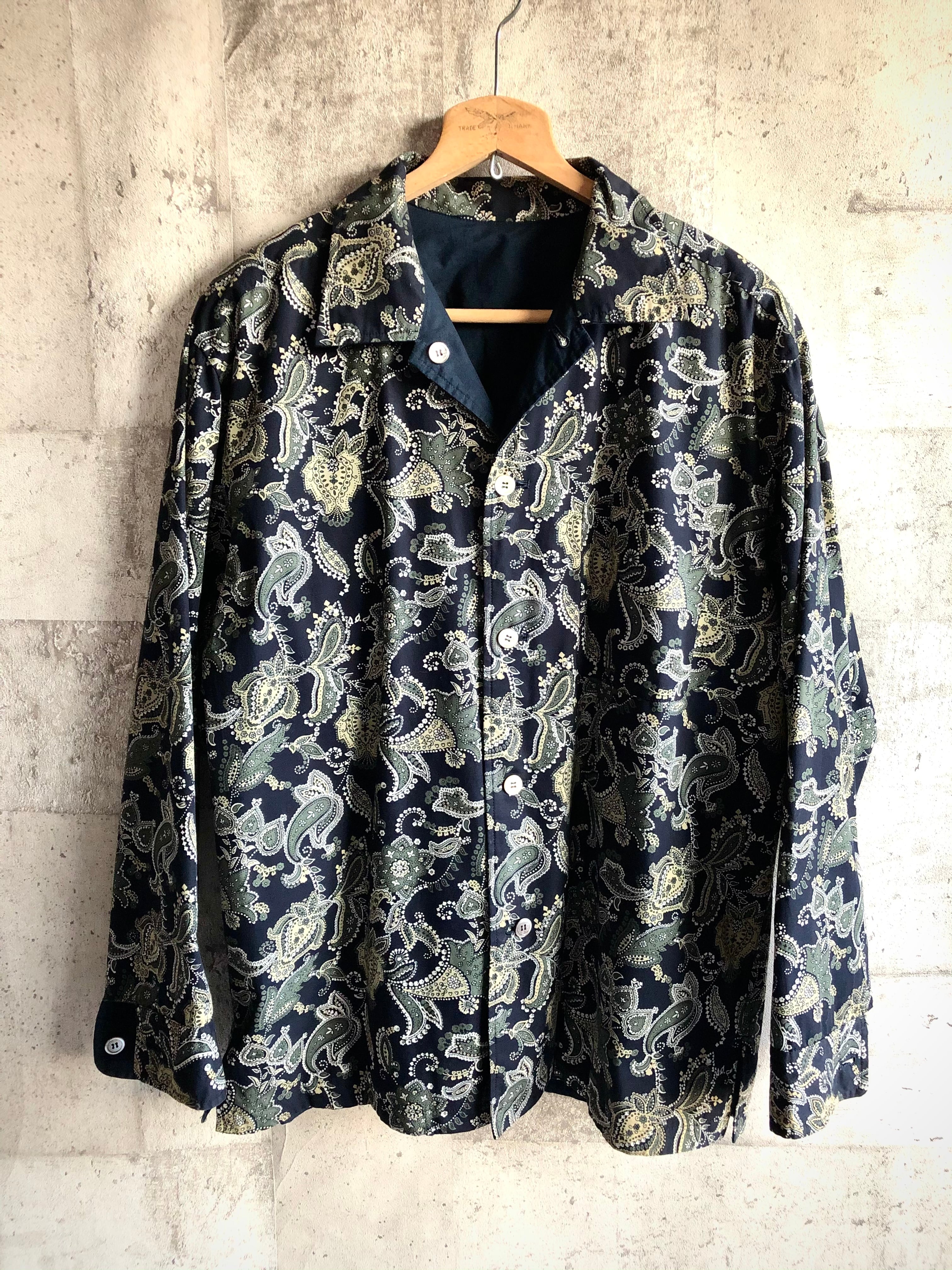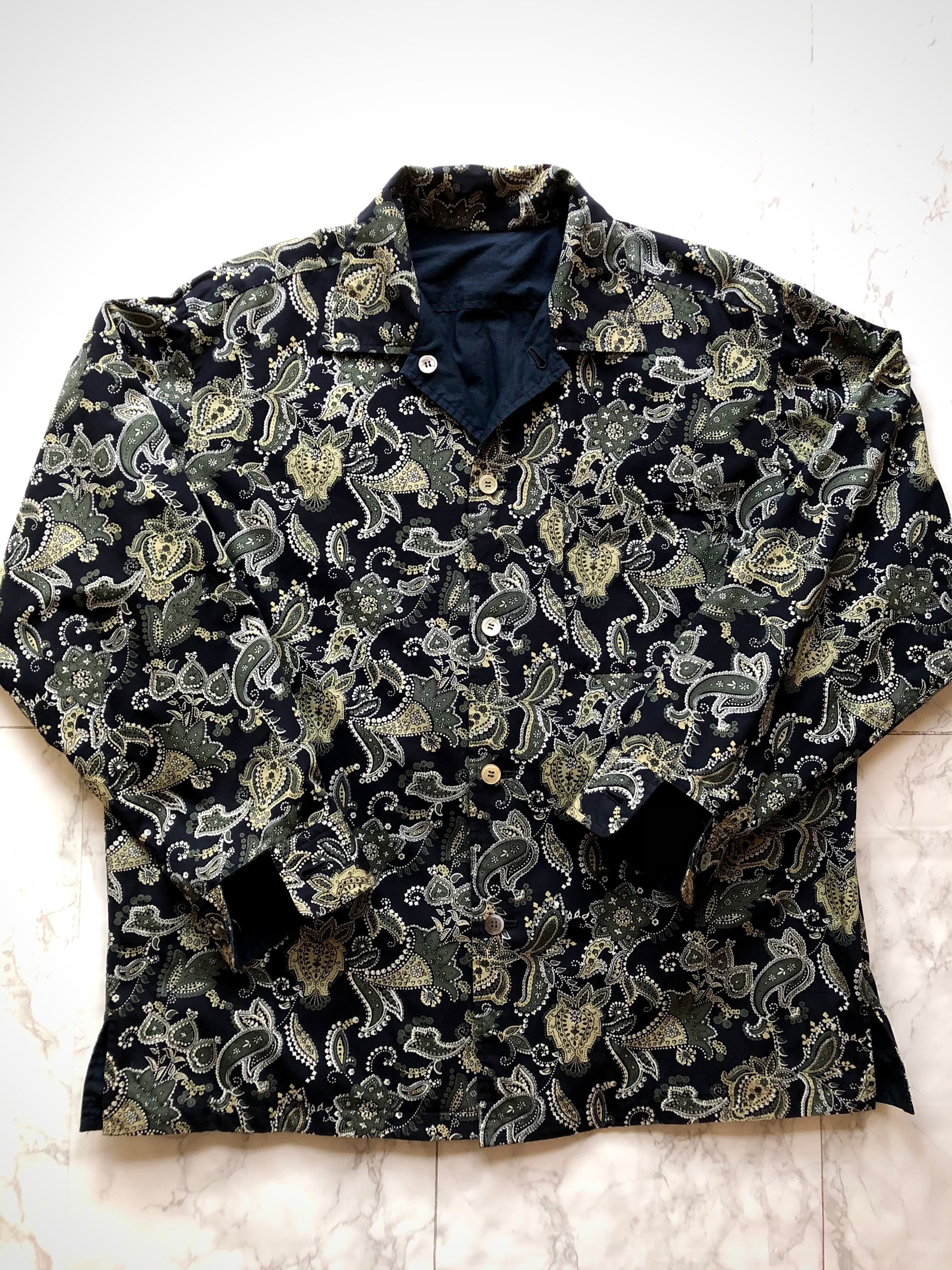 1989sコレクションにて発表されたリバーシブルタイプのシャツジャケット、表側はインパクト&雰囲気抜群なペイズリーデザインに裏側は濃紺ネイビーの無地タイプ、素材はハリコシがあり滑らかさも兼ね備えたポプリン生地で着心地も良く、黒蝶貝のダブルシェルボタンや袖先のヤンクカフス等と随所に拘りが垣間見える至高の一品だと思います。