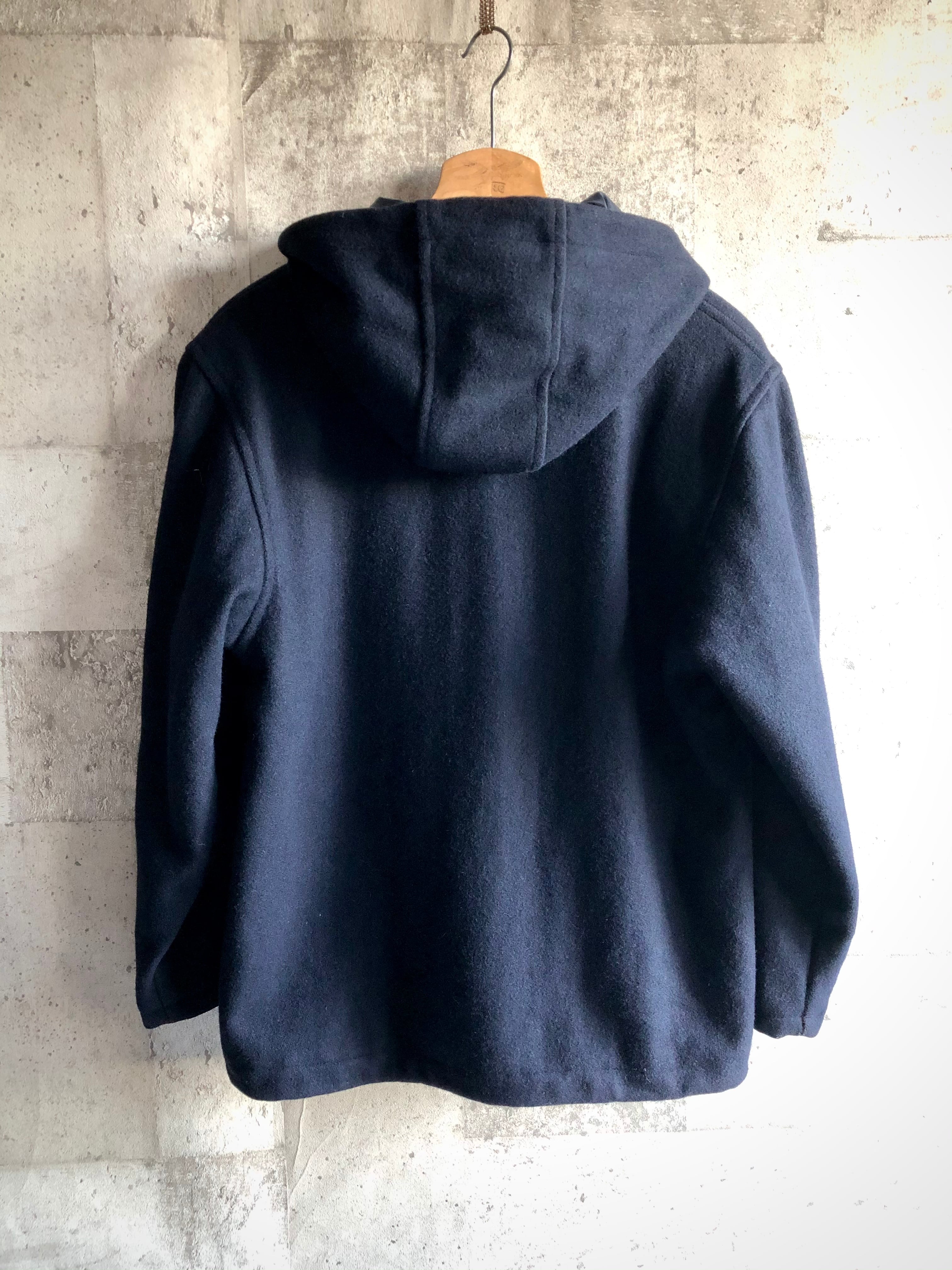 フロントはフルジップタイプのシンプルなフード付きメルトンパーカー/ジャケットで、やや大きくデザインされたパッチポケットが特徴的な1枚。