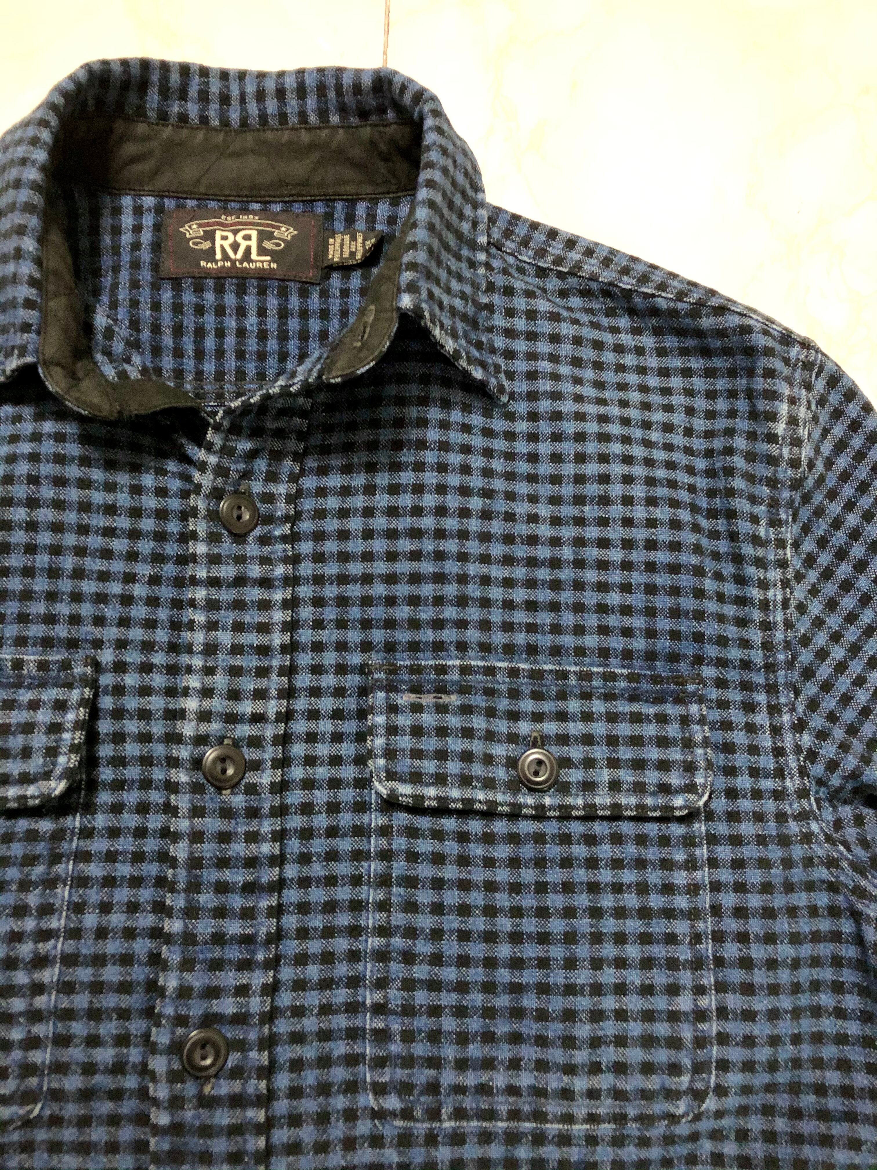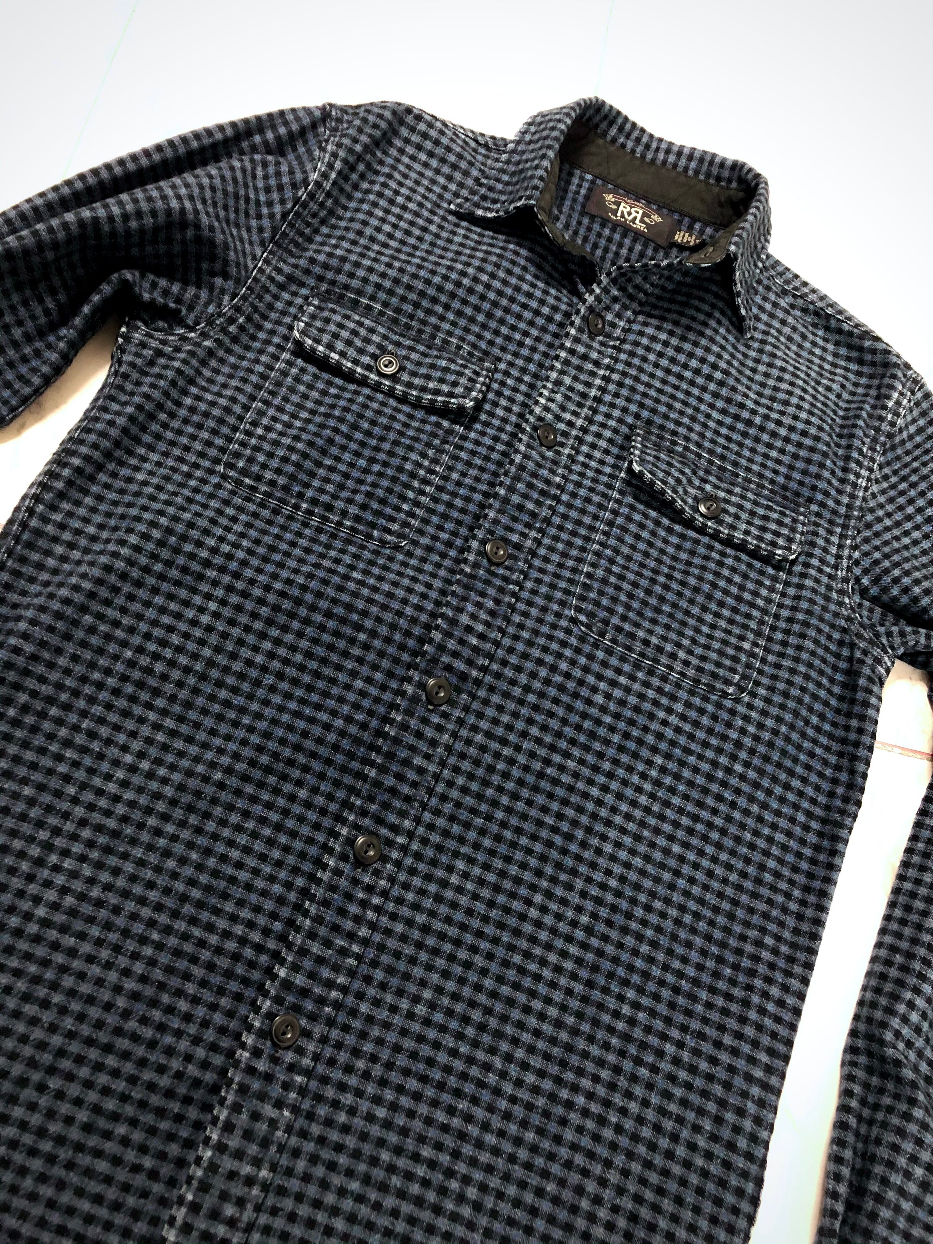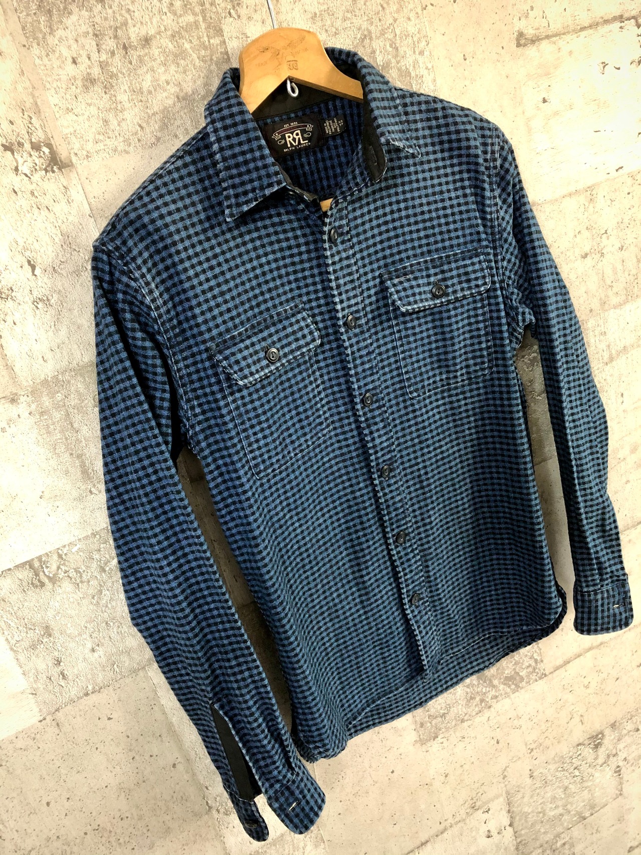 RRL - RALPH LAUREN INDIGO BLOCK CHECK VINTAGE LOOK COTTON WORK SHIRT ダブルアールエル インディゴ チェック ワークシャツ コットン ビンテージスタイル