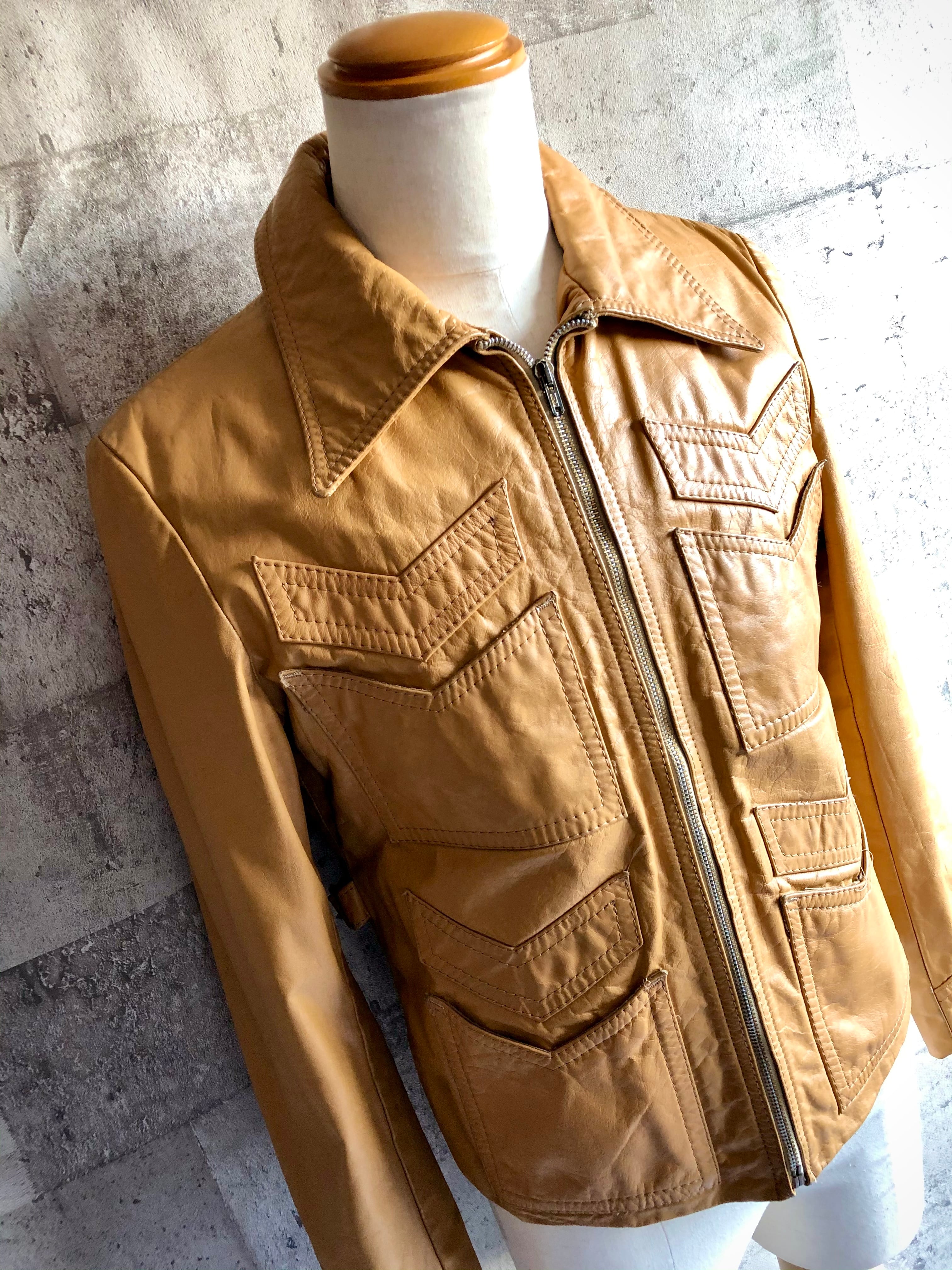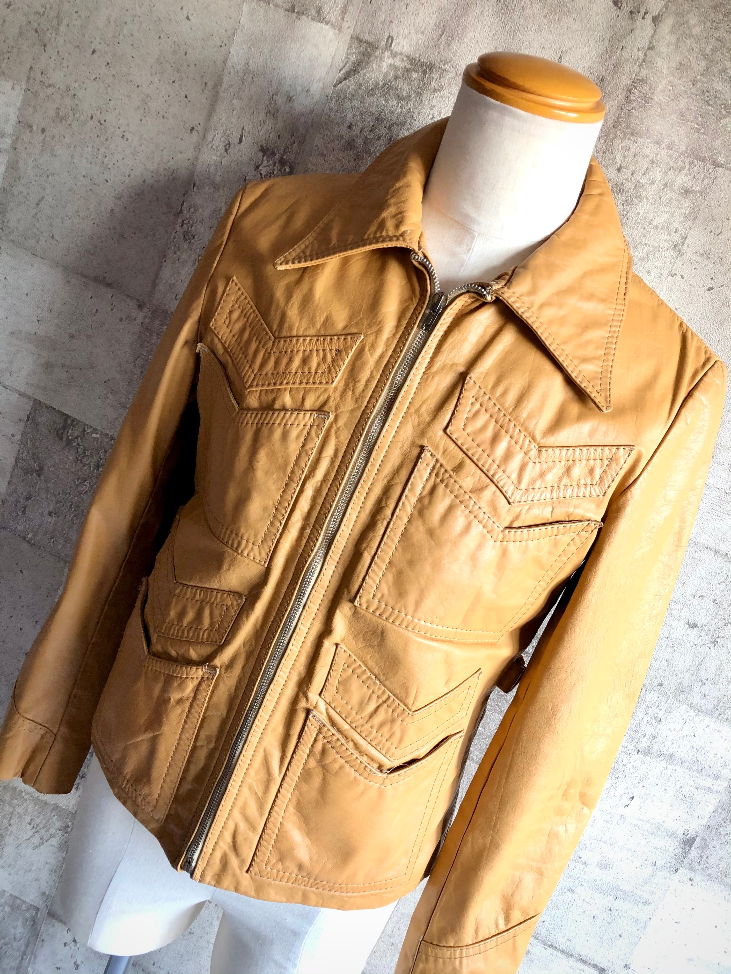いかにも70年代らしい仕上がりで、やや大きめな襟型にアート作品のように絶妙なバランスで配置されたユニークで遊び心も感じられるフロントの4PKTデザイン、当時ならではのキャメルのカラーリングも相俟って非常に雰囲気の良い1枚です。