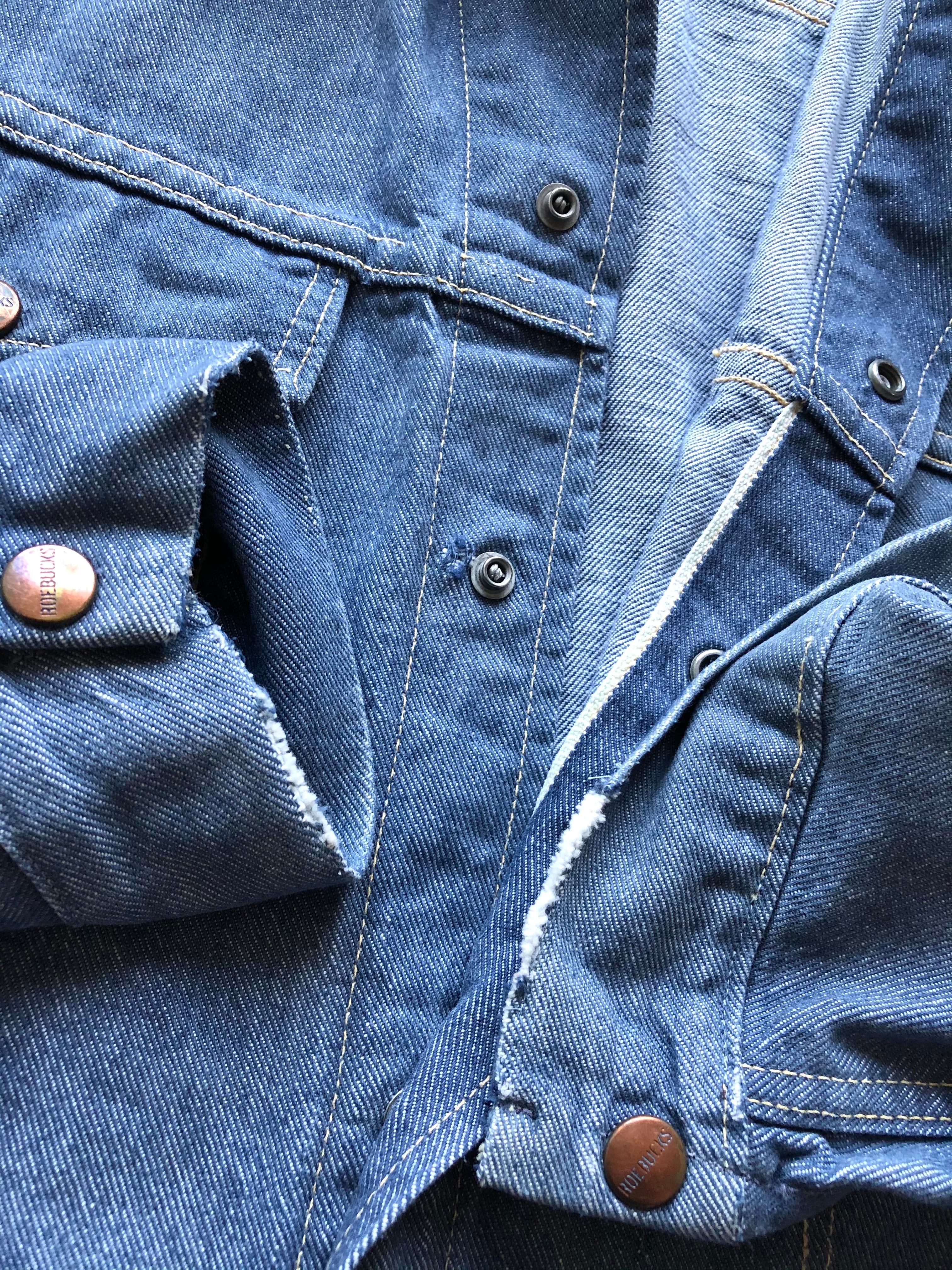 フロント前立て裏には珍しいグリーンのセルビッジが付いた嬉しいポイントで、昨今では非常にニーズの高まっている希少なビッグサイズ、同年のLEVI’Sと比べてもリーズナブルで気兼ねなく着用できるビンテージのデニムジャケットだと思いますので、是非この機会にいかがでしょうか。