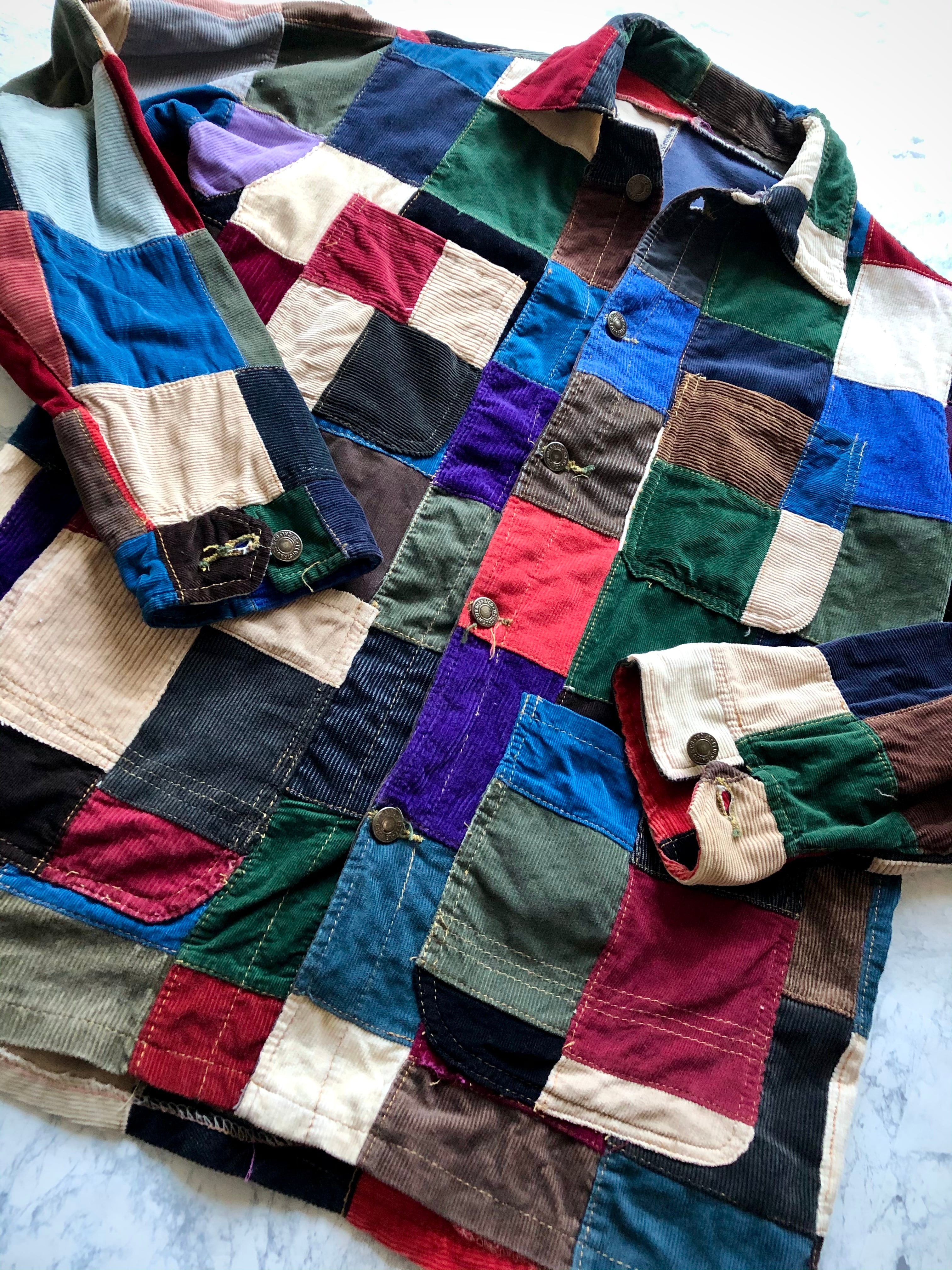 恐らく80年代〜と思われる珍品アイテム、LEVI’Sでも大変珍しいマルチカラー.クレイジーパターンのコーデュロイ素材にて製作されたパッチワークデザインのカバーオールジャケット。