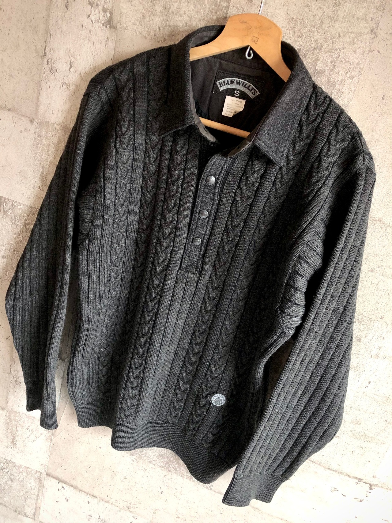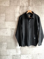 BLUE WILLI’Sとしては非常に珍しいブラックをベースにしたコットン/ウールの混紡素材、デザイン性の高いケーブル編みのニットにハーフスナップスタイル&襟付きとなったクラシックな印象の1枚です。