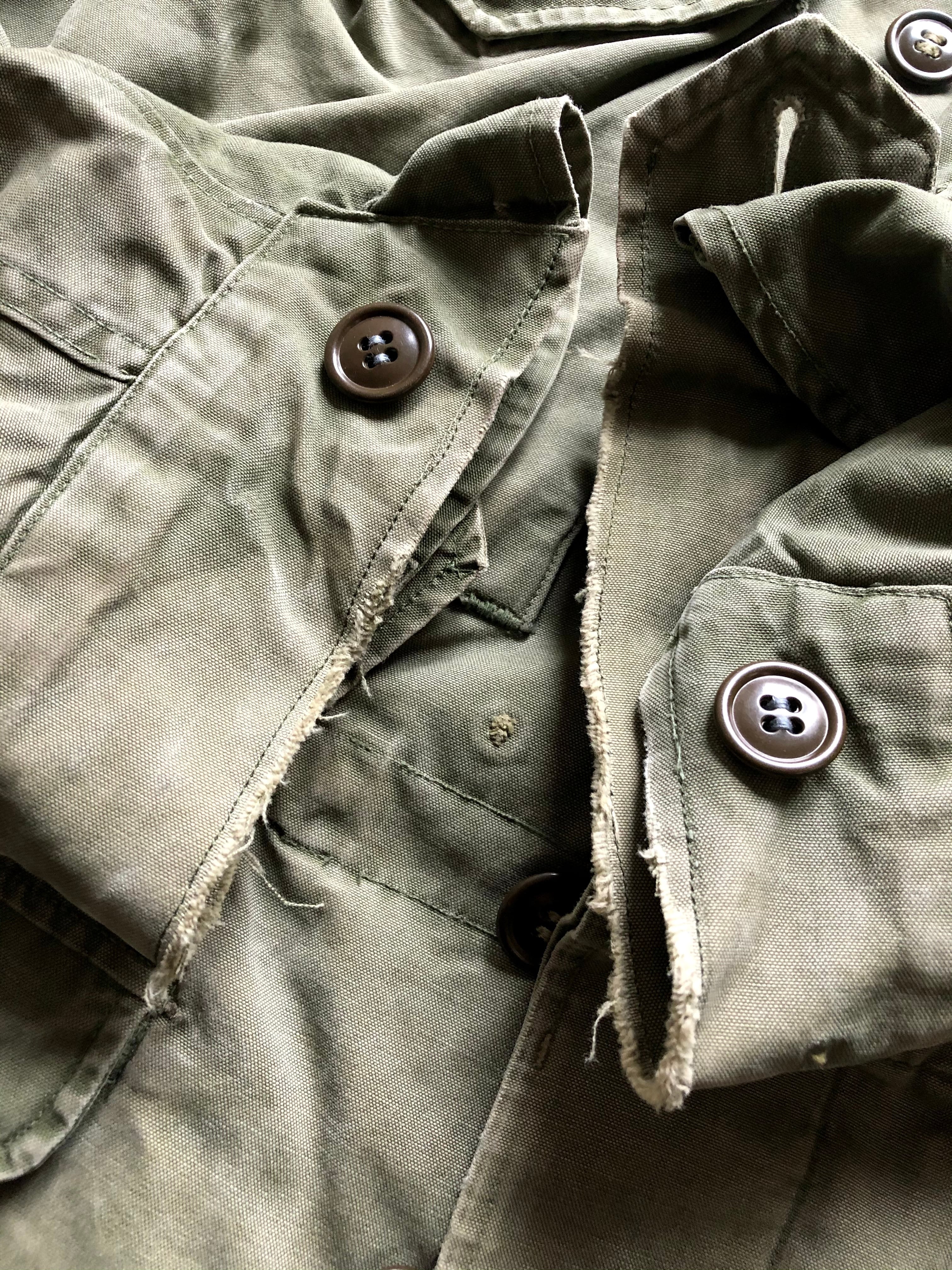 M-43の意匠を引き継いだ4PKT.フロントボタン式で基本的なデザインはそのままに、ライニングがボタンにて着脱式と変更されている点が最大の特徴となっておりますが、その中でも首元にだけボタンが付かないレアな初期モデルになります。