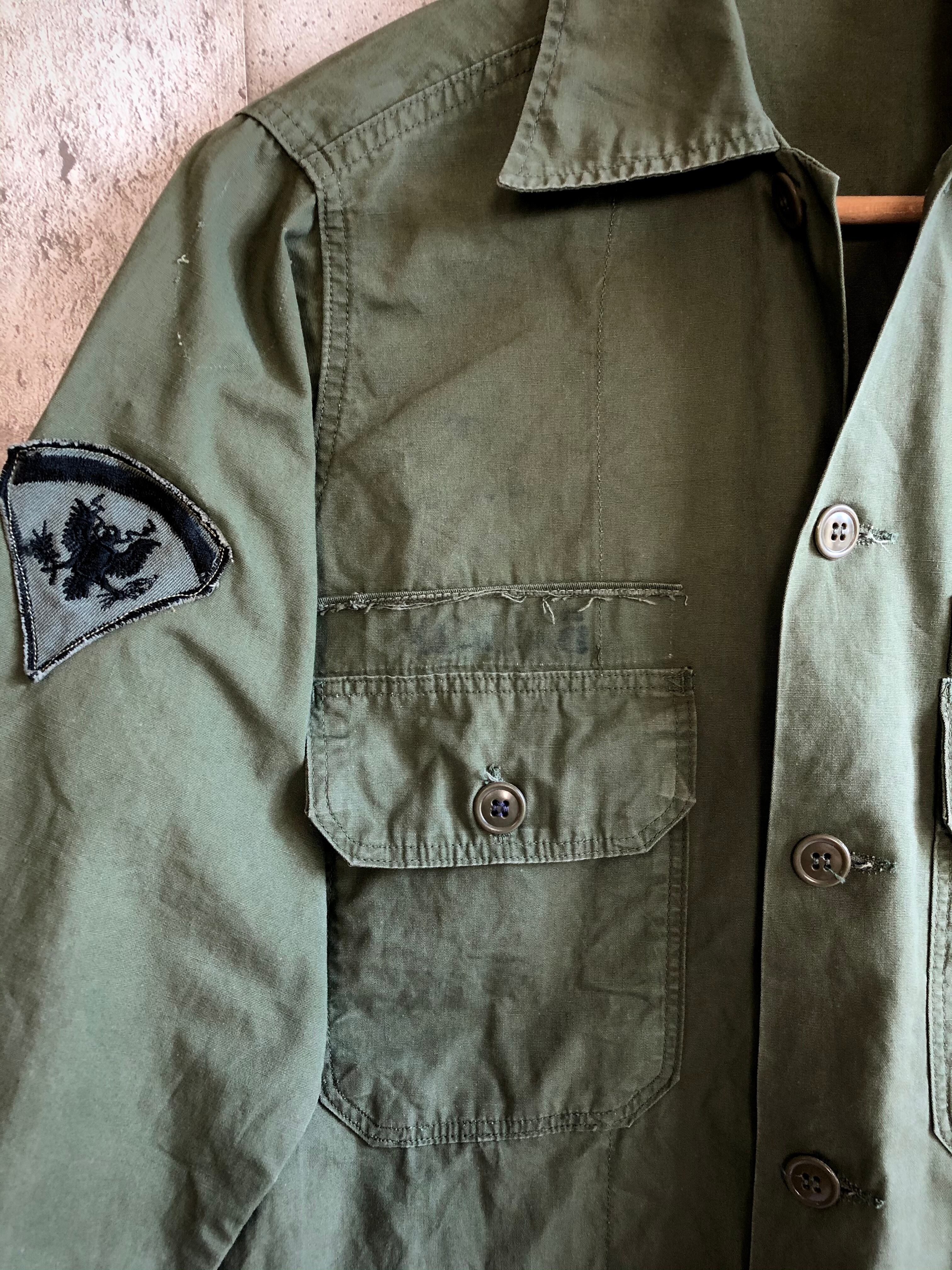 BDU.ユーティリティーのデザインをそのままにポプリン生地へと変更され、60sのUS.ARMY&ロジスティカルコマンドのワッペンが付き実際に着用されていたと考察できる珍しい実物モデル。