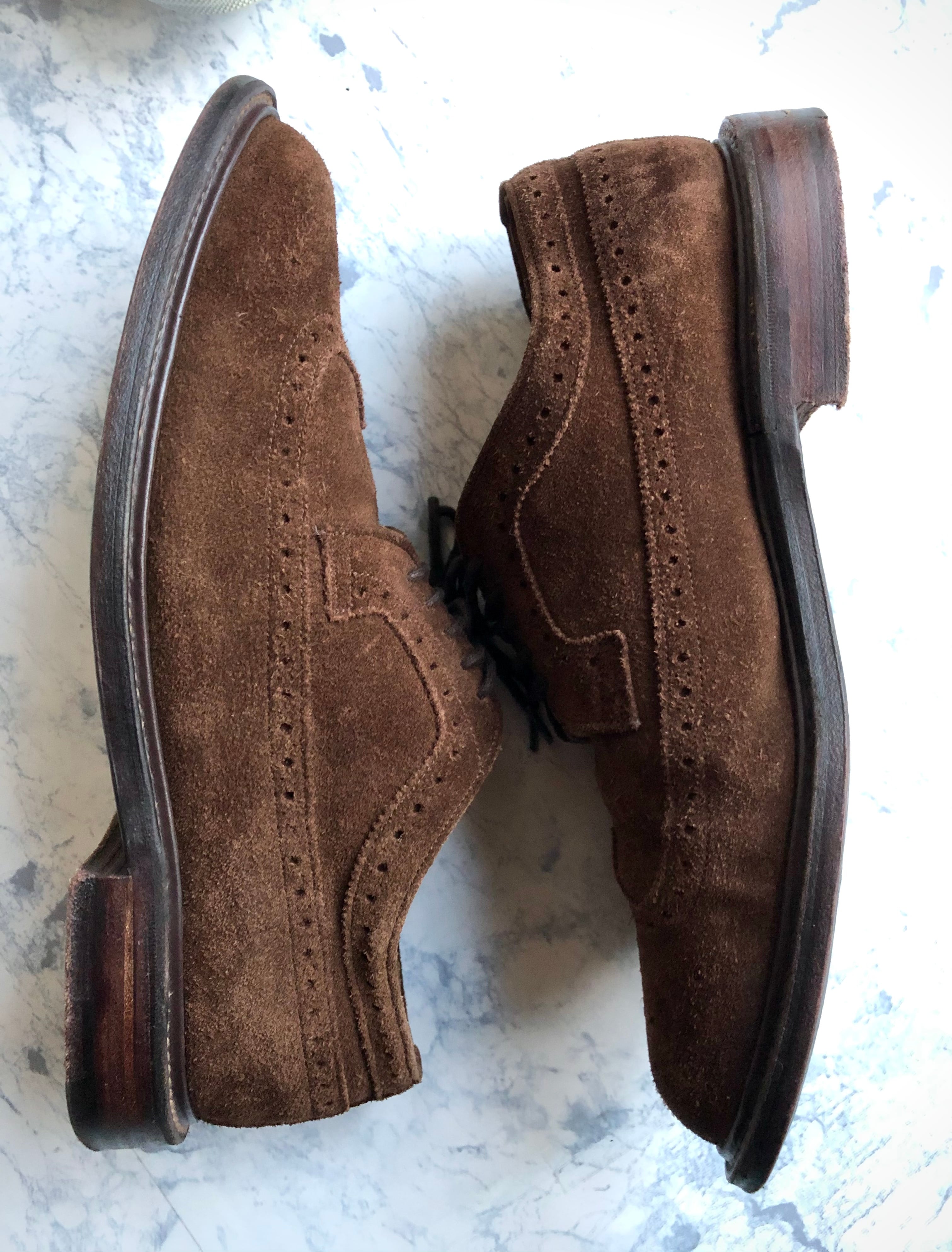 通常のレザーに比べて耐久性が高く長持ちするとされているスウェード素材をベースにしたロングウィングチップモデル、品格溢れる雰囲気でカジュアル〜ドレススタイル等と幅広く着用でき、コーディネートの締めには最適な1足だと思いますので、お好きな方は是非この機会にいかがでしょうか。