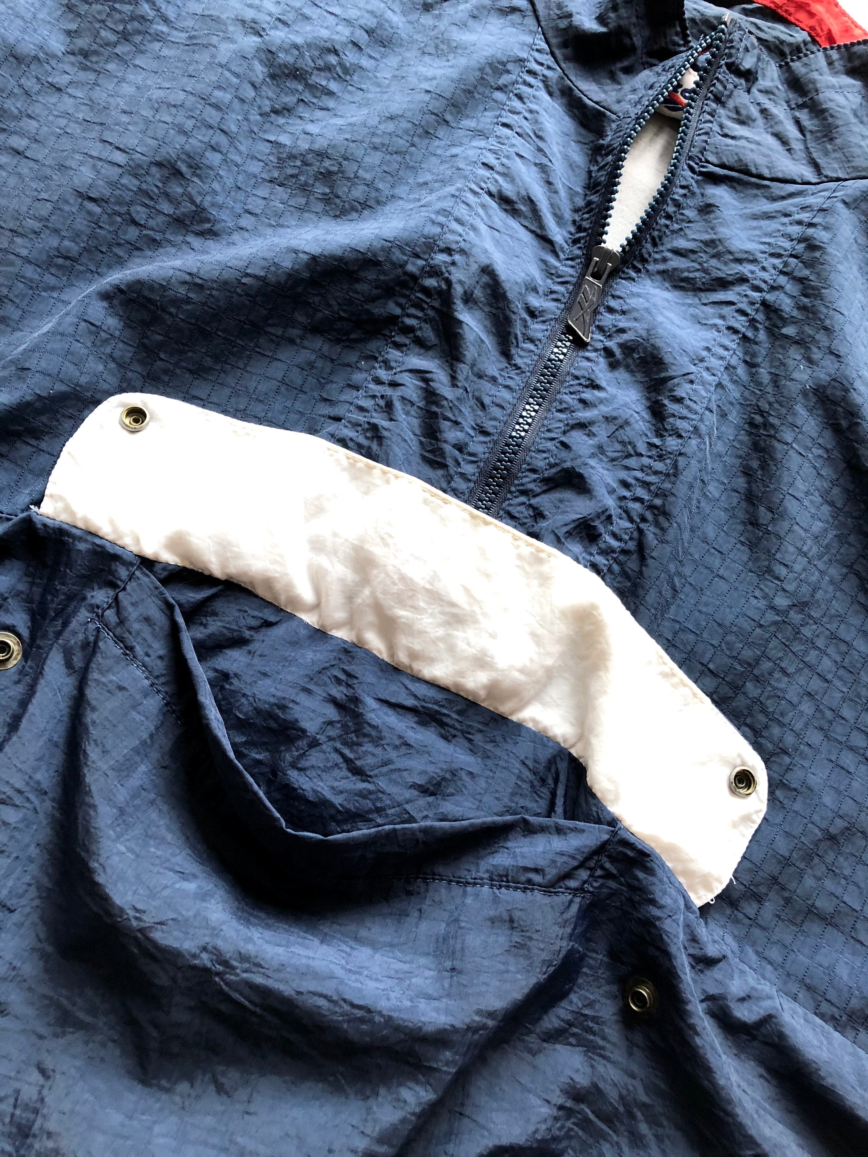絶頂期でもあった1990年代〜のオールド ナイロンジャケット、ホワイト×ネイビー×レッドのカラーリングからなるトリコカラーのグッドな配色に当時物らしいゆったりとしたビッグシルエット。