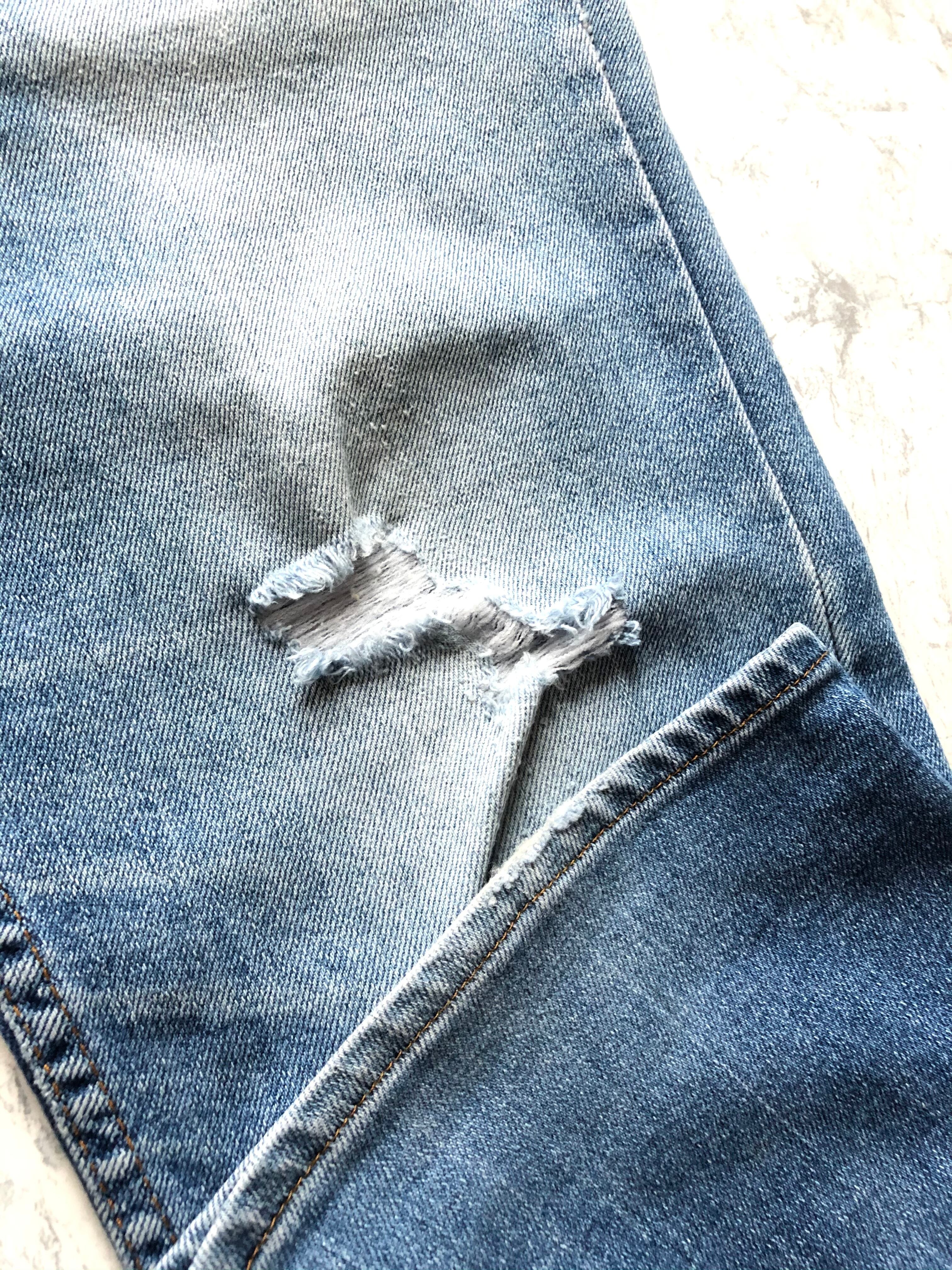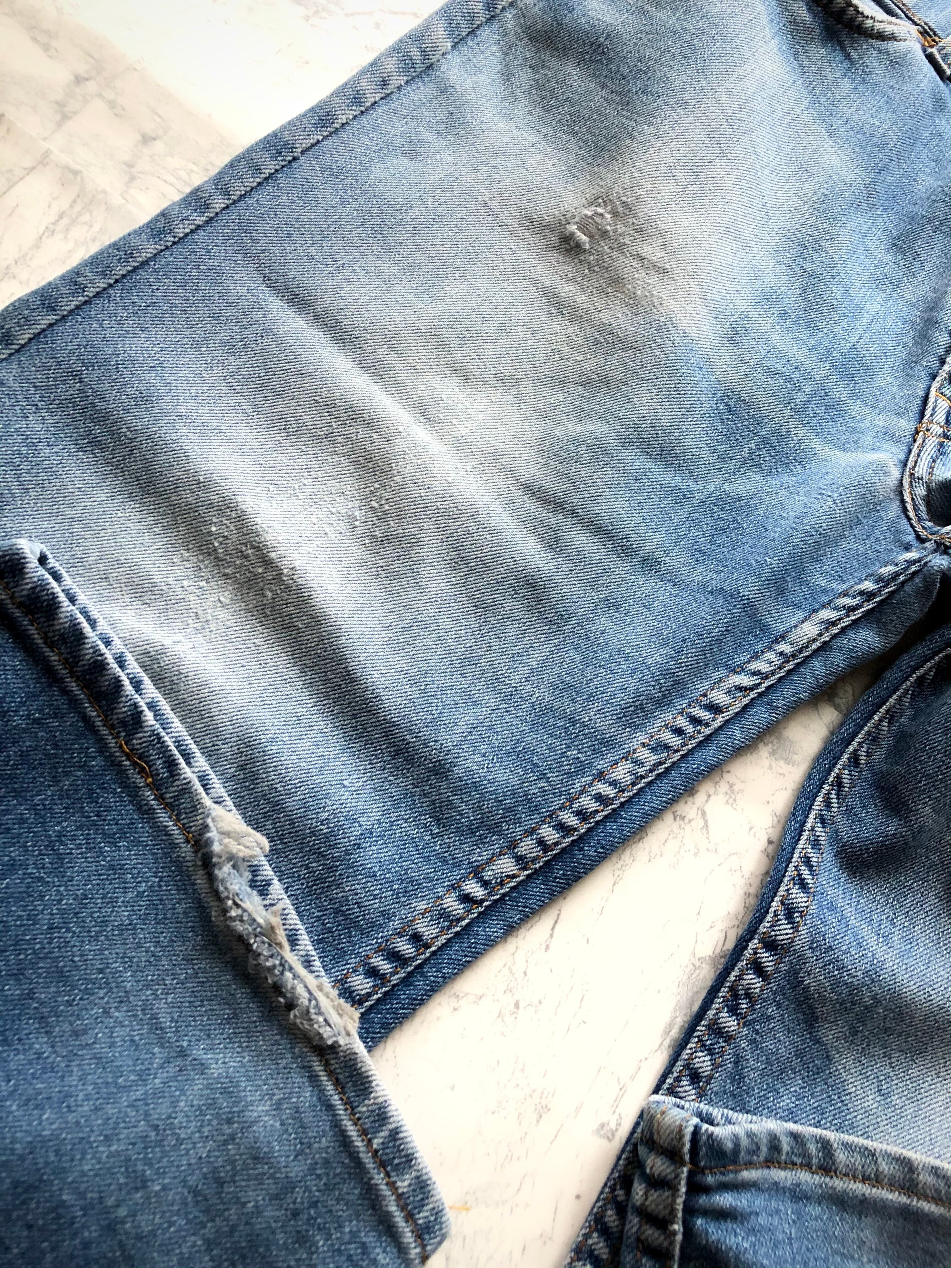 ビンテージならではのやや使用感,細かいスレ,色落ち,太腿に破れダメージ,裾にスレ.裂け等の小ダメージがありますが、アタリや色落ちはビンテージらしい良い雰囲気のダメージデニムです。