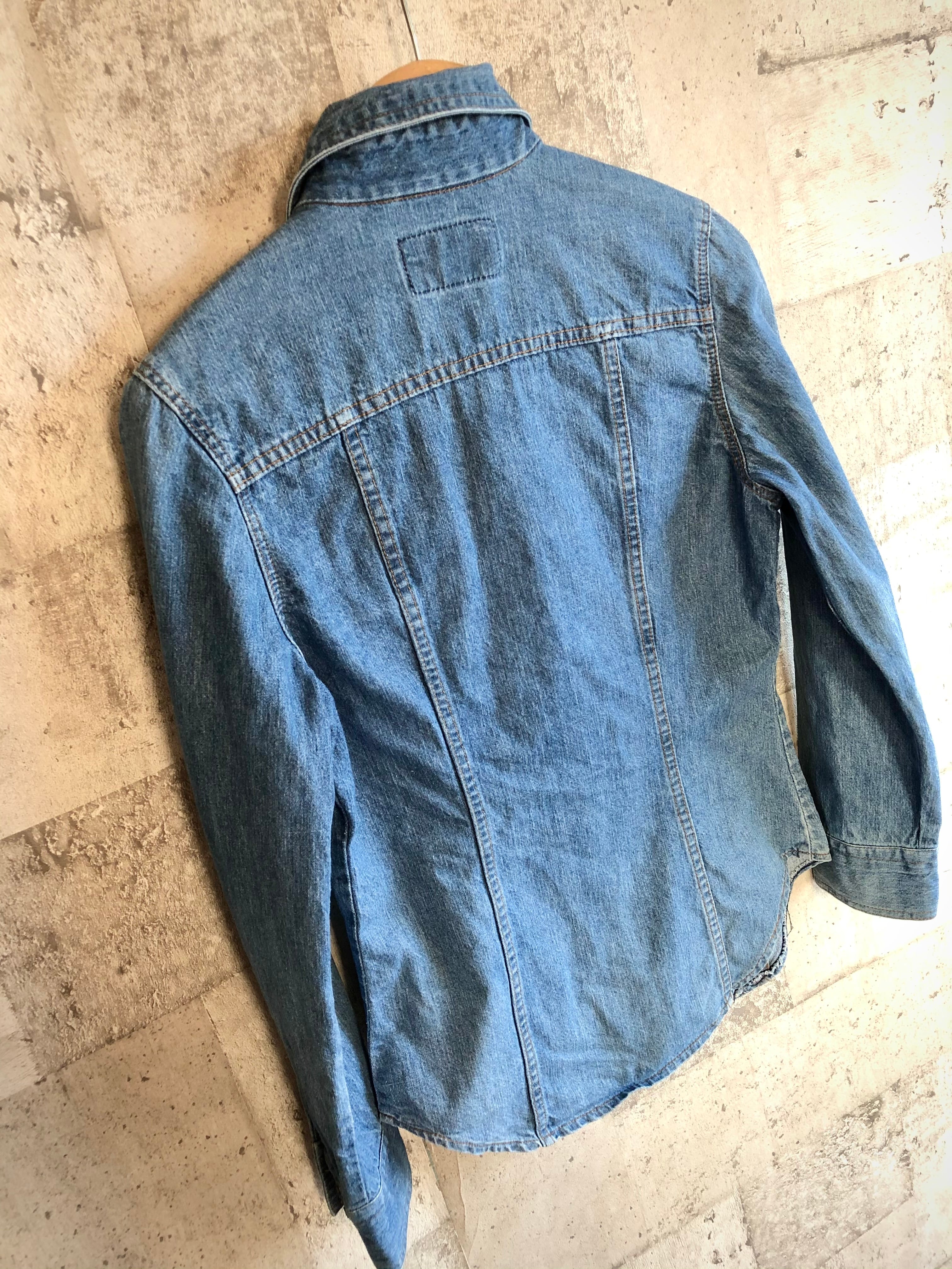 サイズ表記はMとなっておりますが恐らくボーイズ辺りでしょうか、アームも細く全体的なシルエットは非常にタイトな印象ですので、スタイリッシュに着用したい方にはピッタリなデニムシャツだと思います。