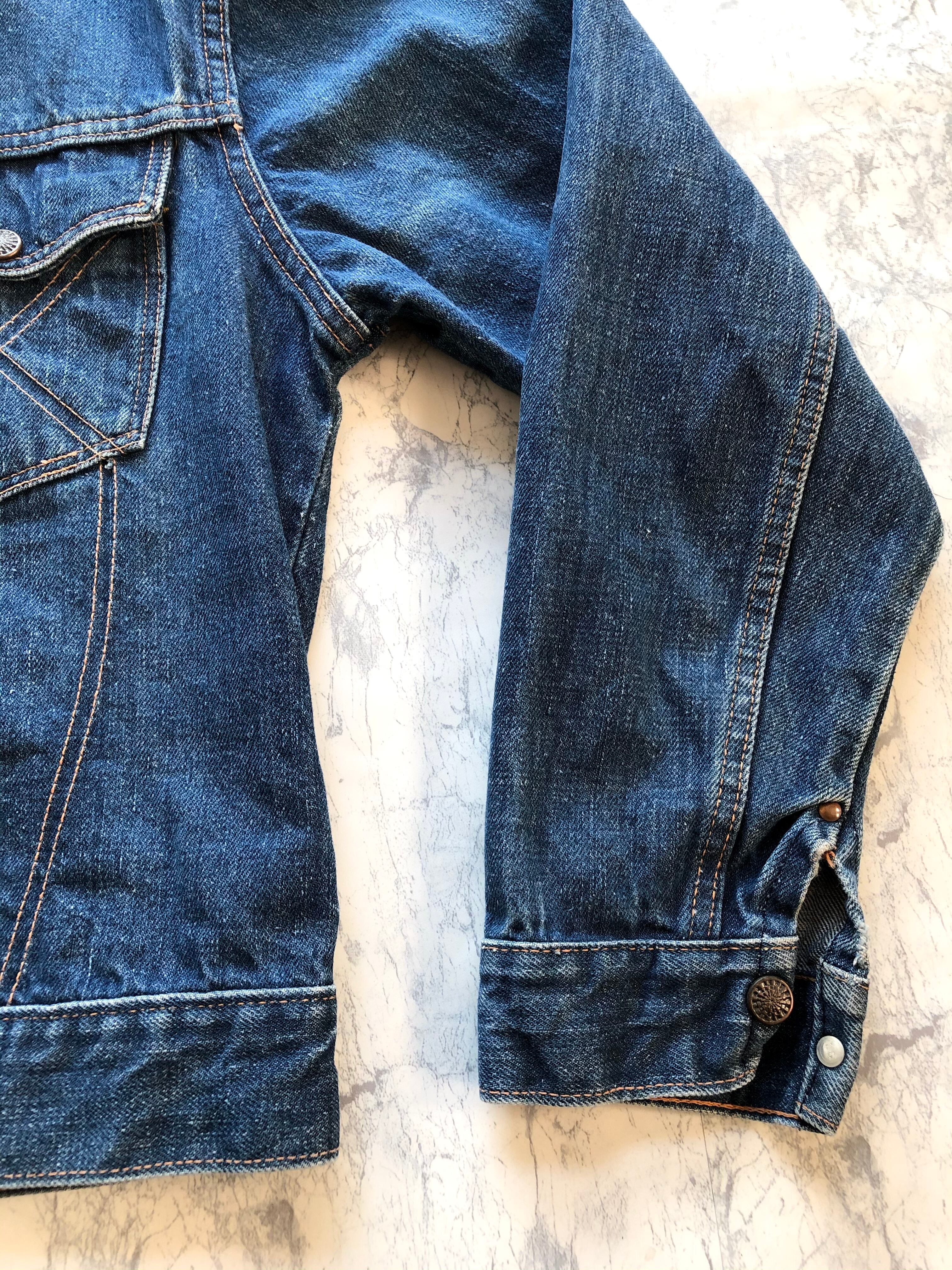 全体的な印象としてはLEVI’Sの3rdを彷彿とさせるデザインとなっており織りムラや綺麗に縦落ちの入ったハリコシのある少しライトなデニム生地に耳付きと嬉しいポイントのデニムジャケット。