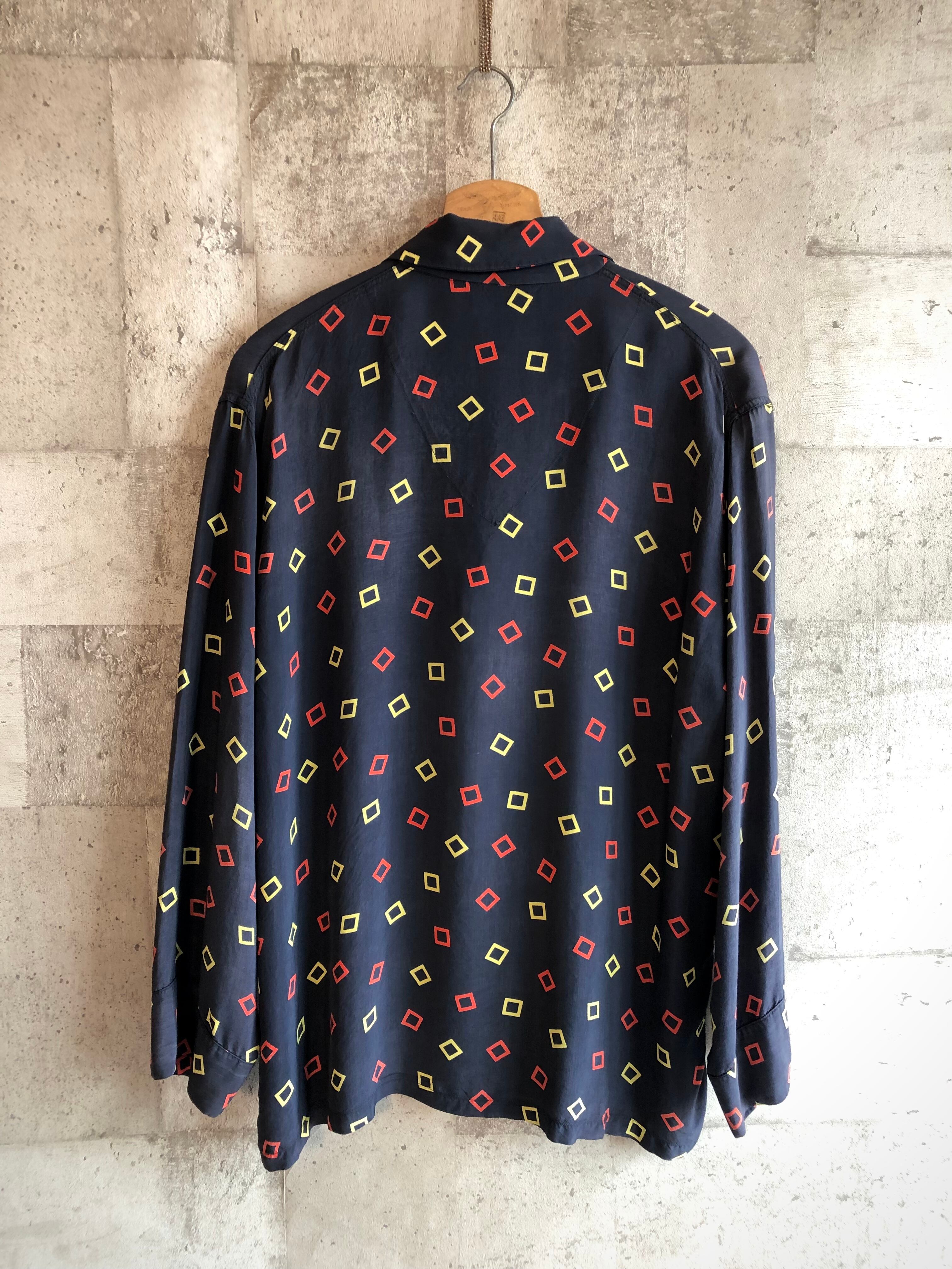濃紺なダークネイビーをベースとし赤や黄色でデザインされた三角&四角を散りばめた当時物らしいアトミックパターン、フロントの少し大きめなシェルボタンや筒袖,脇下ガゼットや首裏の二層生地等からパジャマタイプのモデルとなっておりますが、着用すると長袖アロハシャツと全く変わらない雰囲気となっております。