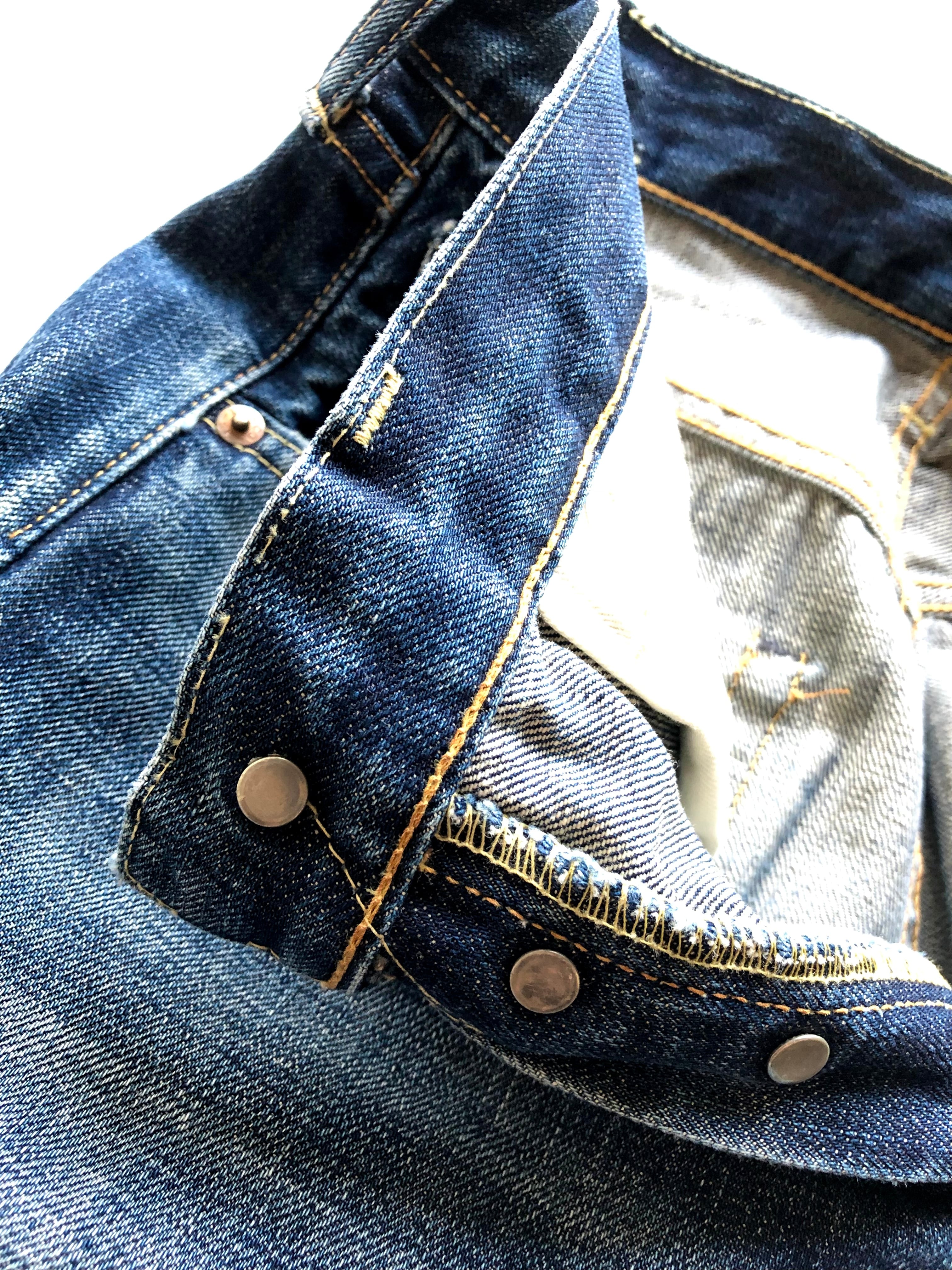 ビンテージのディテールでお馴染み不均等のBig-Eタブ,ウエストやポケットのシングルにフロントVステッチ,細幅セルビッジにイエローステッチ多数に加えこの時期のみに確認できるボタン裏の無刻印等々と当時さながらのディテール満載な仕上がり。