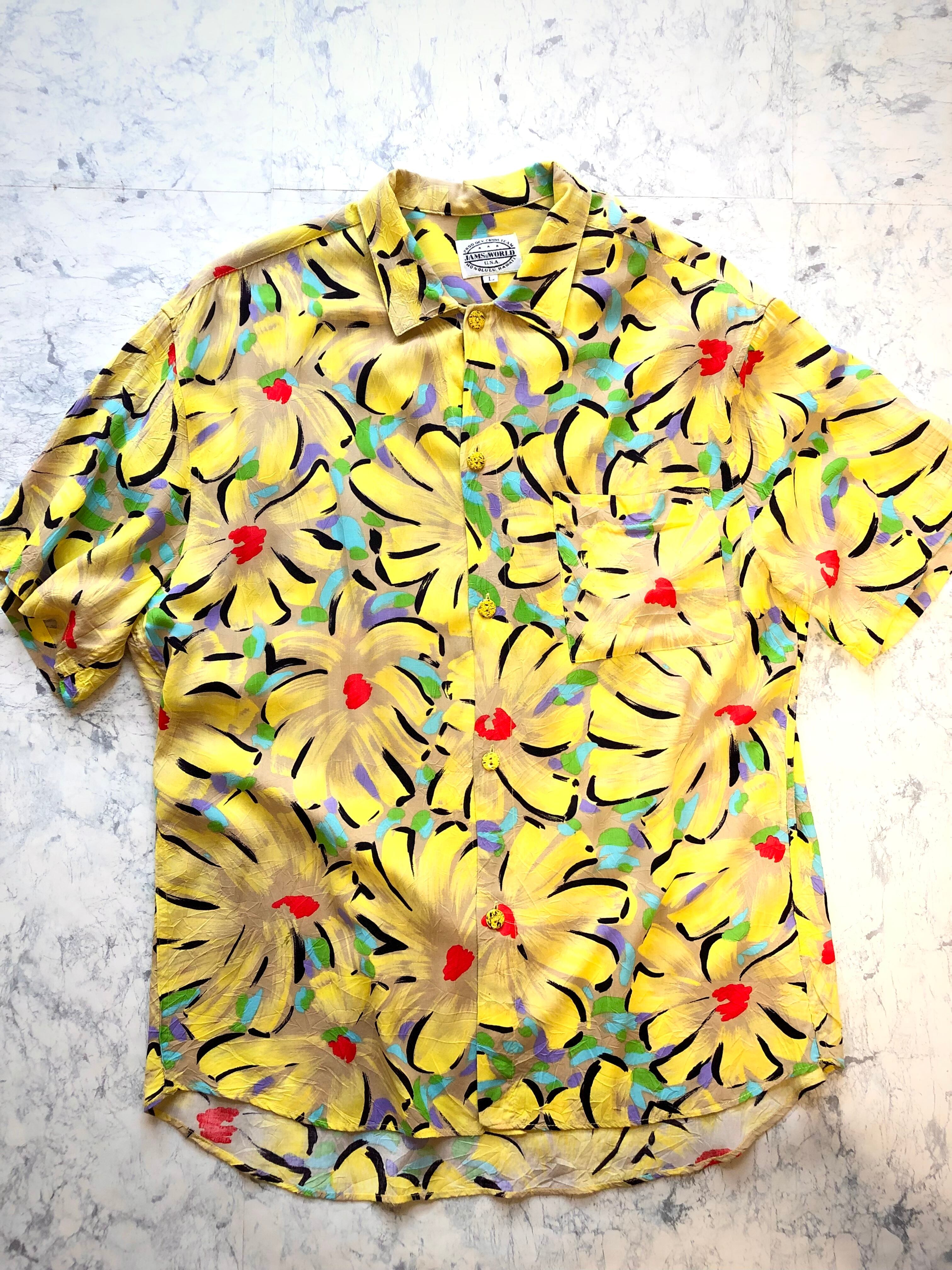 絶妙なタッチで描かれアメリカンポップアートのような印象をも感じられるグッドデザインなフラワープリント、イエローベースのカラーリングに独自のマーブルボタンがバランス良くマッチした通好みな1枚だと思います。