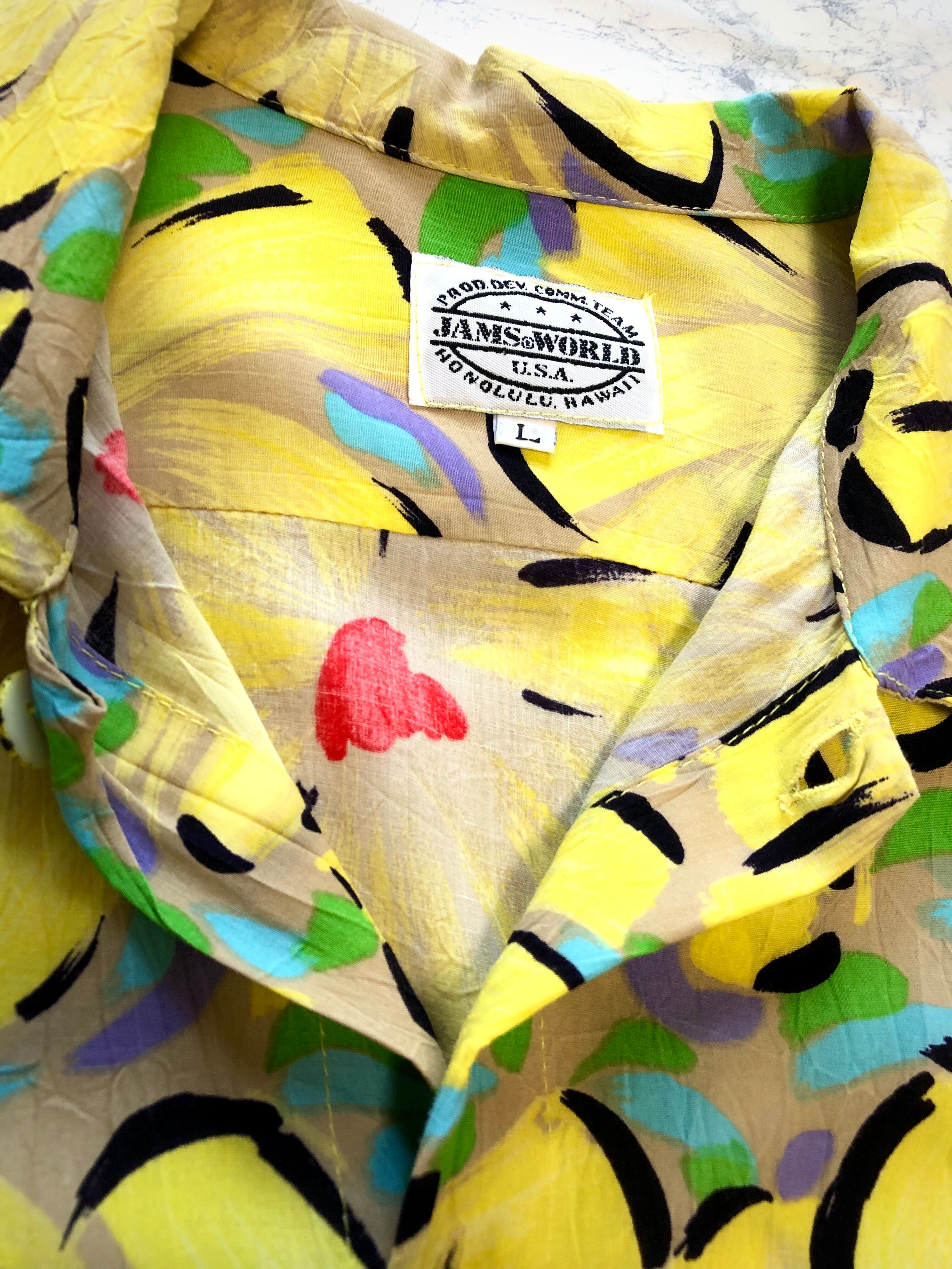 80s〜 MADE IN HAWAII “ JAMS WORLD ” TROPICAL PATTERN HAWAIIAN SHIRT OLD VINTAGE 。