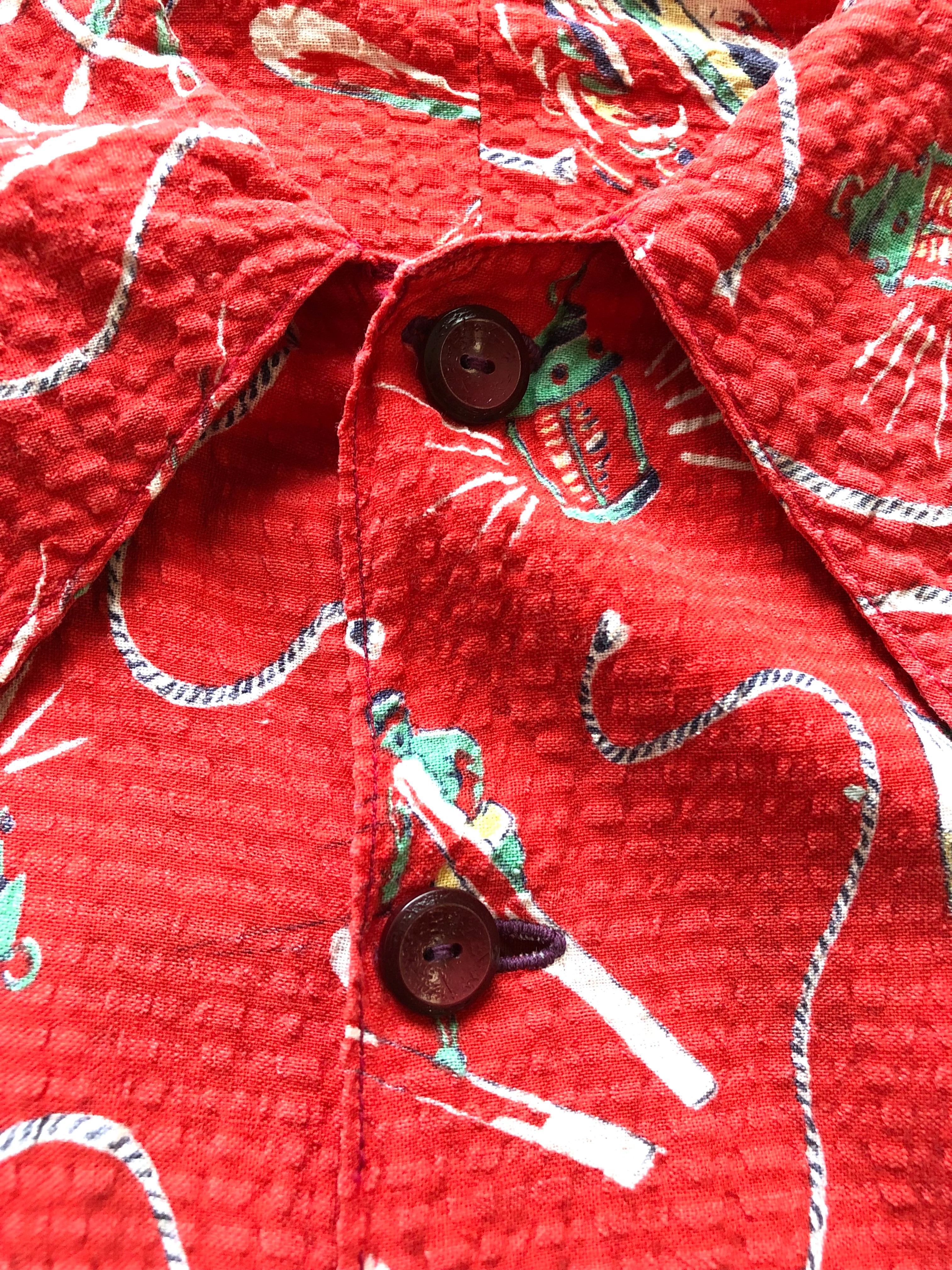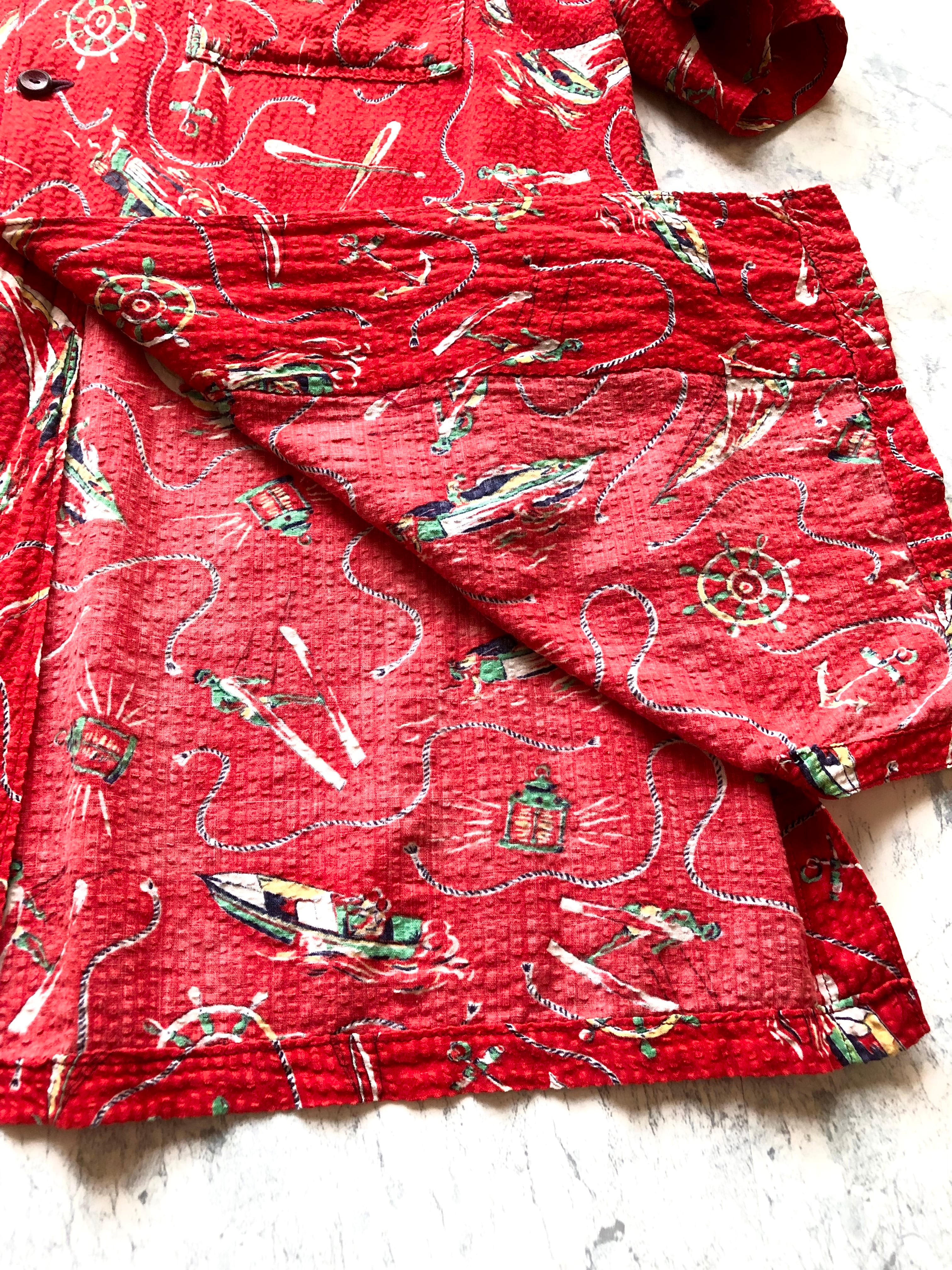 ヨットやボート,スキーヤー,ランタン等がランダムに描かれたクラシックな印象のグッドデザイン、生地は清涼感のあるシアサッカー仕立てにロングポイント&ベークライトがマッチした当時物ならではの仕上がりです。