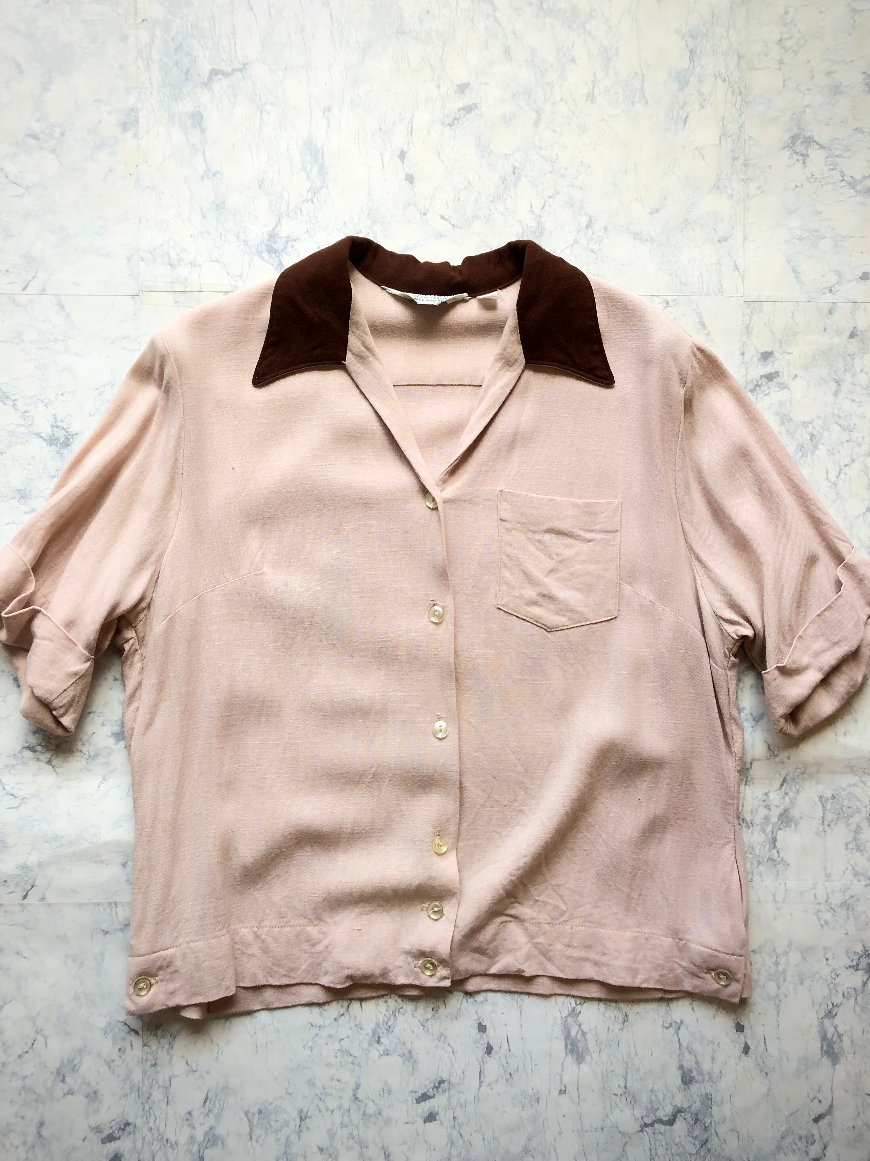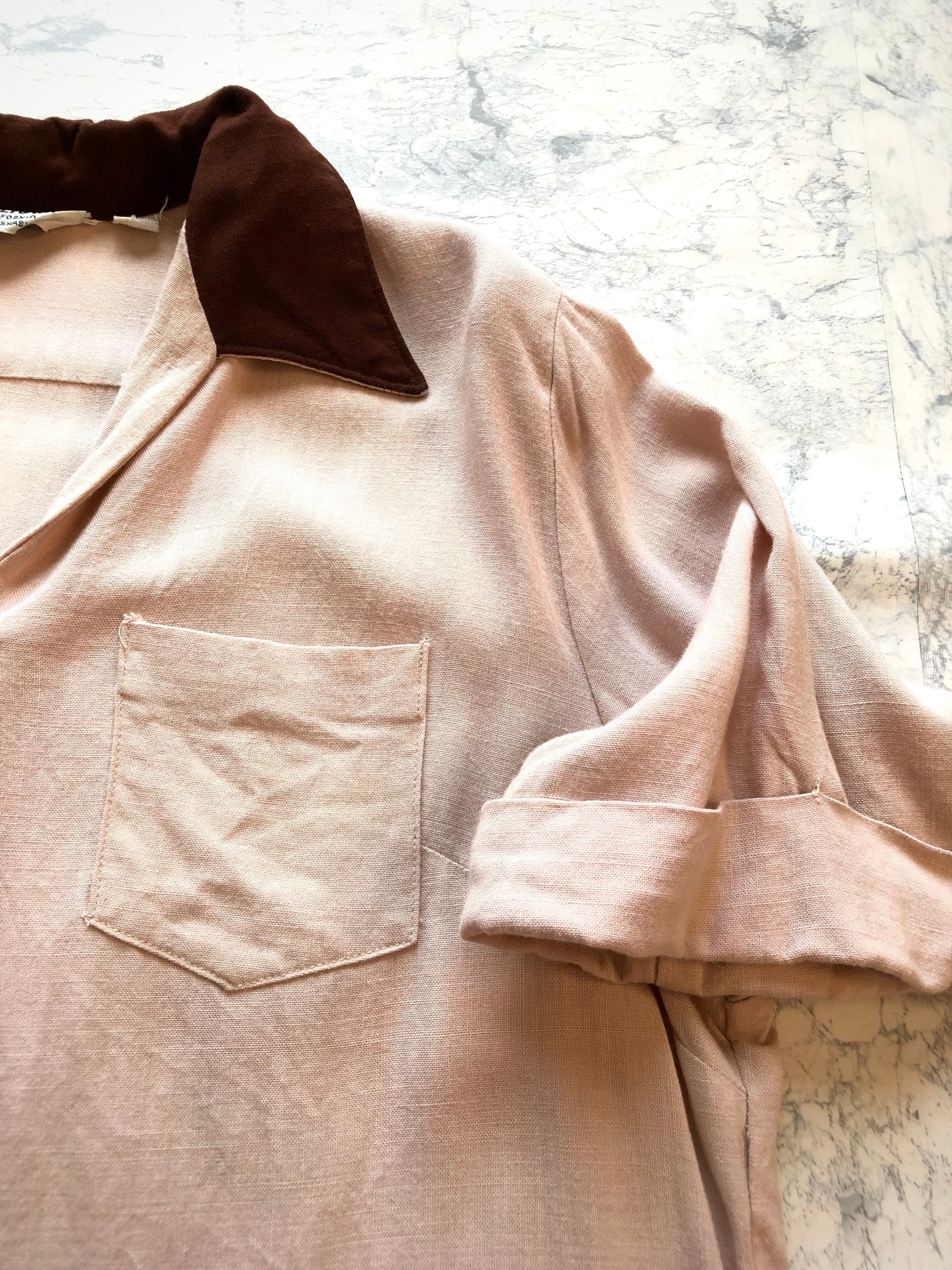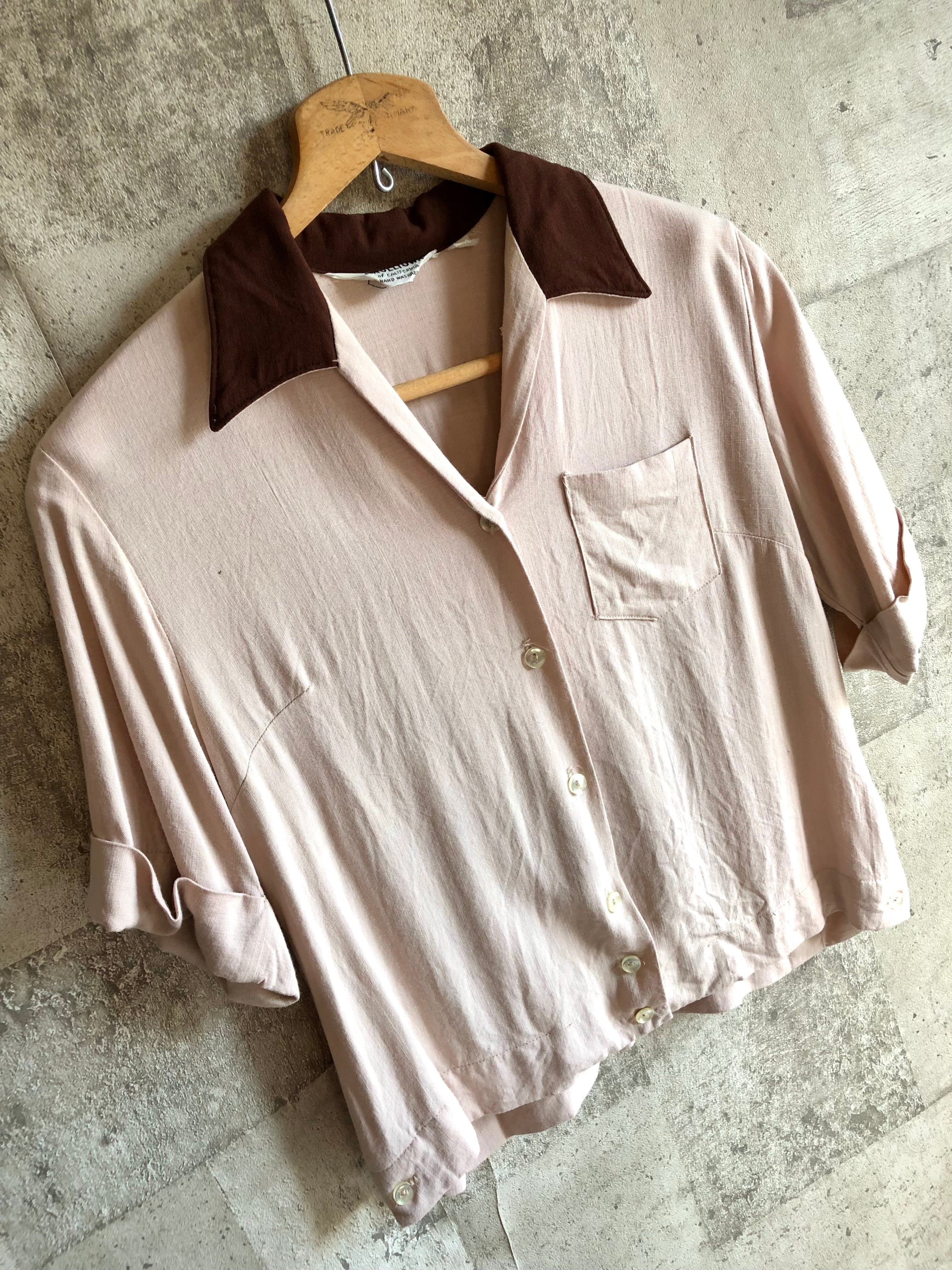 深めなVゾーンのオープンカラーにボックスシルエット,パッチポケットにサイドスリット&サイドのアクションプリーツとこの年代のボーリングシャツでは馴染みのディテールですが、やや珍しいピンクベージュのカラーリングにダークブラウンのカラーがアクセントとなった絶妙なツートンパターンの1枚です。