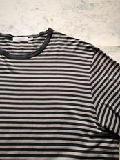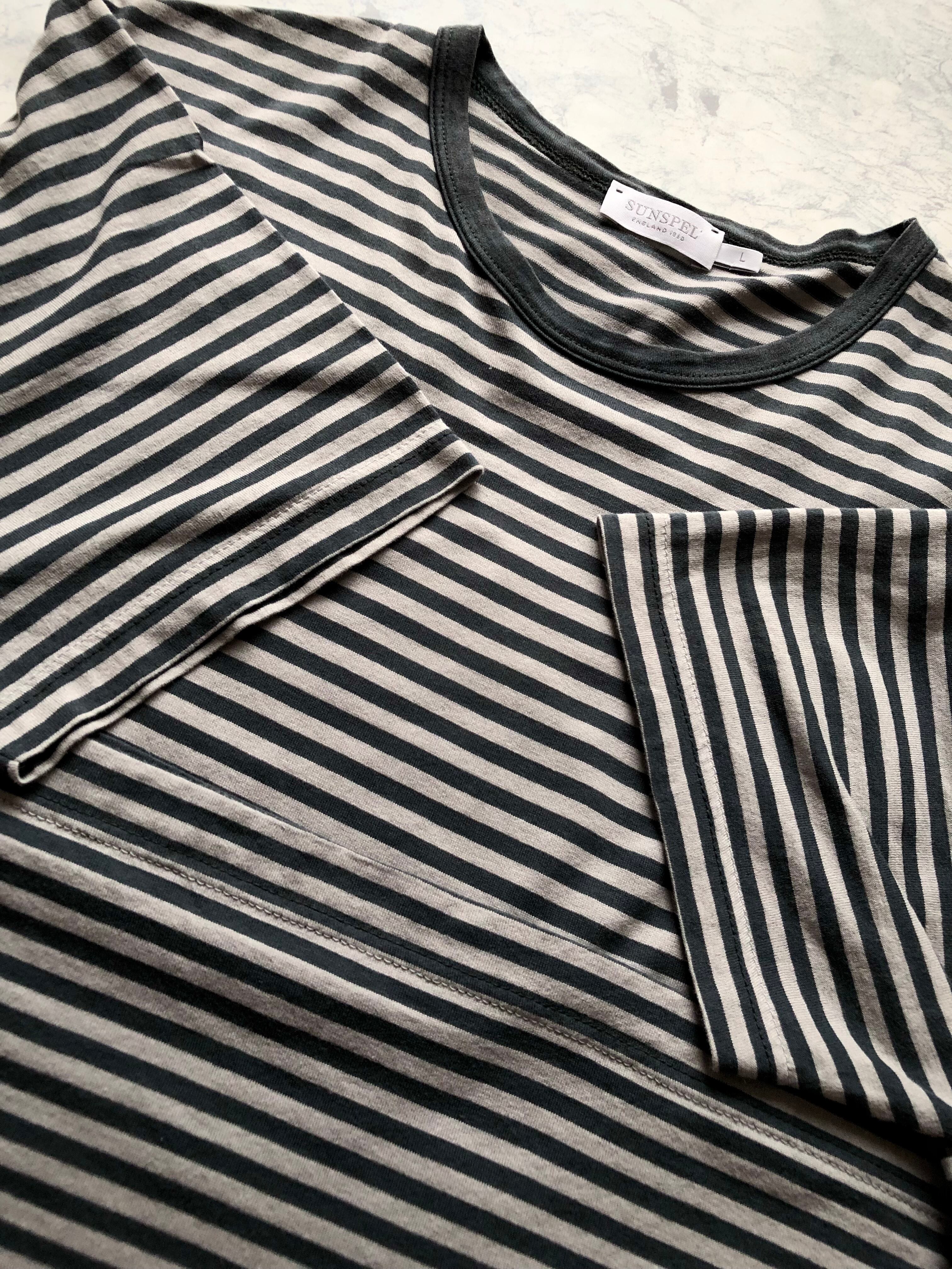 サンスペルの代名詞でもあるQ82.超長綿コットン仕立ての非常に上質なボーダーTシャツ、グレー×チャコール系グリーンの絶妙なカラーリングで英国らしいクラシカルな雰囲気。