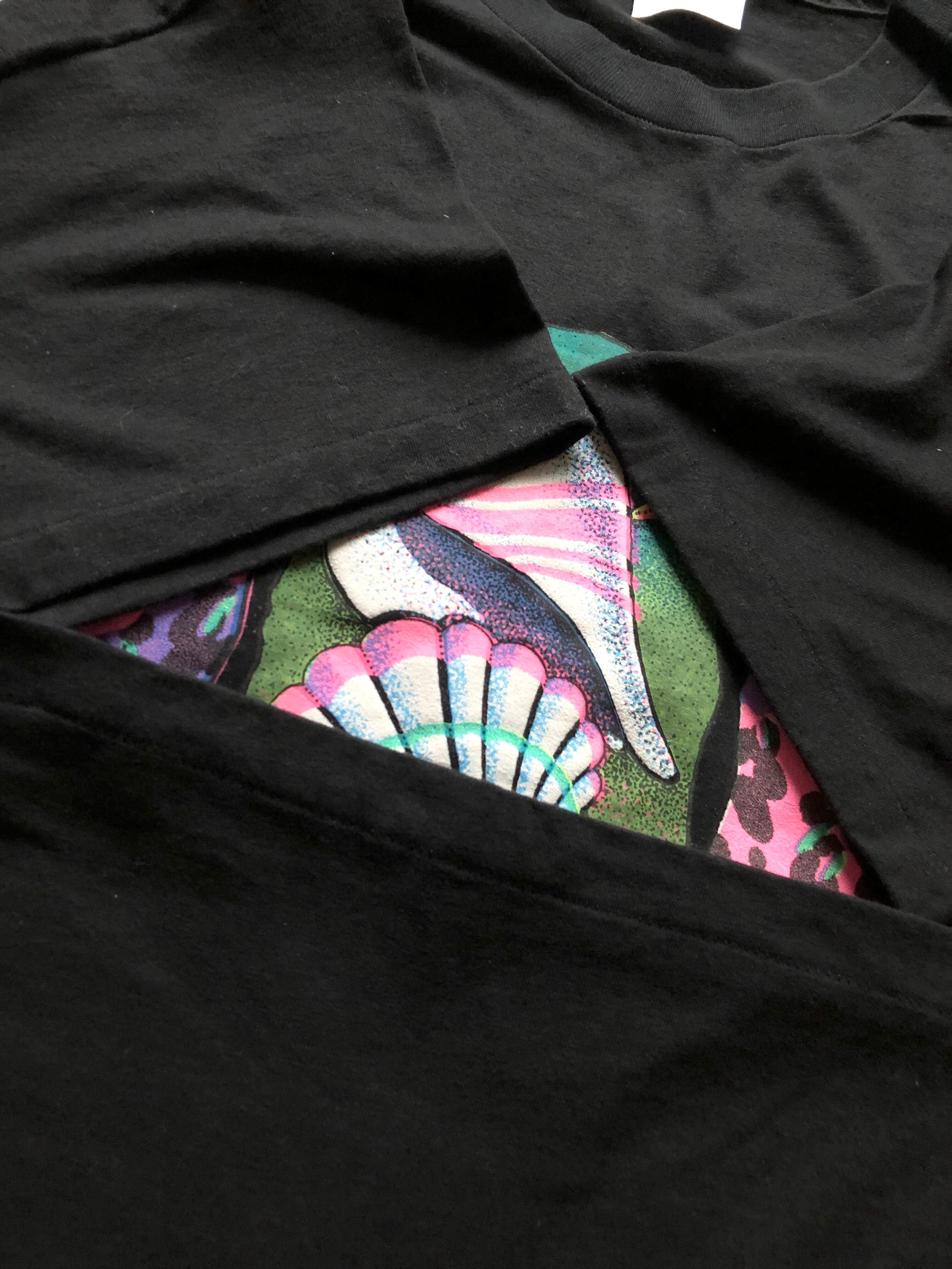 ブラックボディにピンクやパープルのネオンカラーにて描かれた貝殻デザインで、色調バランスやコントラストも良くまるでアート作品のようなオールドらしいグッドデザインな1枚です。