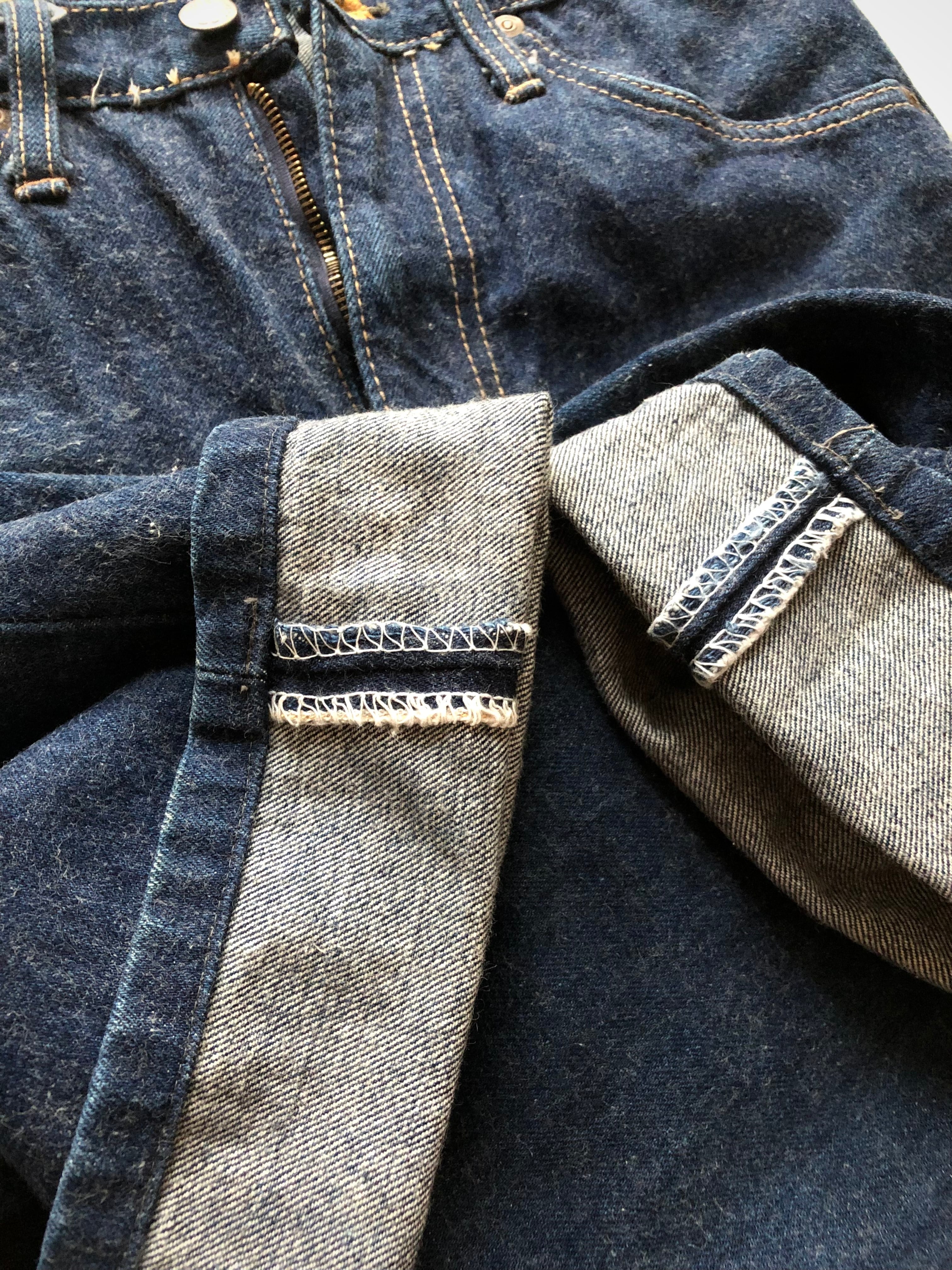 恐らく60年代頃のコーンミルズファブリック仕立てとなっており、生地はハリコシのある右綾デニム生地にロックミシンにてステッチが施されていますが左側のみハッキリと黄色耳が確認できるレアな片耳モデルとなった希少種シリーズです。