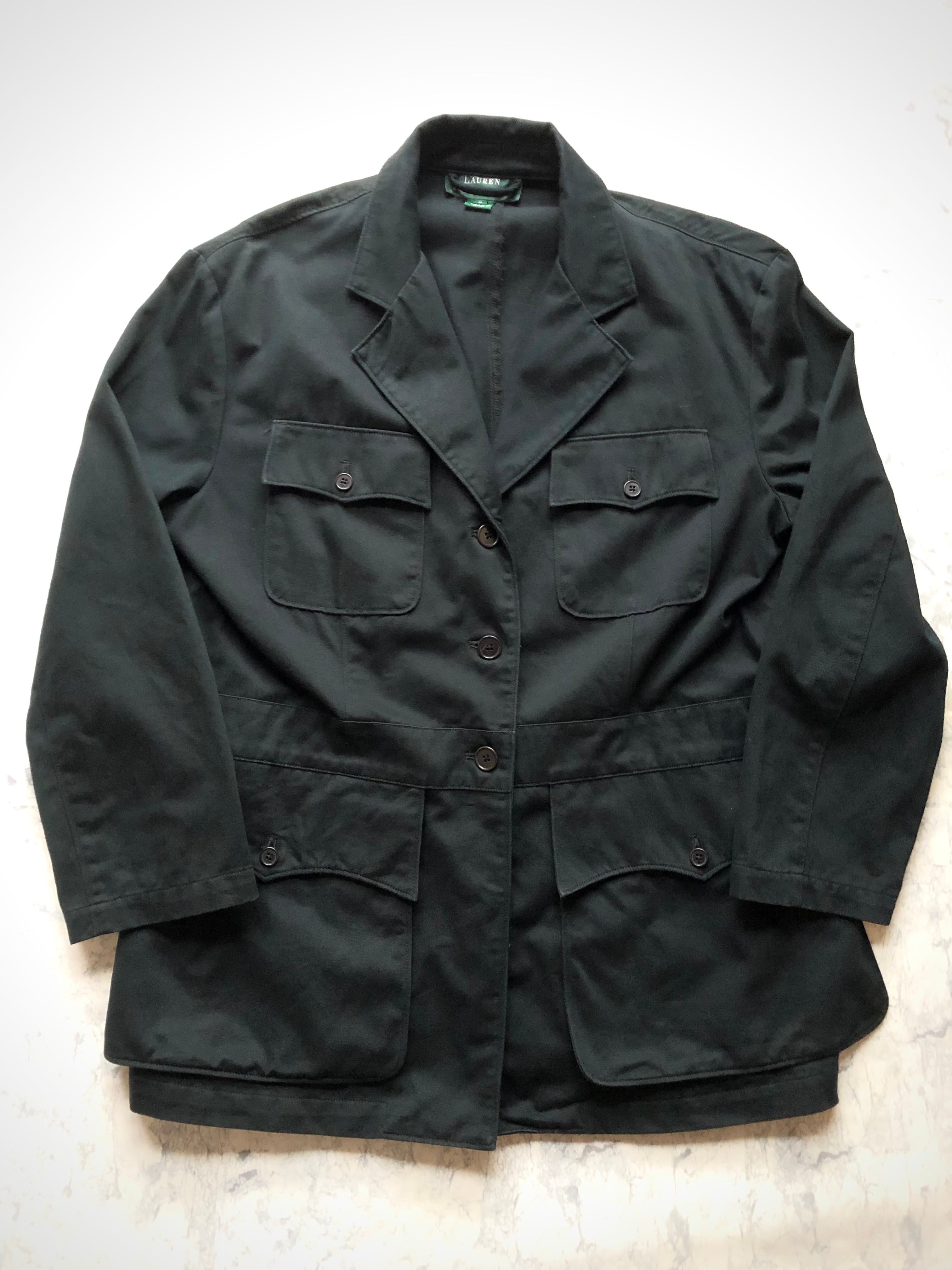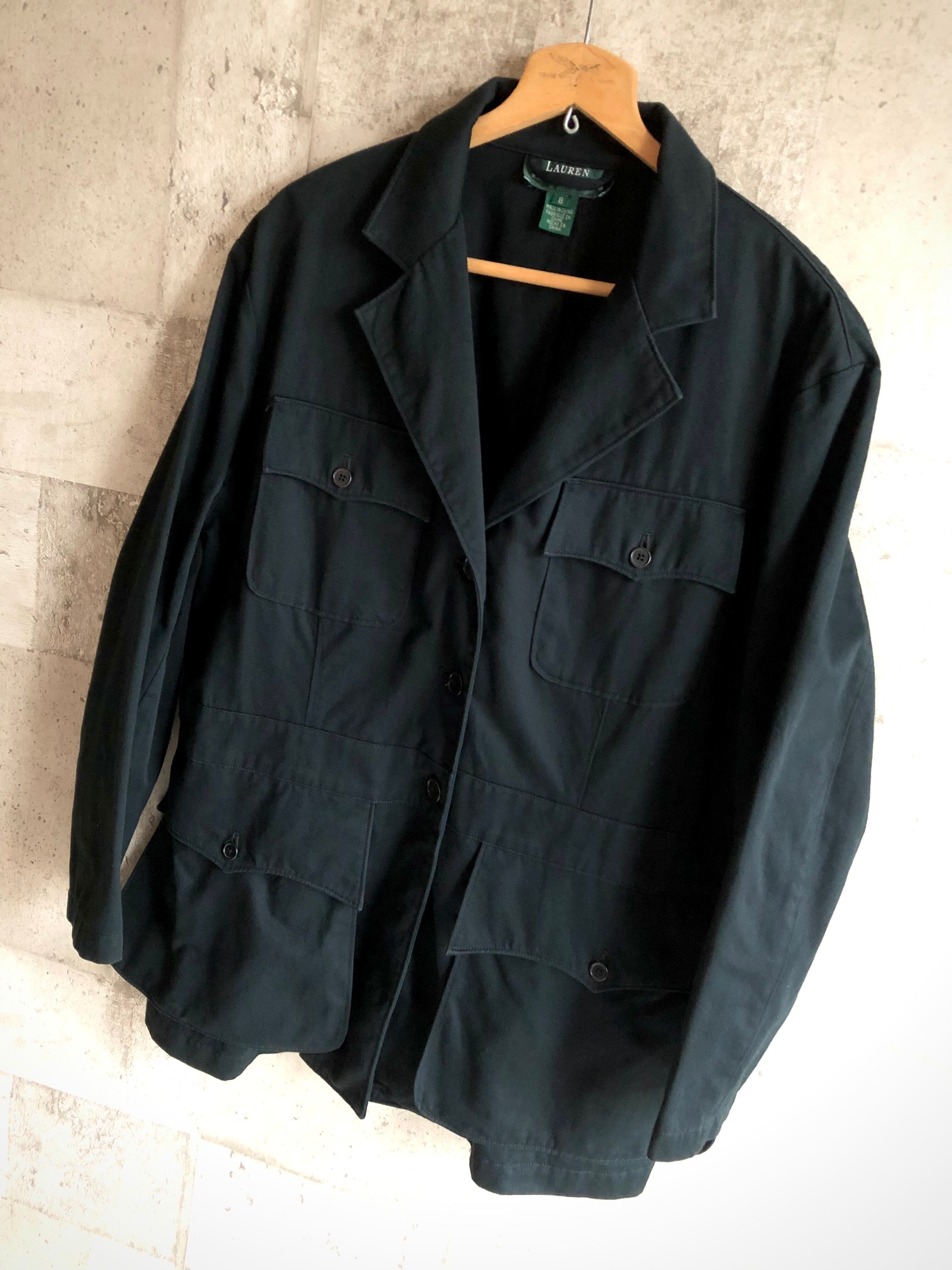 ビンテージ市場でもコアなファンに定評のあるクラシックなサファリジャケット、フロントのフラップ付き4ポケットにマチ付きの大きなデザインが特徴的でもあり、襟元ラペルの開き具合やオールブラックのカラーリングが相俟ってラルフローレンらしい上品さも感じられるエレガントなサファリジャケットです。