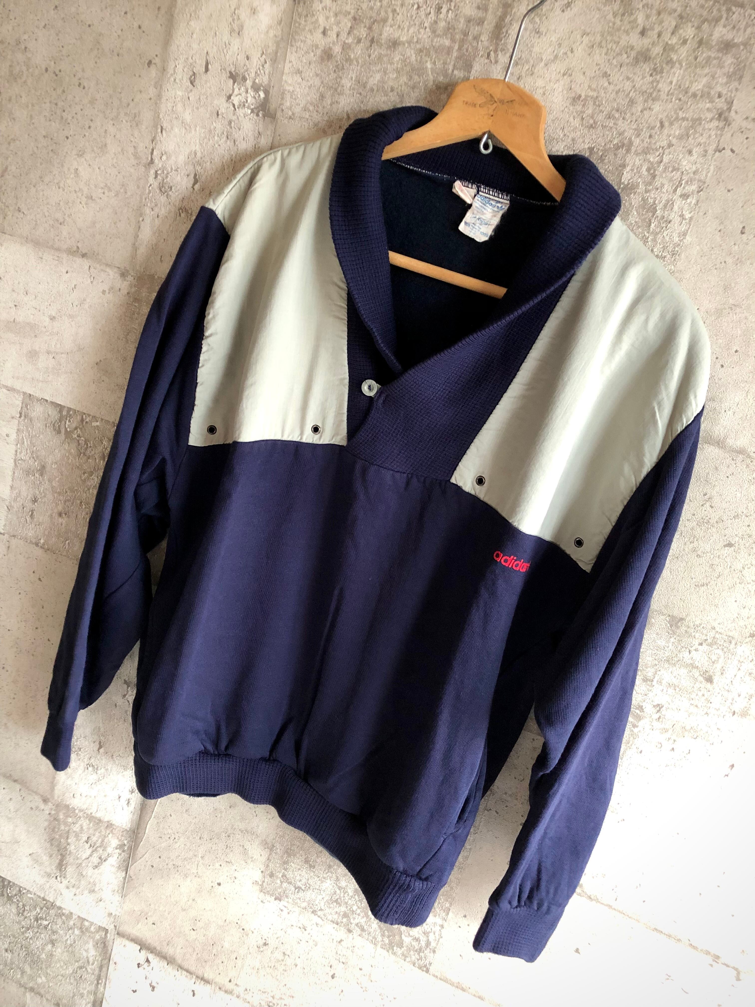 ADIDASとしては比較的珍しいショールカラーのプルオーバータイプ、絶妙な首元の開き具合に胸&バックにはパネル調の別生地があしらわれたクラシカルなツートンパターンとなっております。