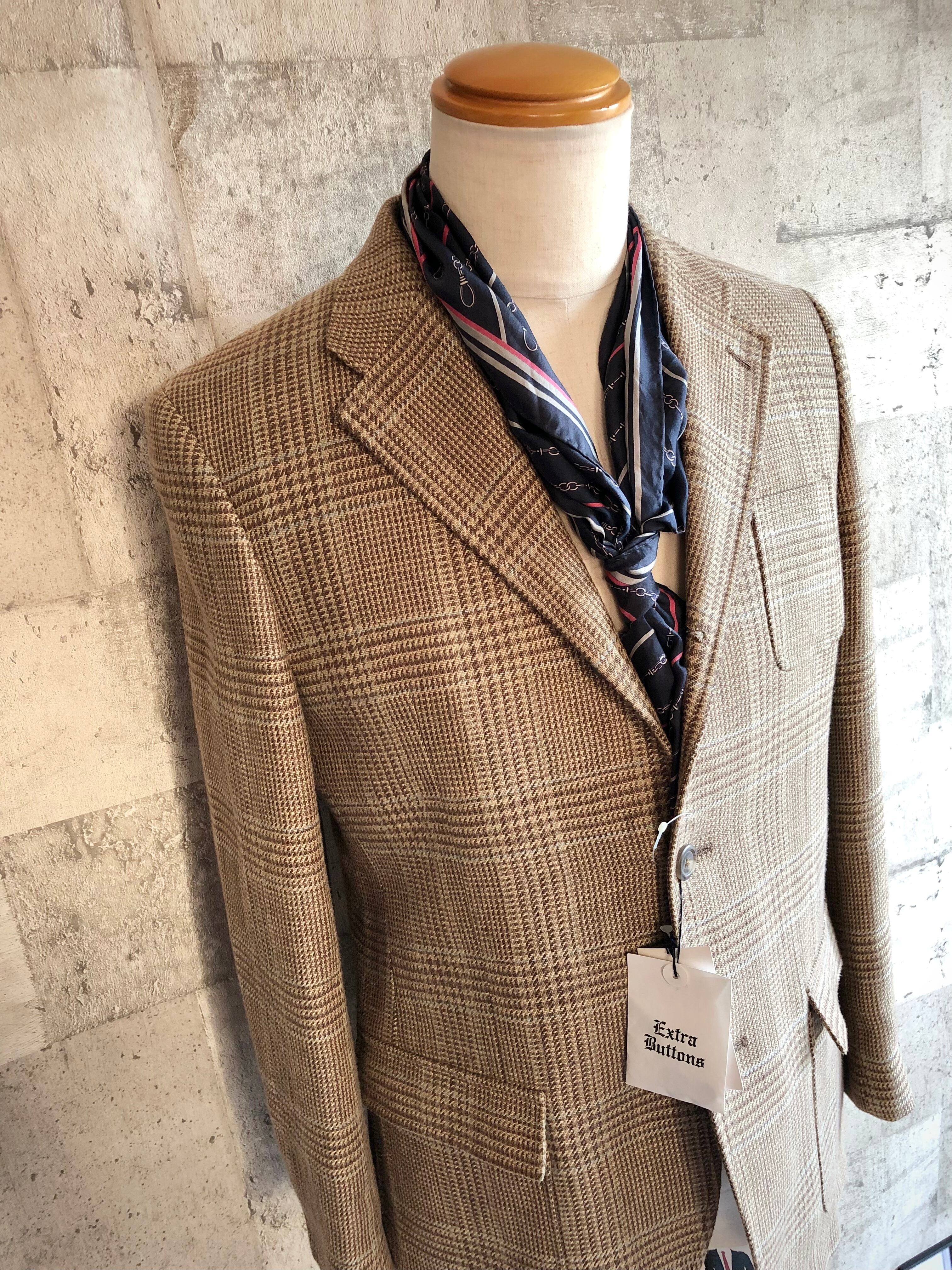 全体的に落ち着きのあるブラウン系のカラーリングで纏められツイードのような風合いにも見えるしっかりとしたリネン生地仕立て、シルエットも良く日本人向けのスッキリとした印象で非常に品格のあるジャケットです。