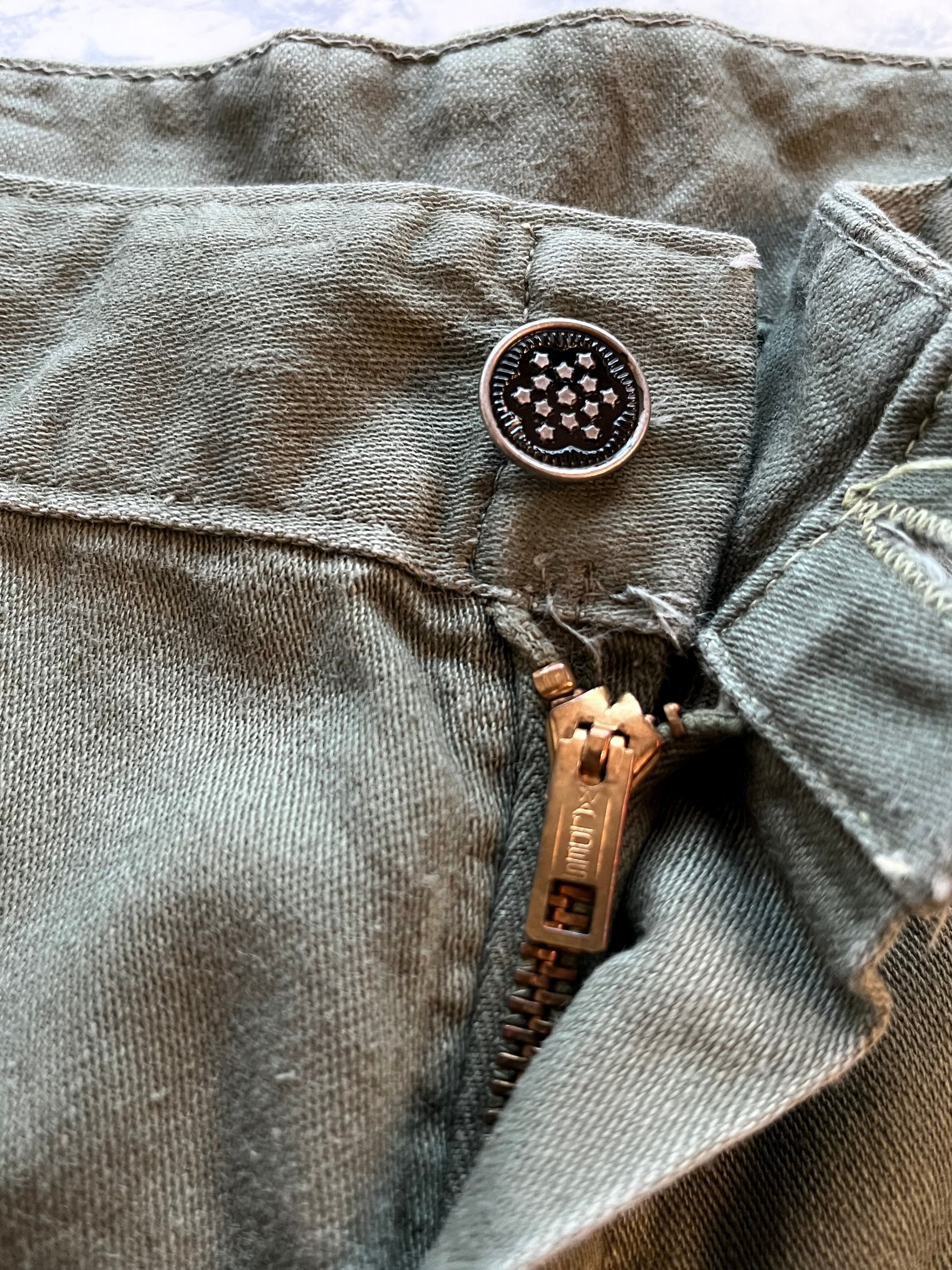 全体的なデザインはM-43をそのまま採用し後のM-47から登場するコットンサテンをベースにWALDESのカムロックを完備したジッパーモデルとなっており、トップやサイドのボタンには黒塗り打込み13スターボタン等とレアなディティールが垣間見える珍しいミリタリーパンツ。