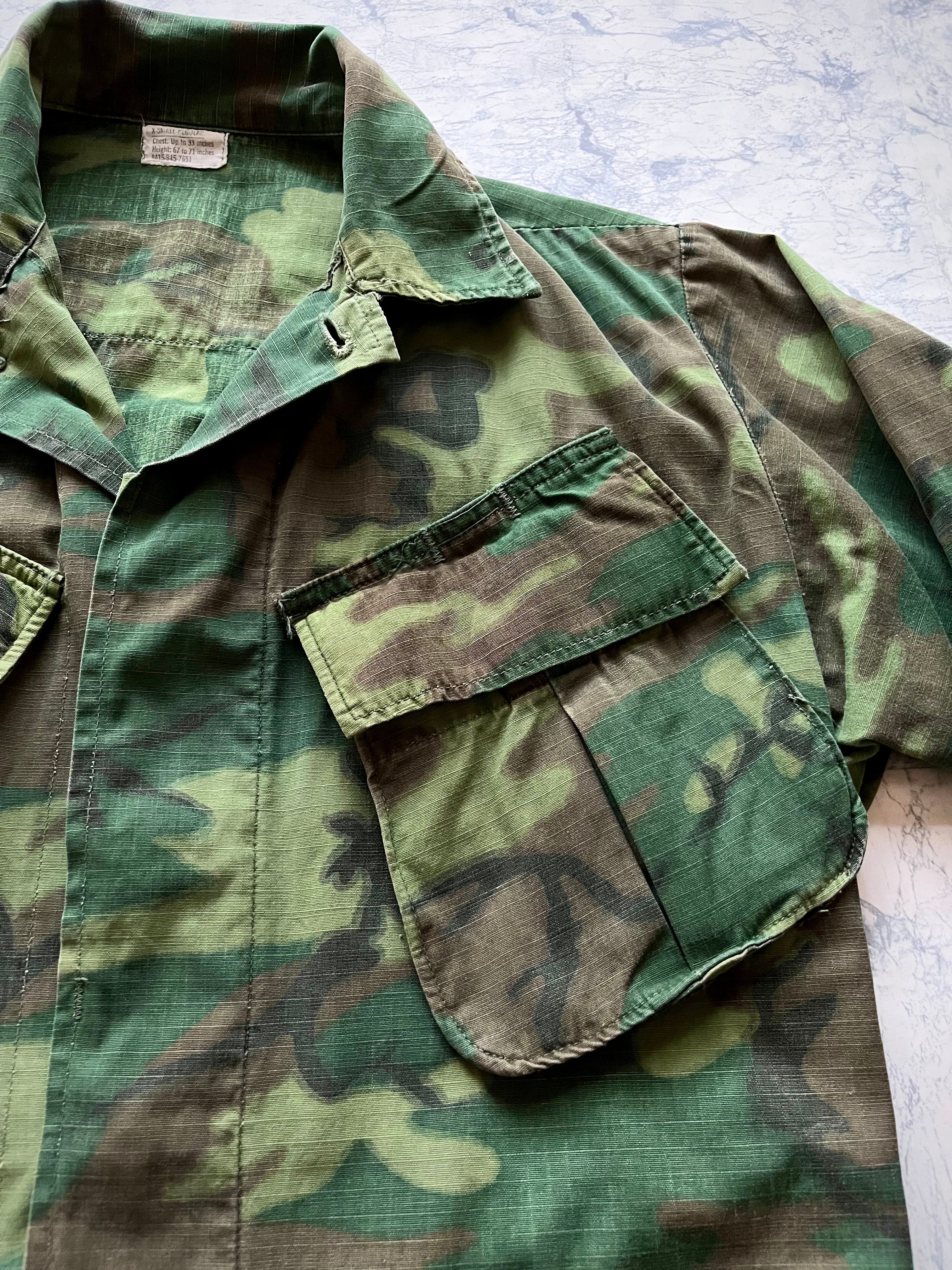 1960年代〜,ベトナム戦時において採用が開始されたコットンポプリン素材の熱帯地用野戦服として限られた期間のみに存在する《通称ジャングルファティーグ》、稀に1st.2ndでも確認されておりますが一般的に3rd〜登場したとされているカモフラージュパターン“ERDL”のグリーンリーフを纏った4thタイプのVINTAGE。
